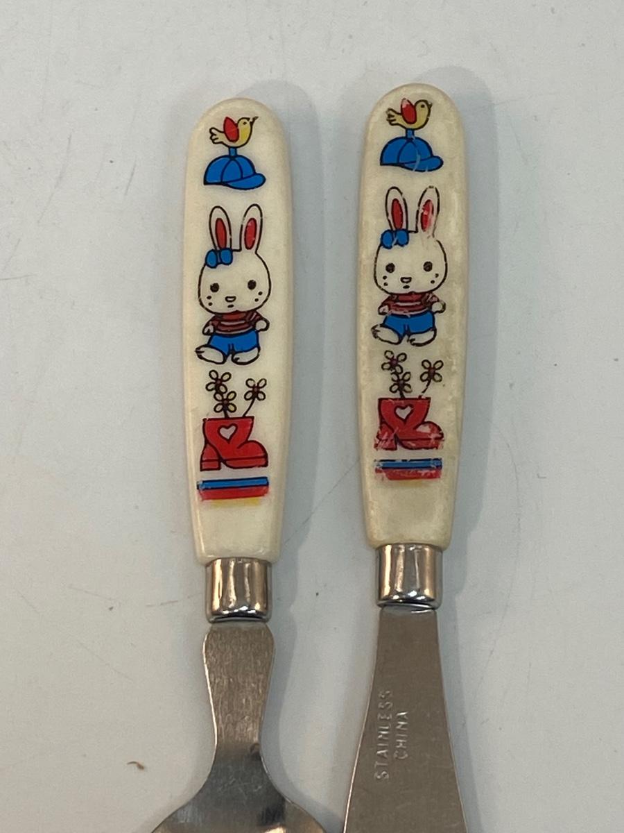Pair of Vintage Child's Toddlers Eating Utensils Cute Rabbit Handles Spoon & Knife