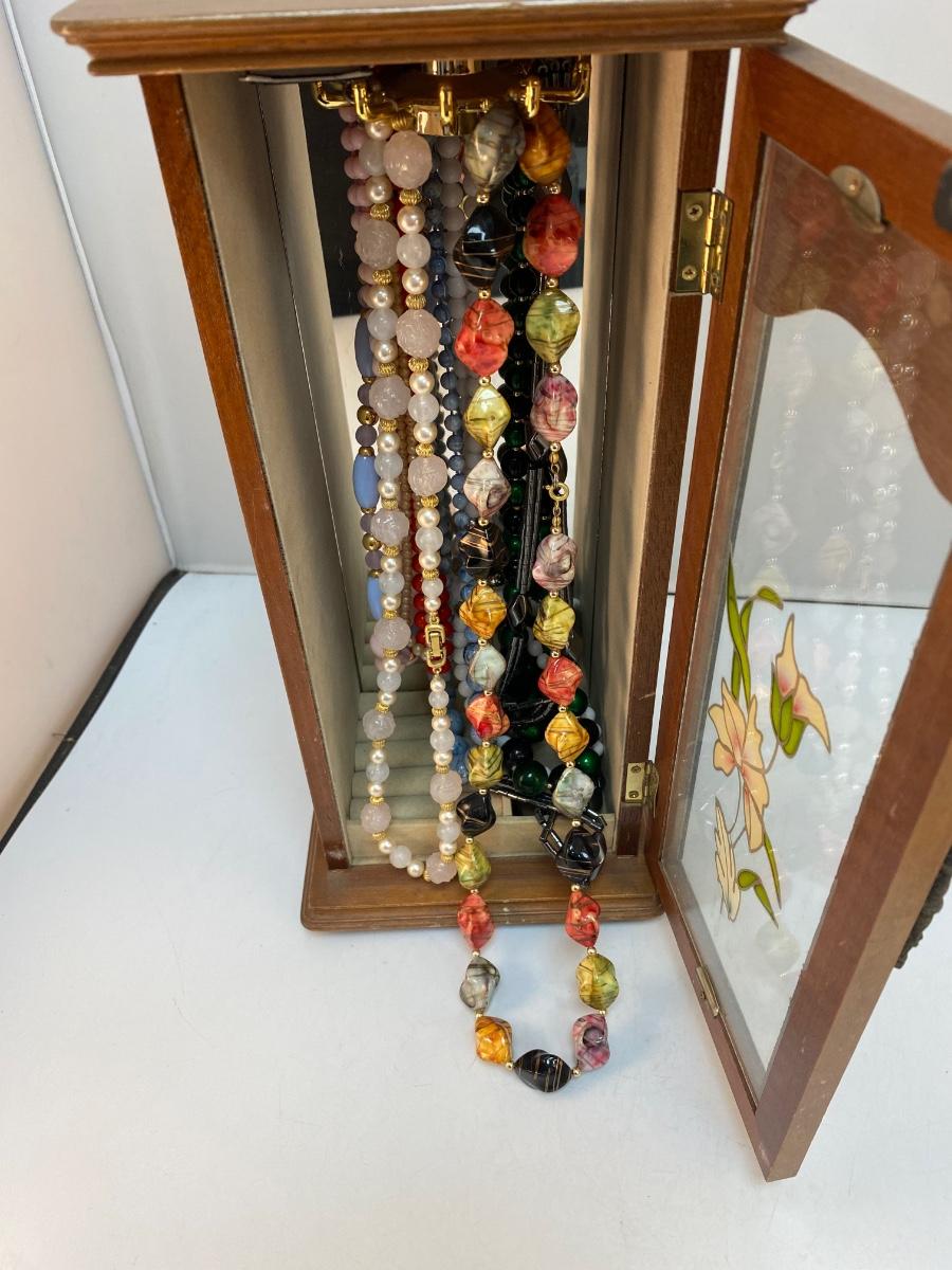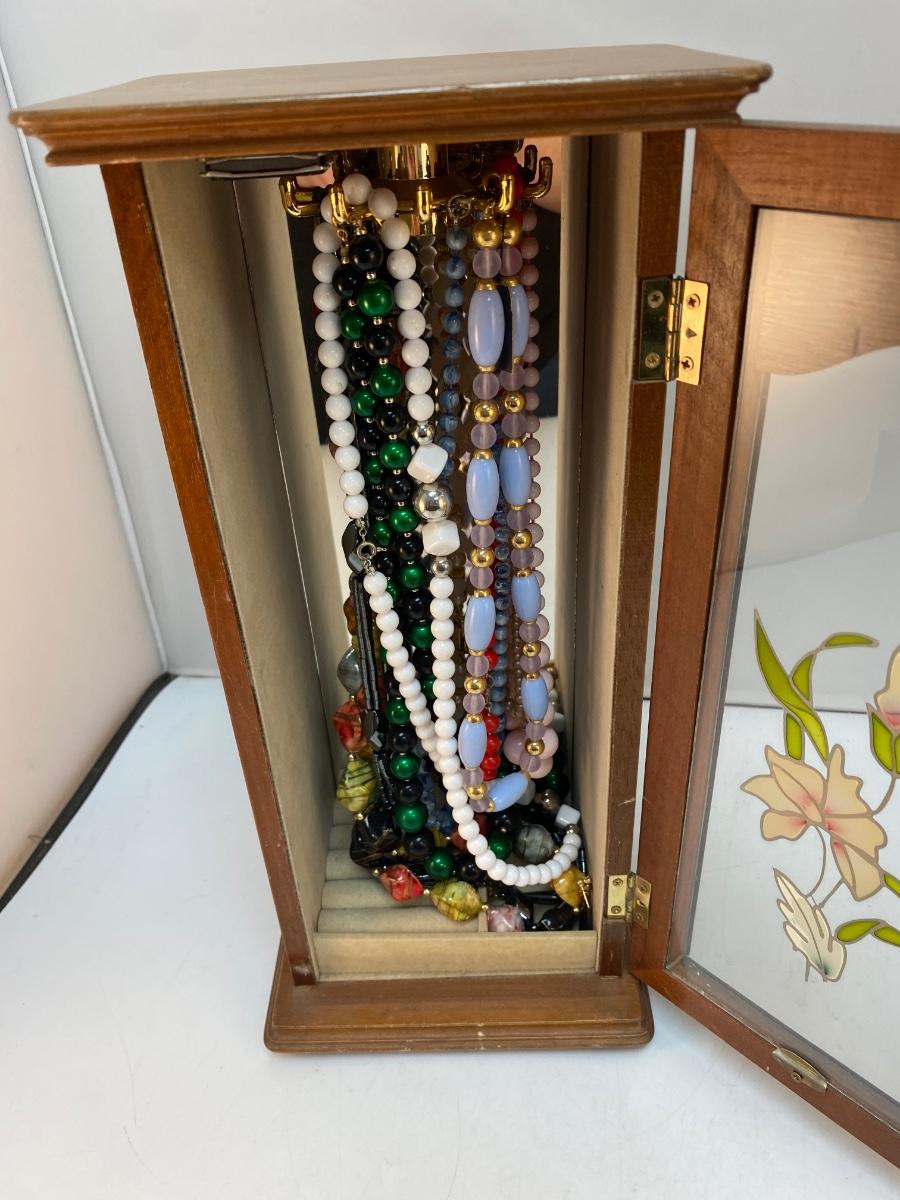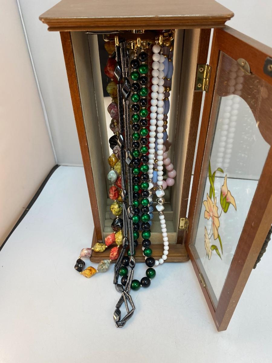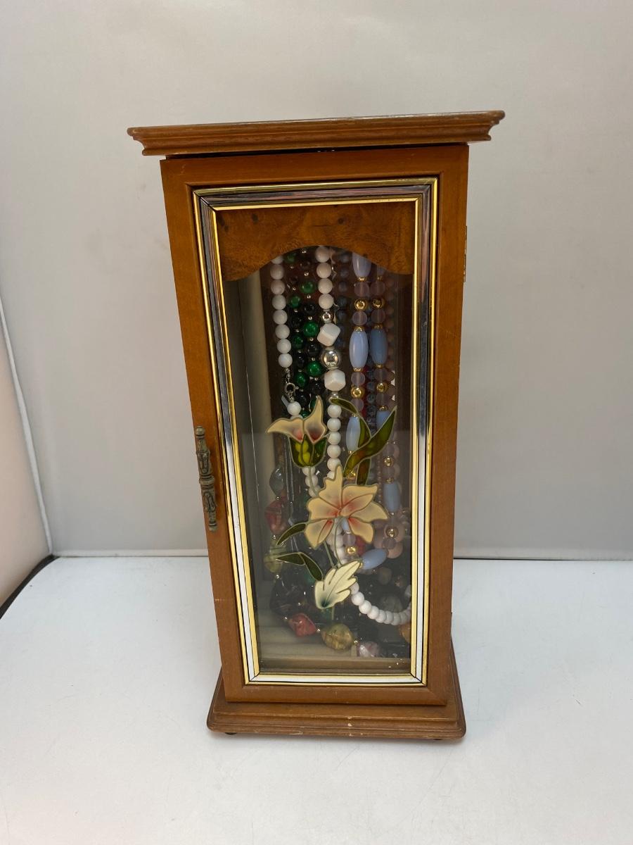 Vintage Retro Tall Slender Jewelry Box with Fashion Necklaces Included. In good condition. Glass door panel with flower design. Turn hook rack inside for holding necklaces and small storage at bottom for rings and earrings. Comes with a mixed variety of beaded fashion necklaces. About 14" tall.
