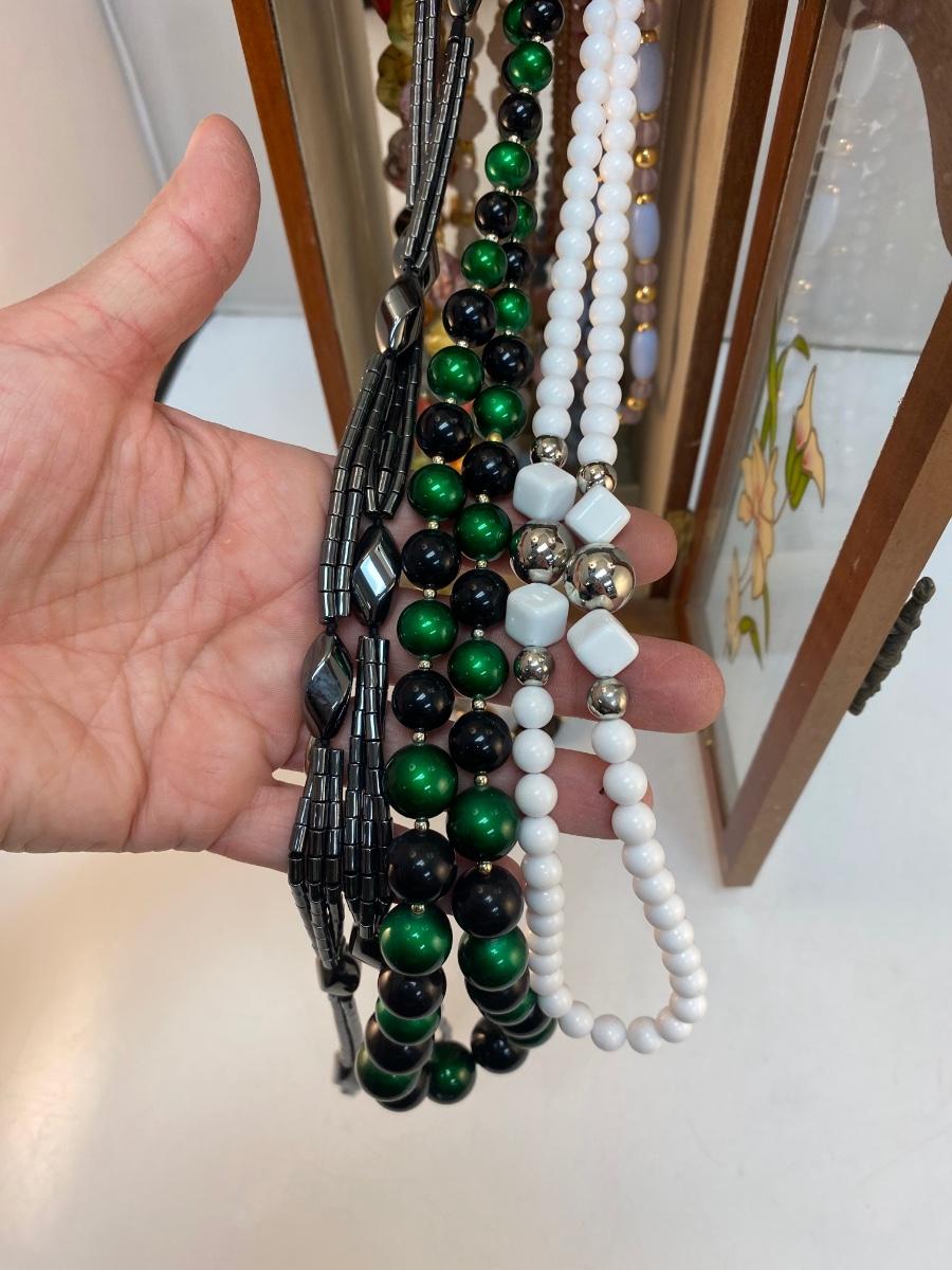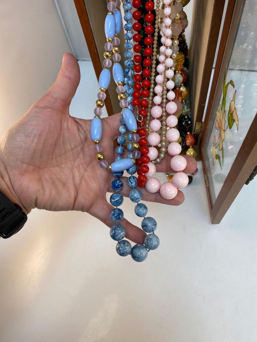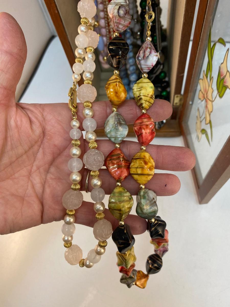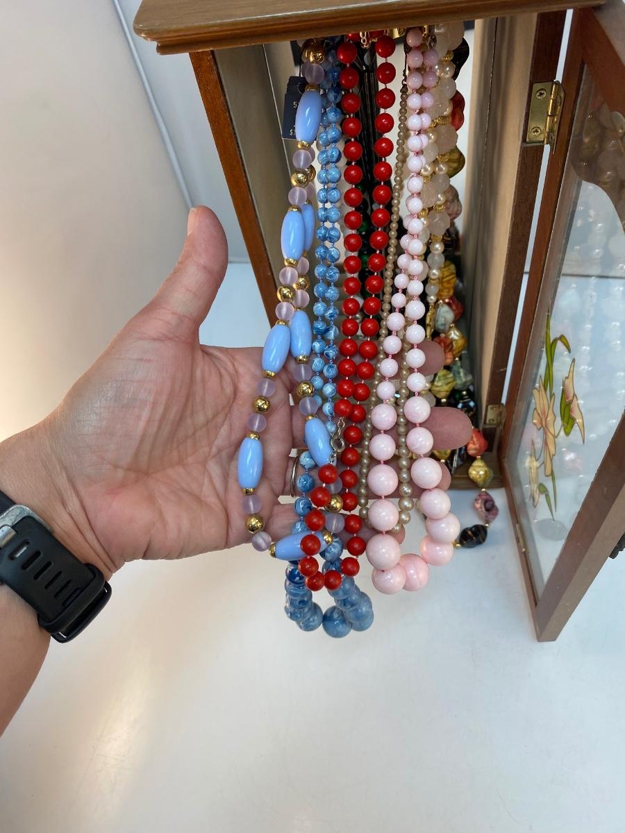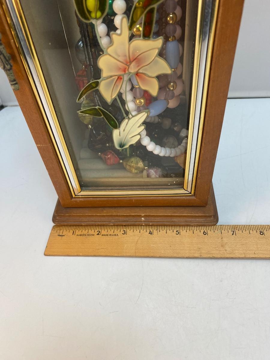 Vintage Retro Tall Slender Jewelry Box with Fashion Necklaces Included. In good condition. Glass door panel with flower design. Turn hook rack inside for holding necklaces and small storage at bottom for rings and earrings. Comes with a mixed variety of beaded fashion necklaces. About 14" tall.