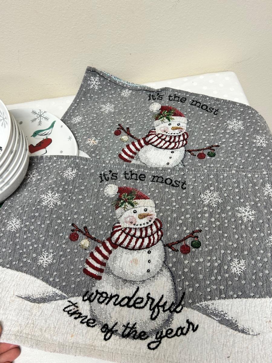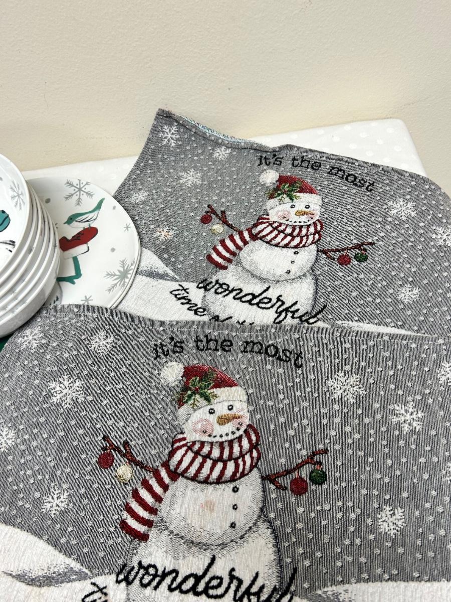Christmas Holiday Plastic Dishware Set & a Pair of Placemats Snowmen Reindeer Santa