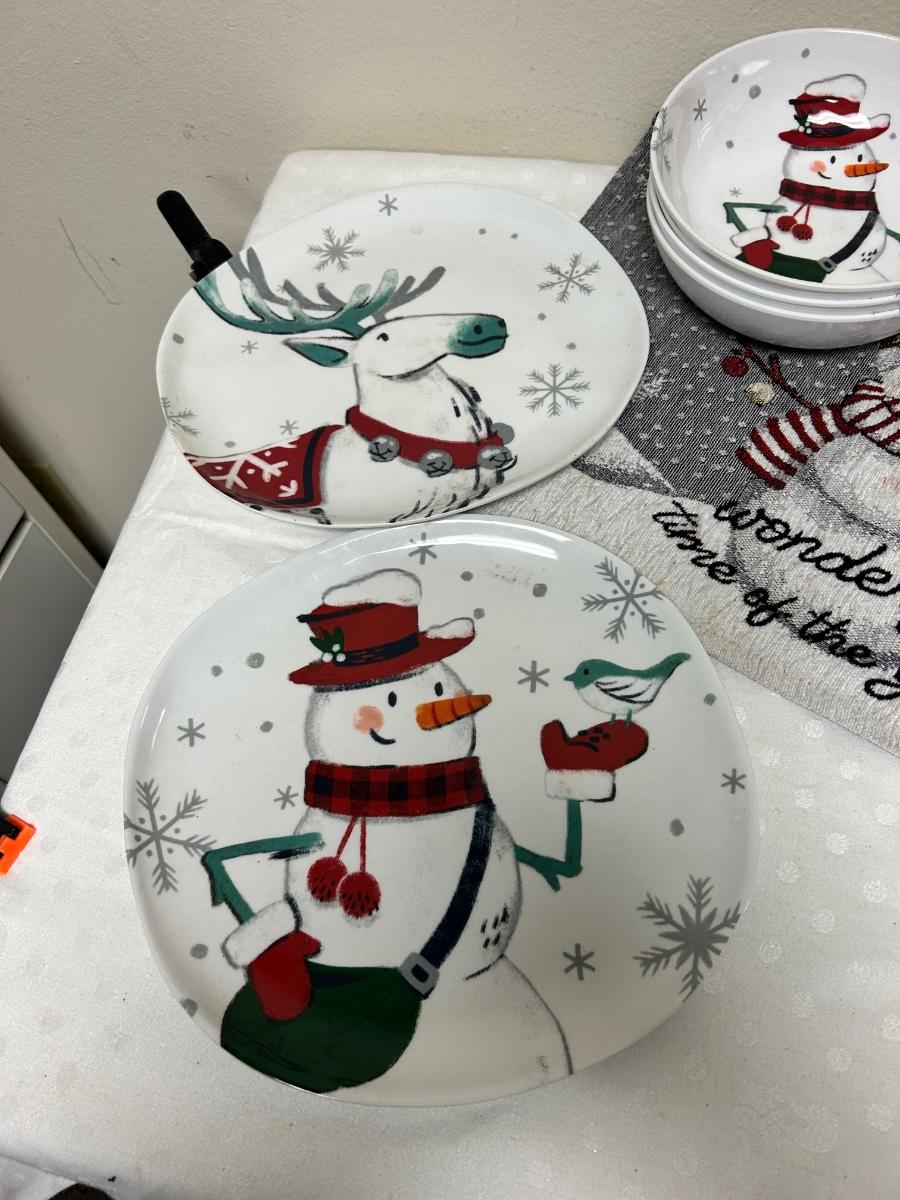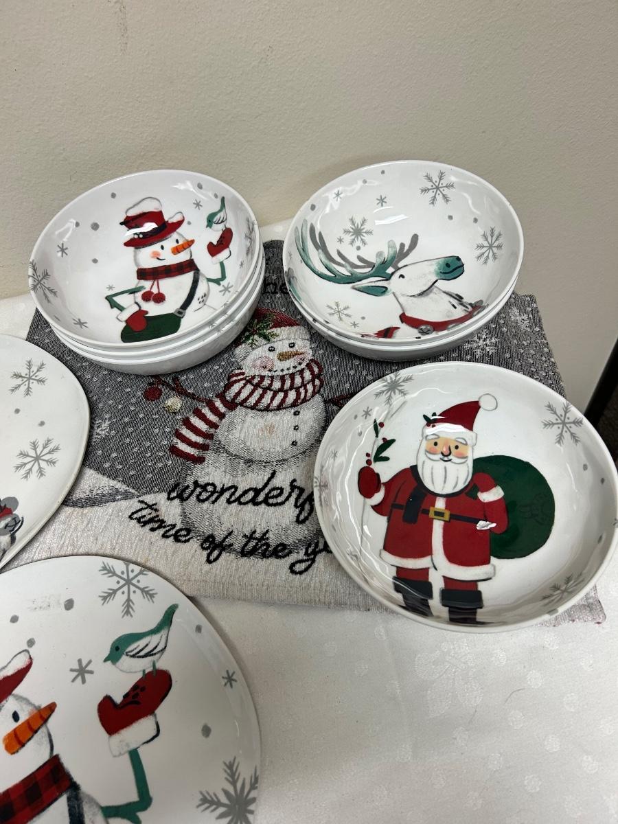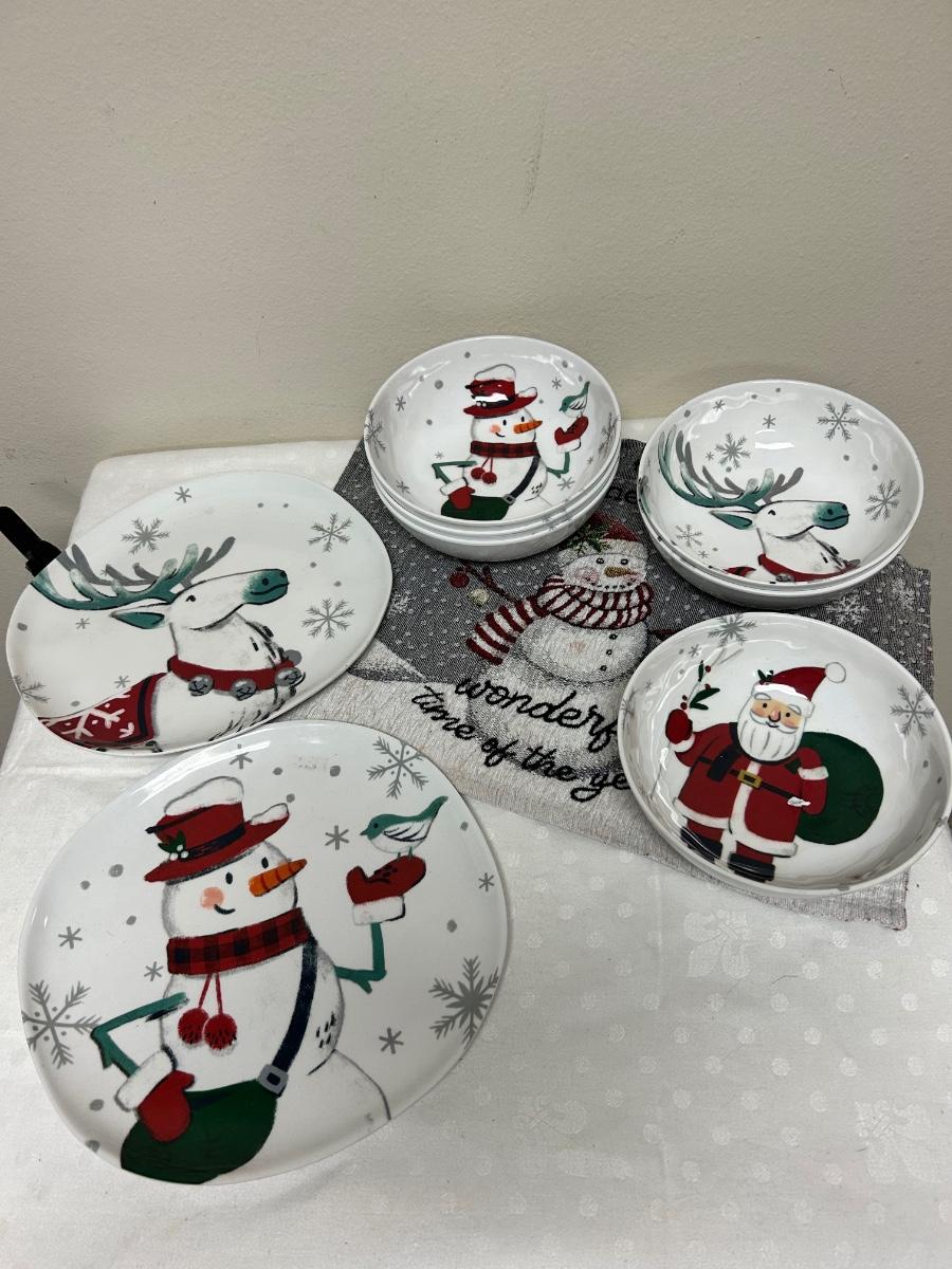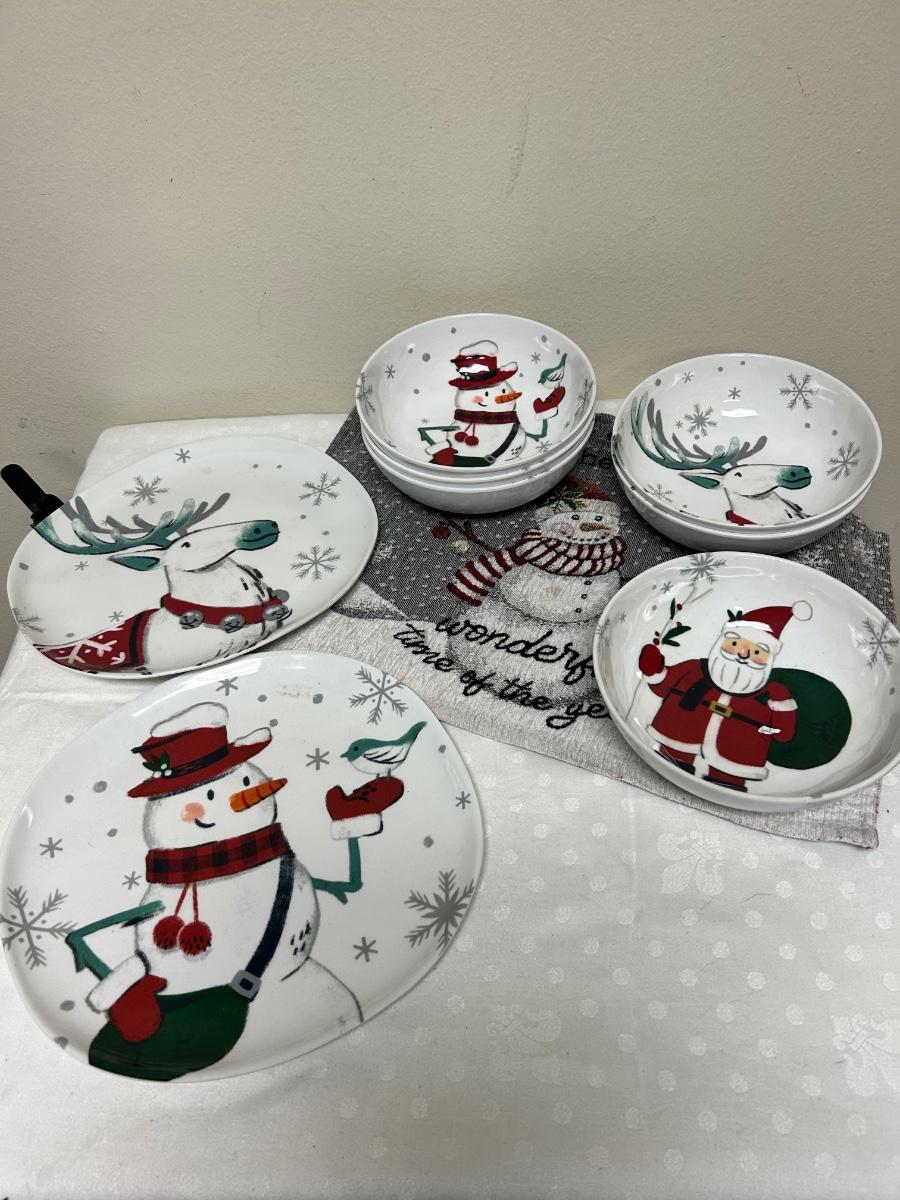 Christmas Holiday Plastic Dishware Set & a Pair of Placemats Snowmen Reindeer Santa. In good condition. 6 bowls with three patterns, two plates, and two placemats. Some light signs of use.