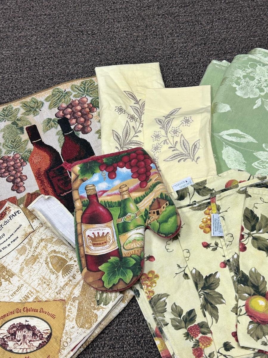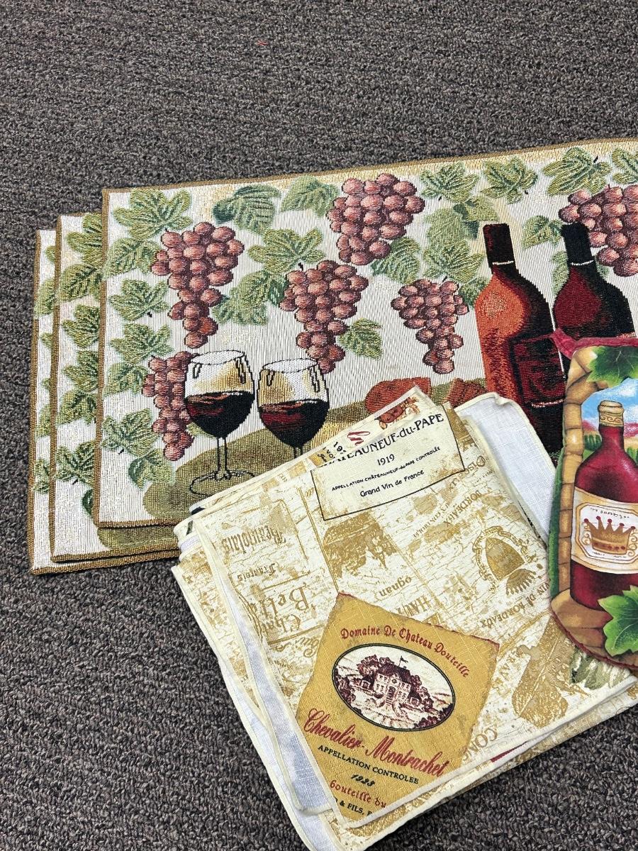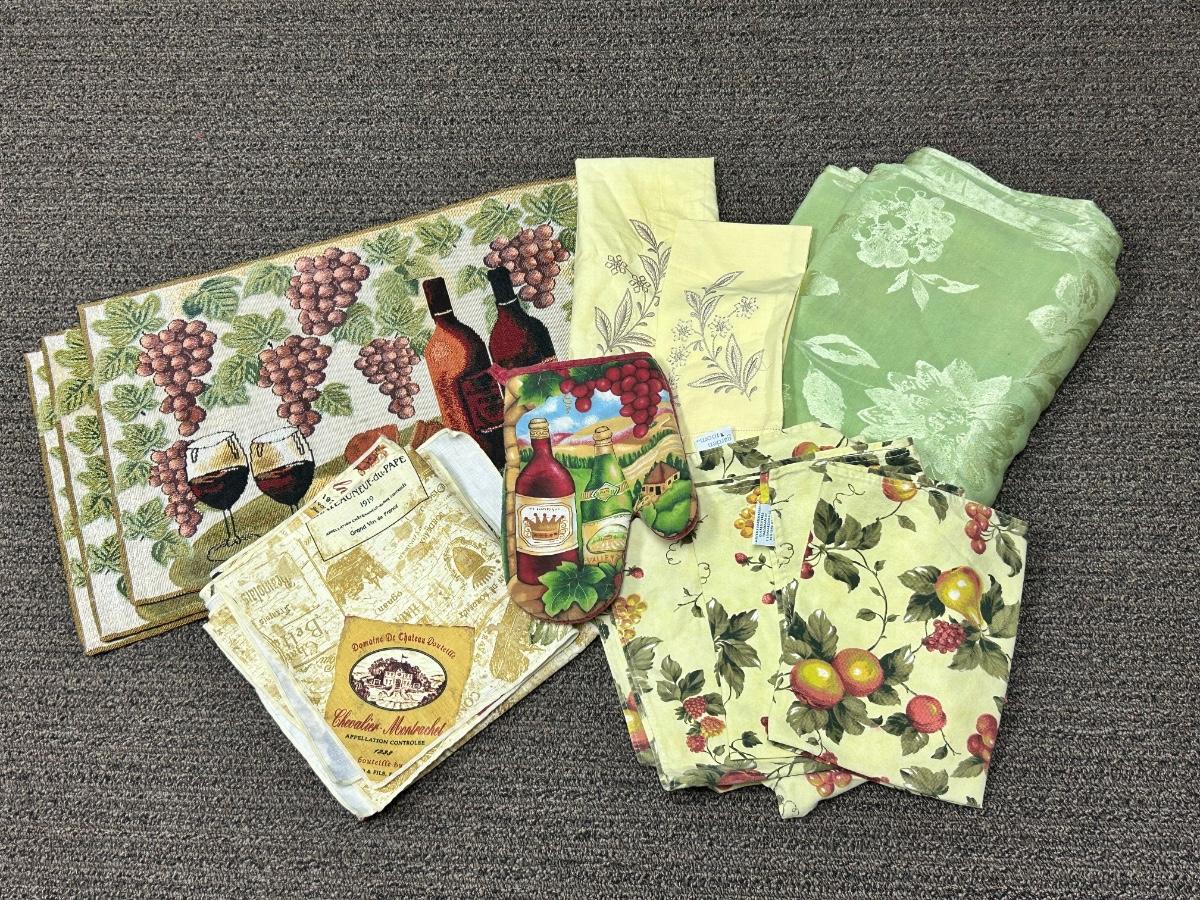 Mixed Table Linen Lot Tablecloth Dinner Napkins Placemats Wine Grape Theme. In good used condition, may have light spots but no major stains noticed.