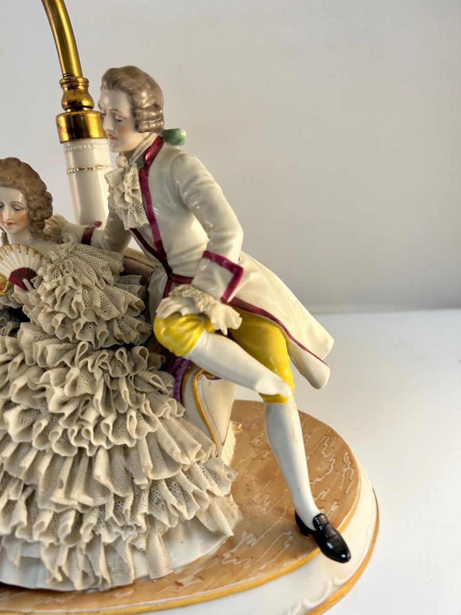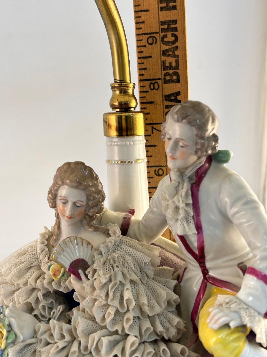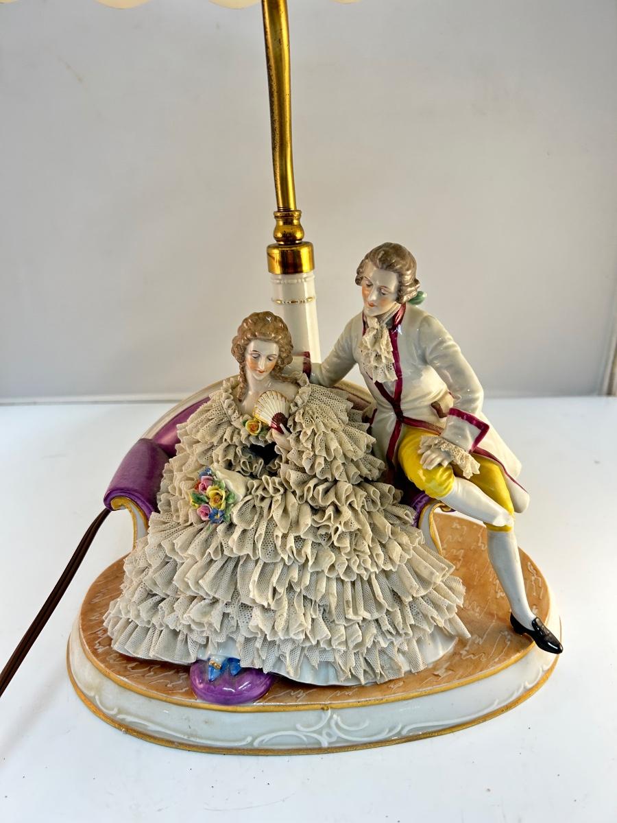 Vintage Antique Porcelain Lace Victorian Couple Boudoir Table Lamp Thuringia Dresden Germany. In fair condition. Lace may have some chipped edges, but they don't stand out too much, but the man is missing part of his leg. Lamp works. Shade is in good vintage condition, may be dusty. About 26" at top of finial.