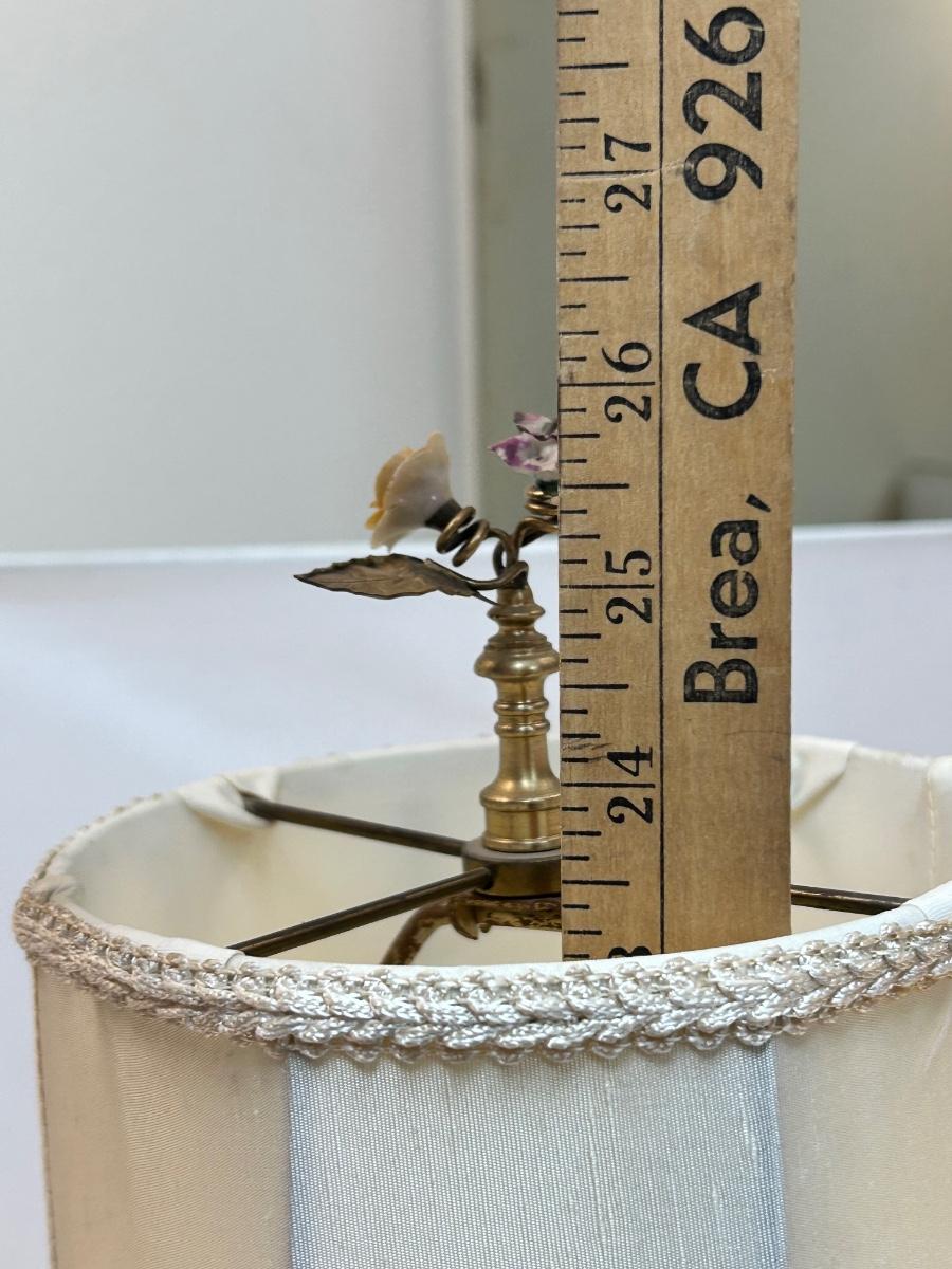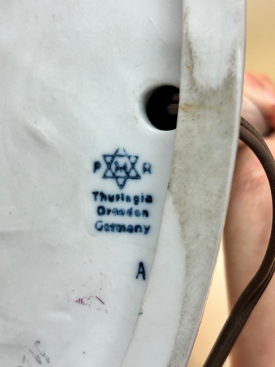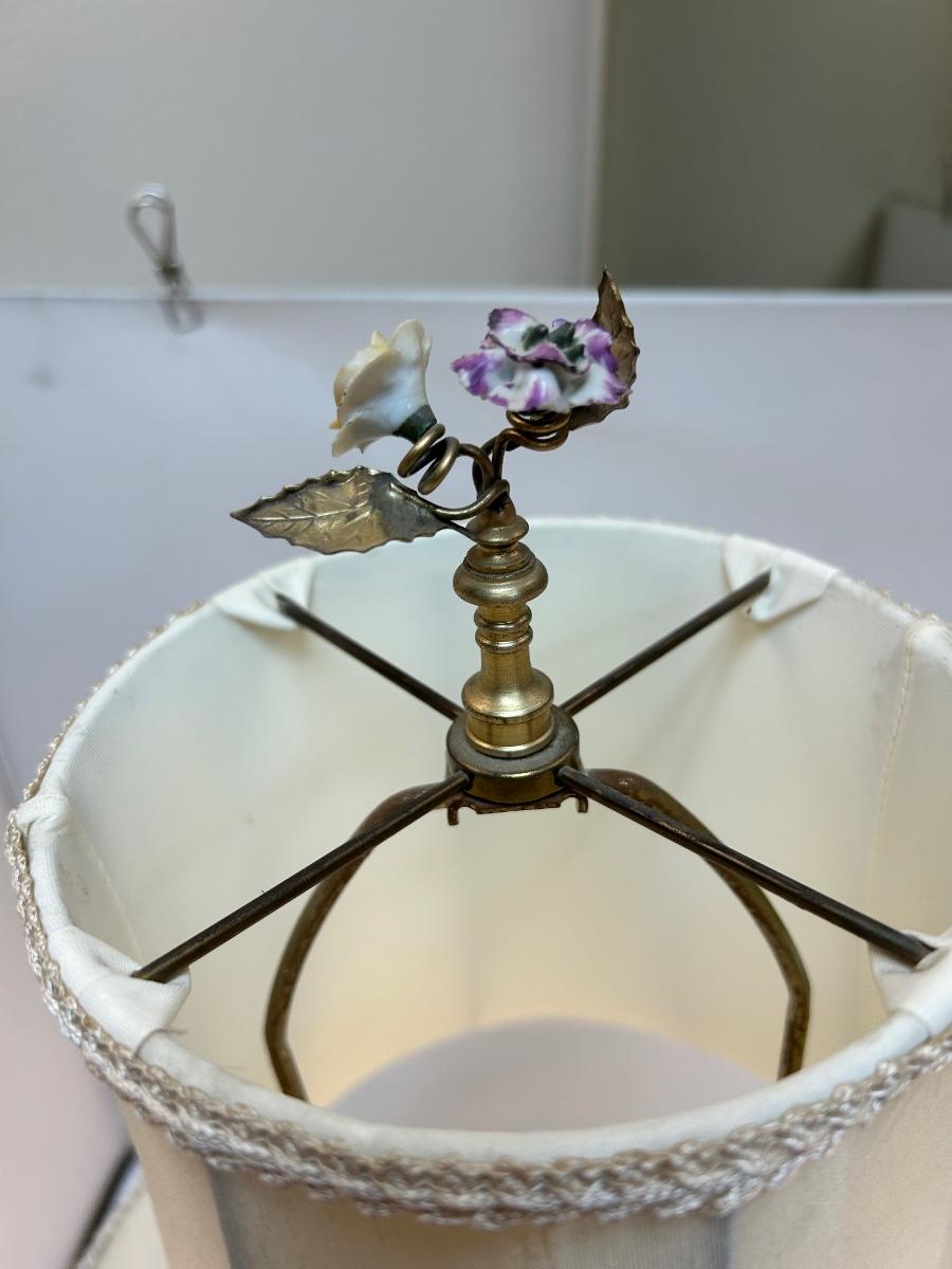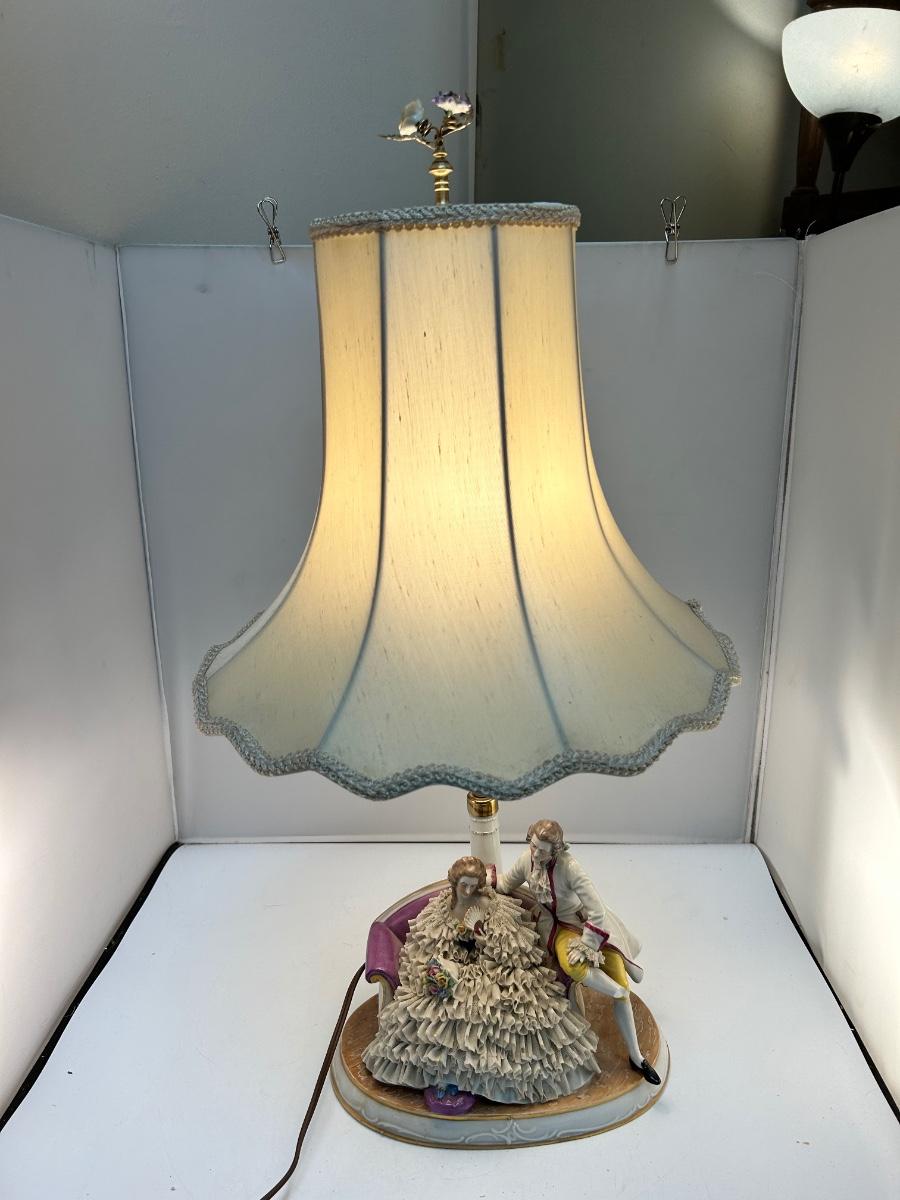 Vintage Antique Porcelain Lace Victorian Couple Boudoir Table Lamp Thuringia Dresden Germany. In fair condition. Lace may have some chipped edges, but they don't stand out too much, but the man is missing part of his leg. Lamp works. Shade is in good vintage condition, may be dusty. About 26" at top of finial.