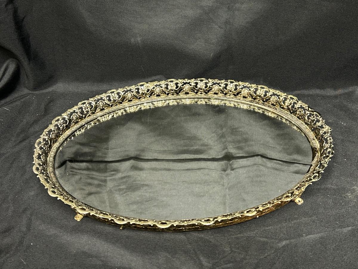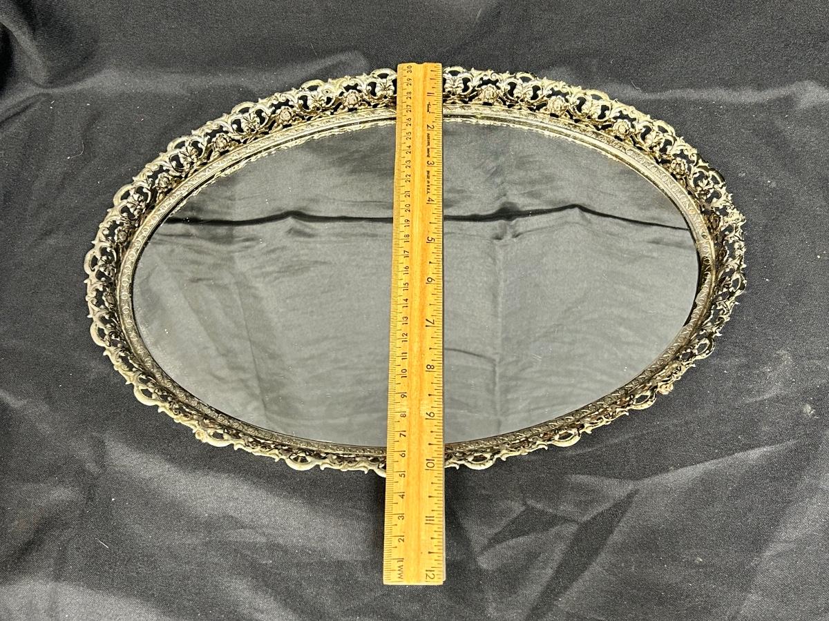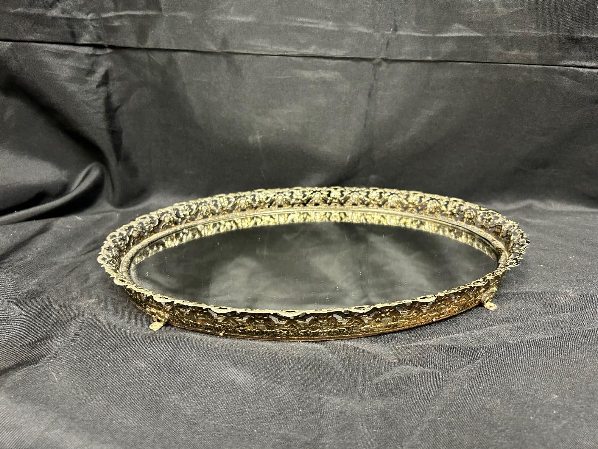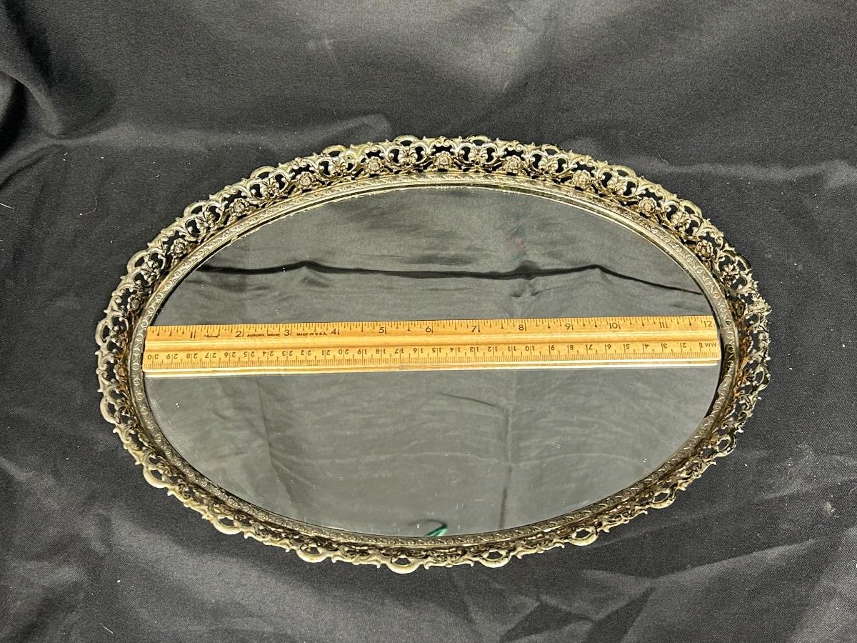 Vintage Gold Tone Metal Framed Oval Mirror Footed Vanity Dresser Perfume Display Tray