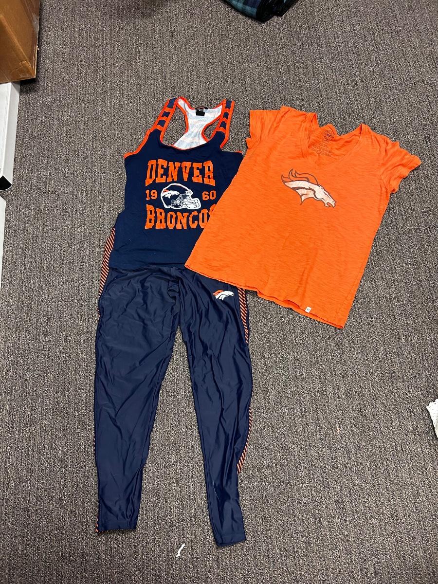 Woman's Denver Broncos NFL Football Team Apparel Tshirt Tank Gym Pants Legging Blue & Orange L XL. In good condition. Tshirt is a XL, leggings and tank are large.