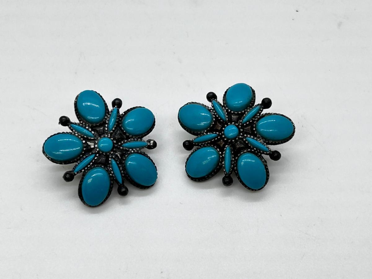 Vintage Faux Turquoise Cabochon Flower Shaped Southwestern Style Clip Earrings