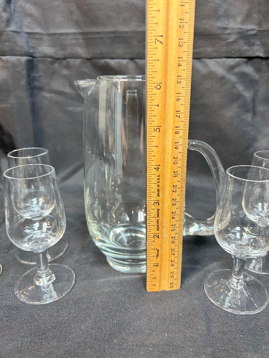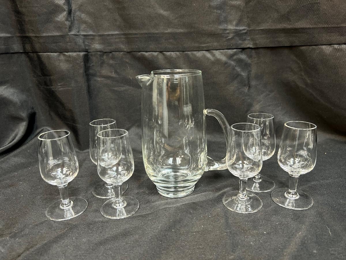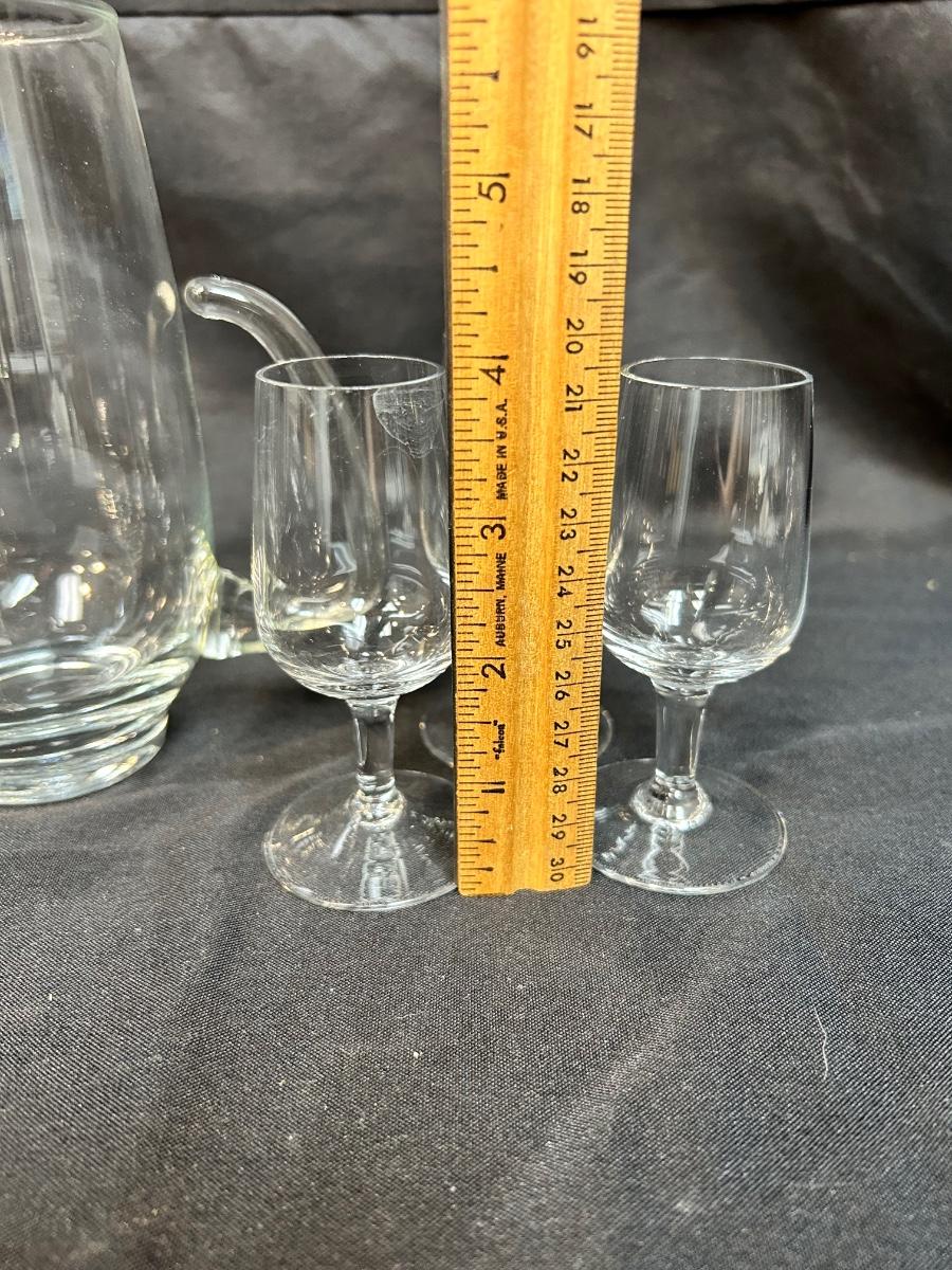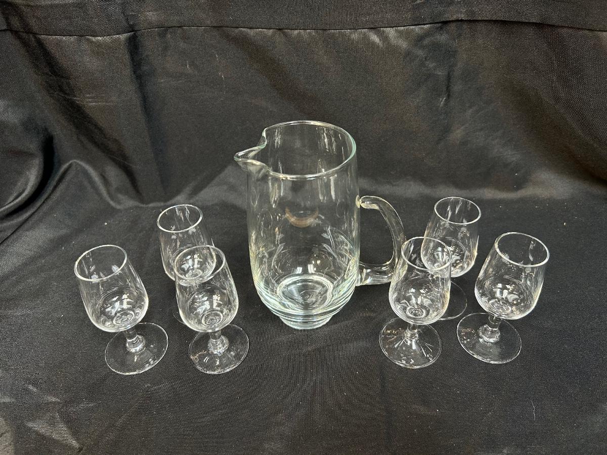 Small Blown Glass Pitcher and Footed Cordial Shot Glasses. Display nice. In good condition, no chips noticed.