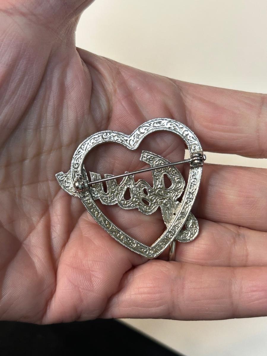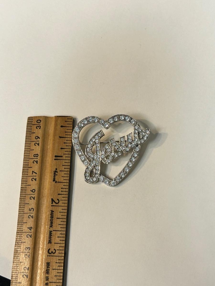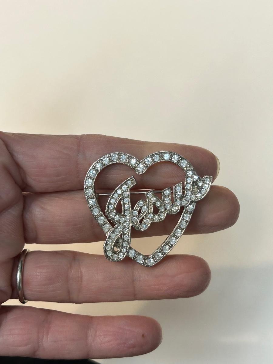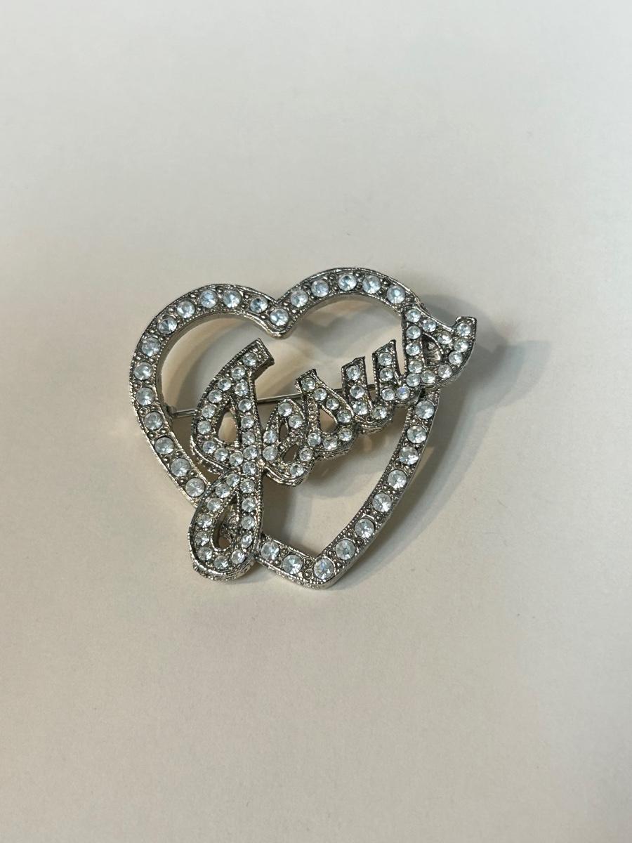 Retro Clear Rhinestone Jesus in a Heart Pin Brooch