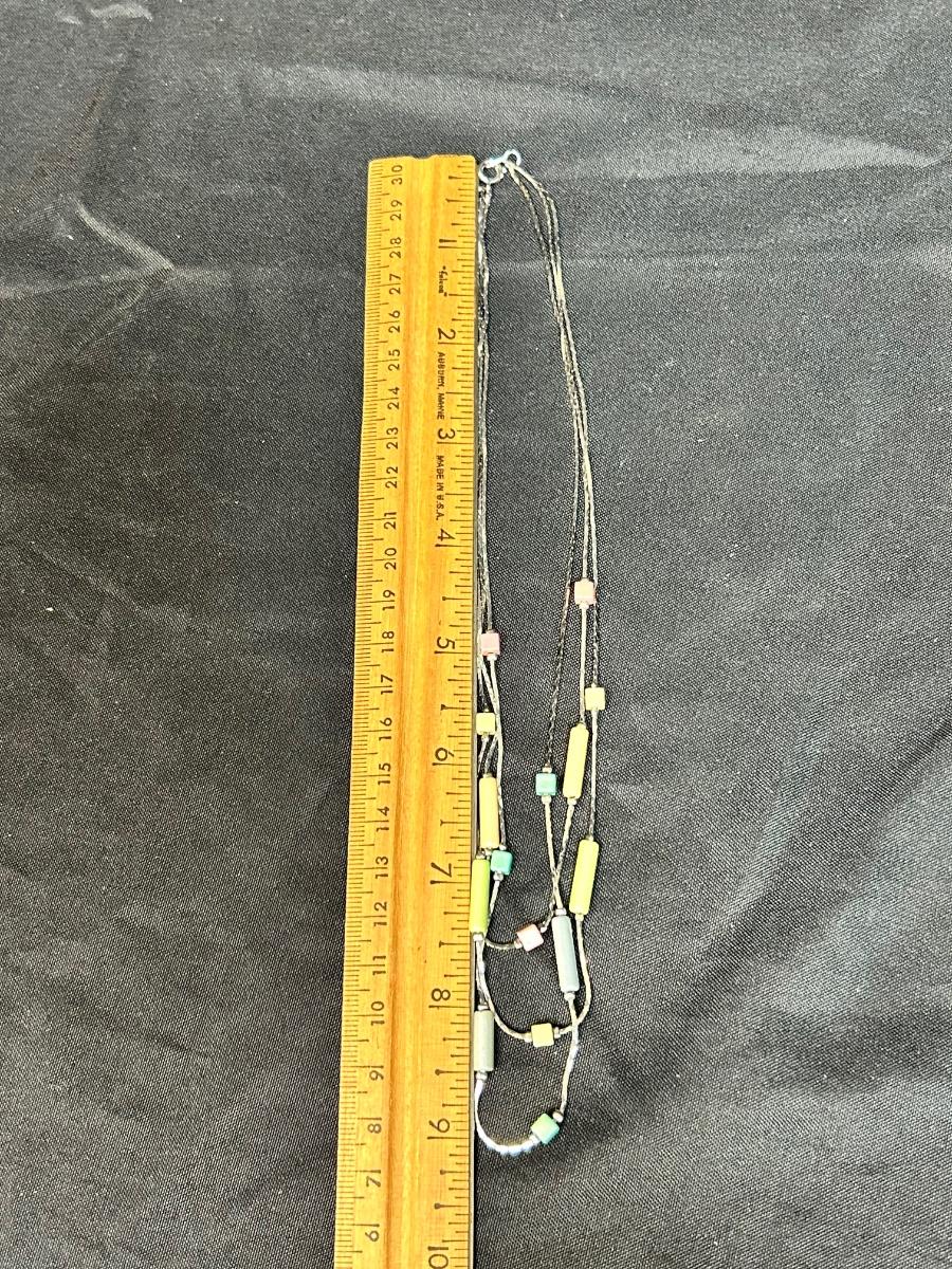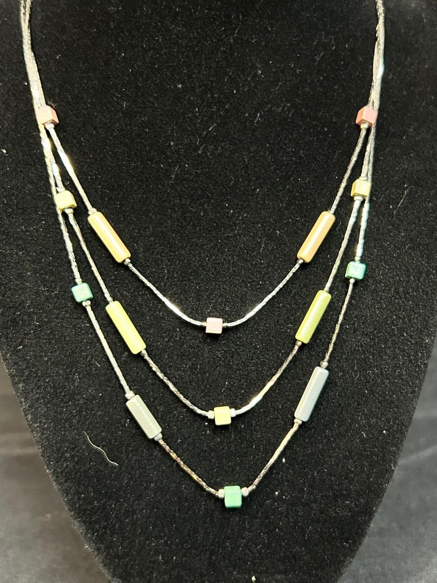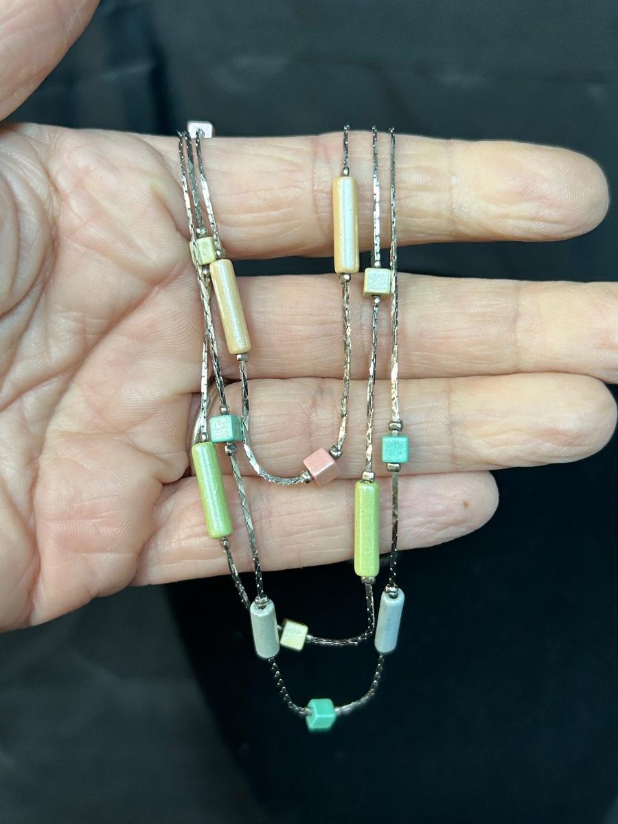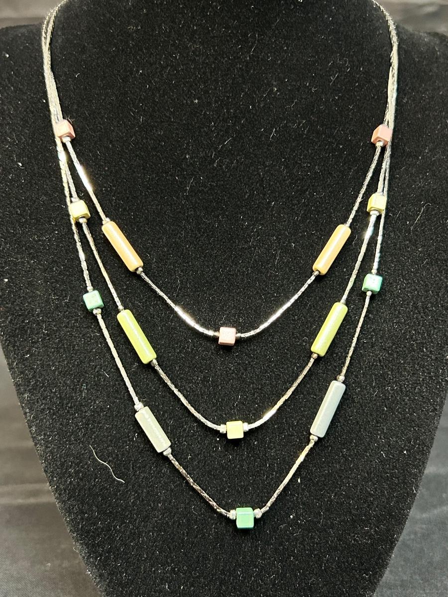 Triple Strand Silver Tone Necklace with Pastel Color Beads. In good condition.