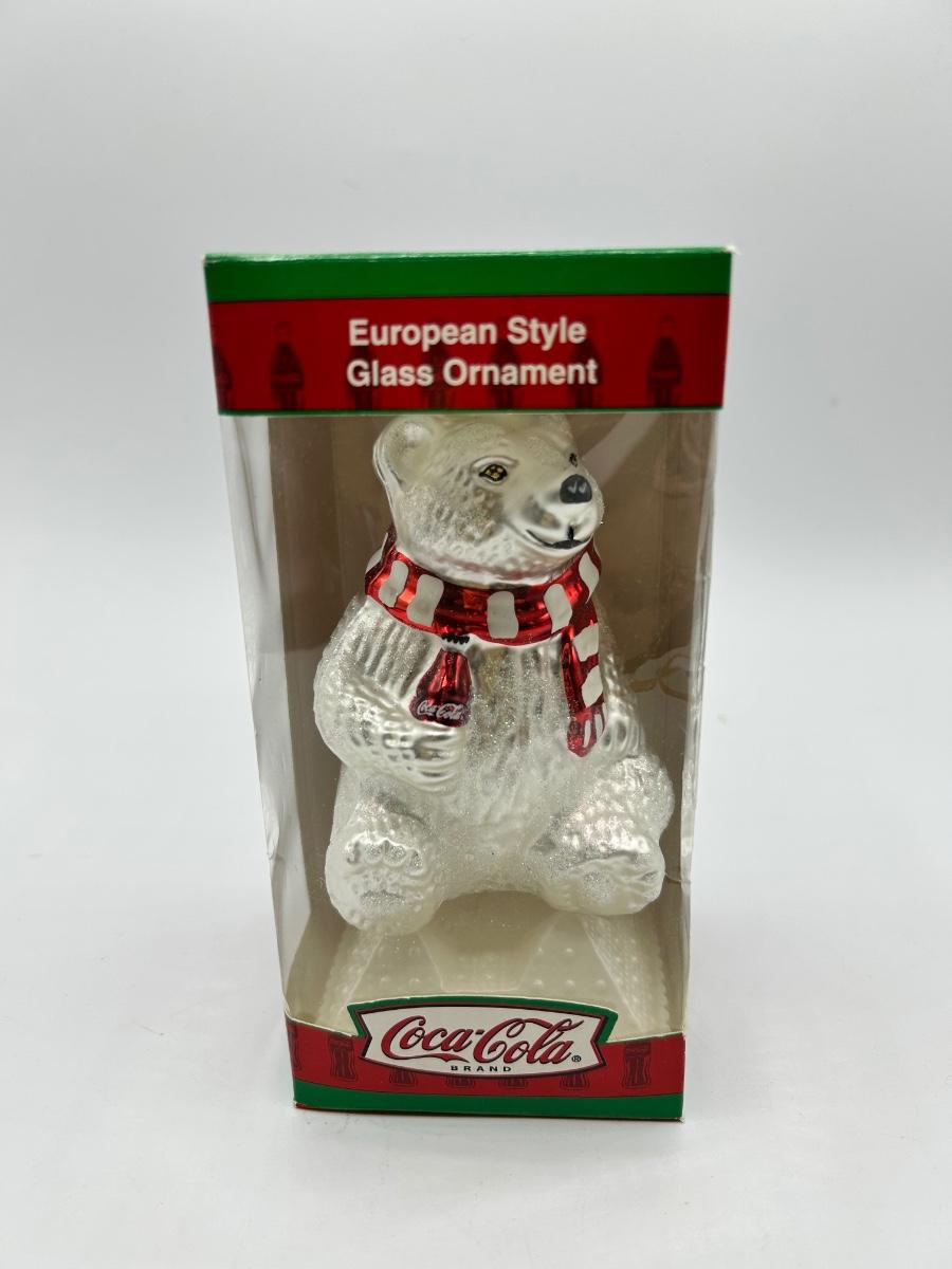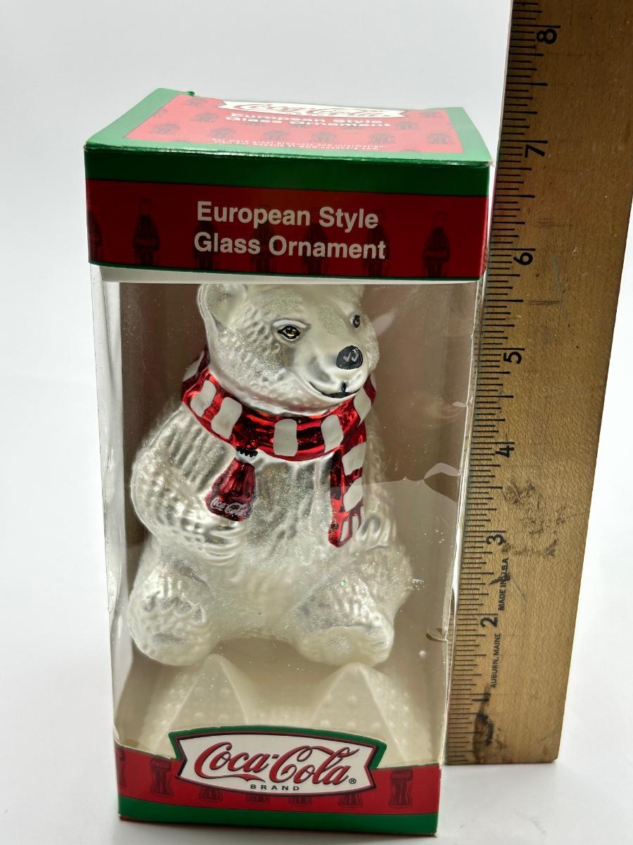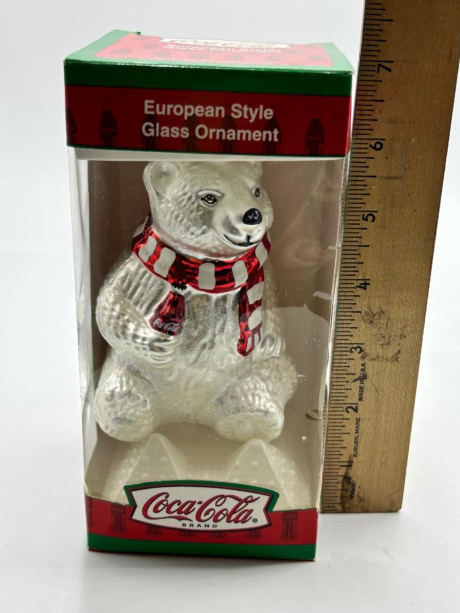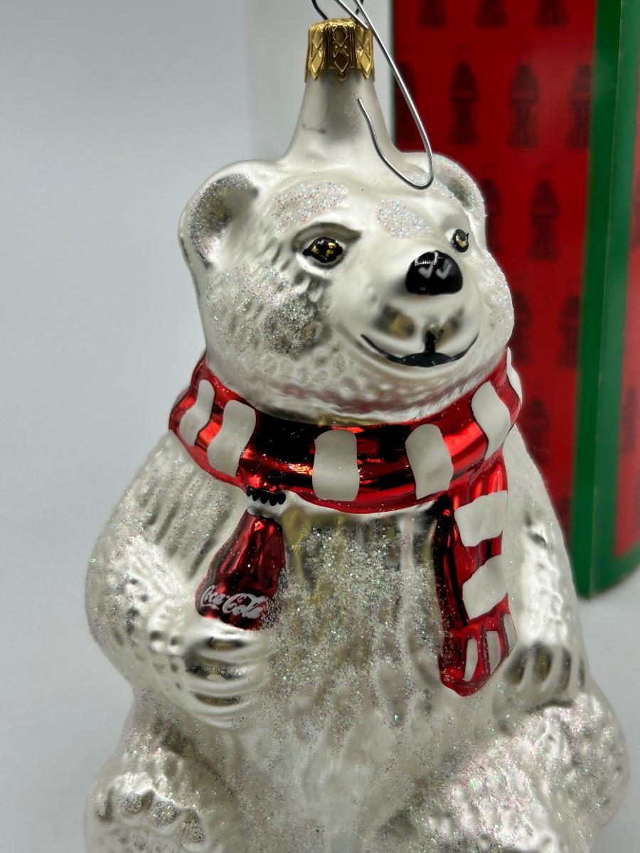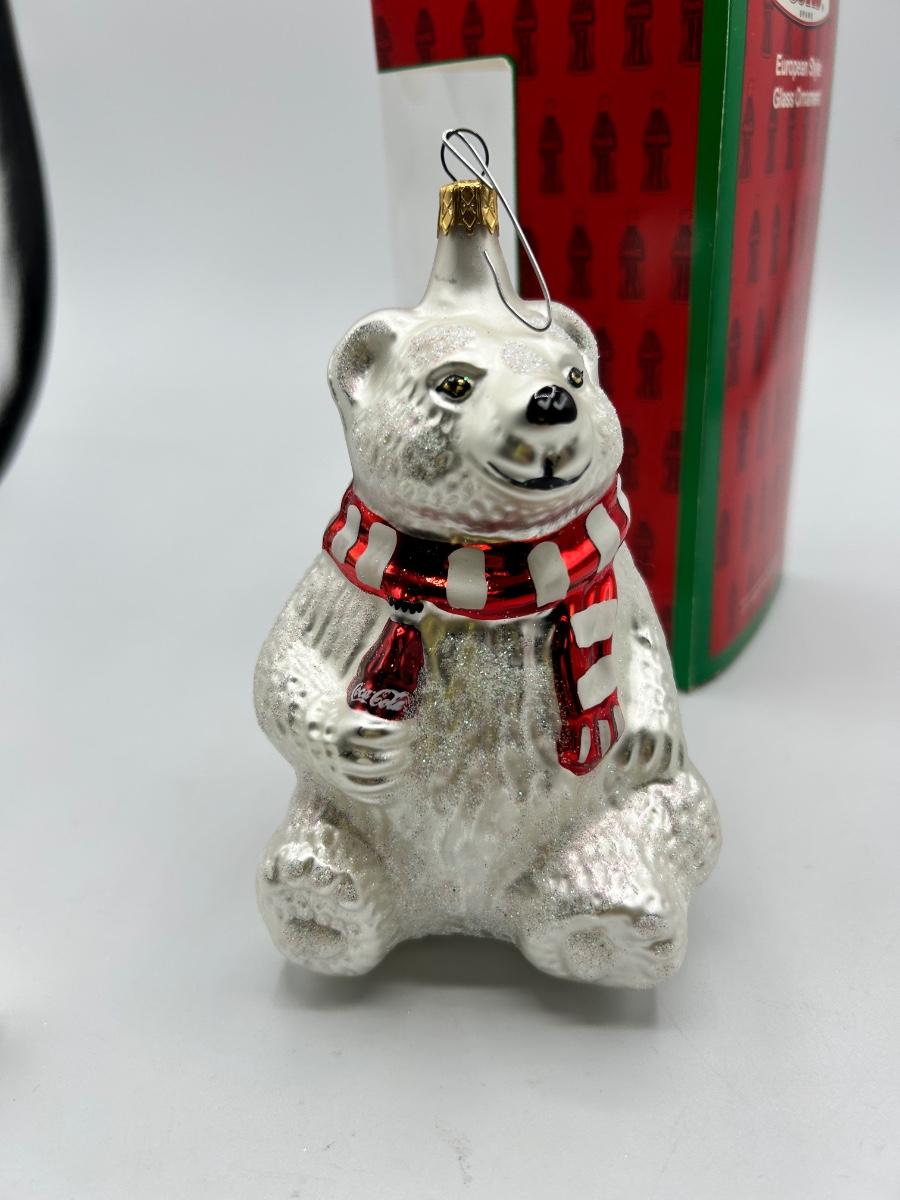 Blown Art Glass Coca Cola Polar Bear Christmas Holiday Ornament with Box. In good previously displayed condition. About 5" size.
