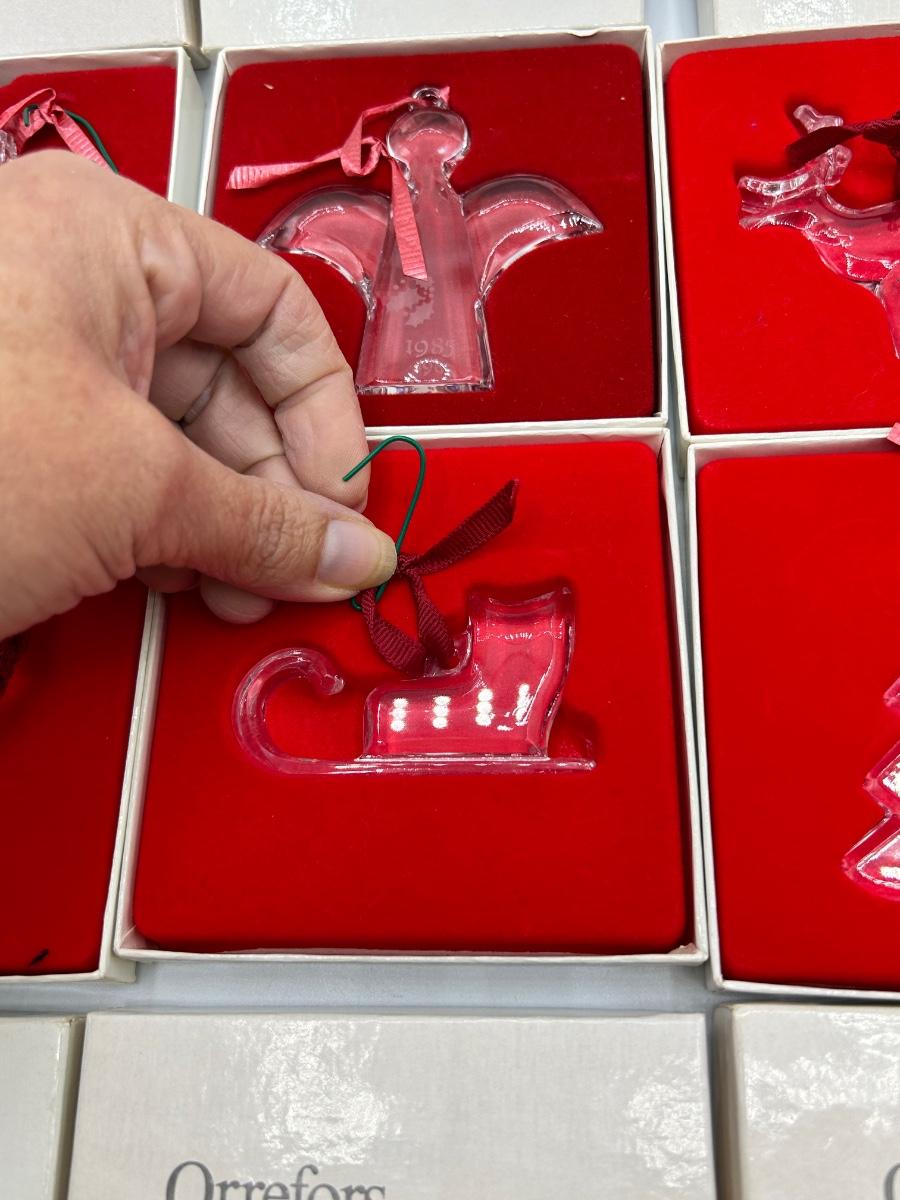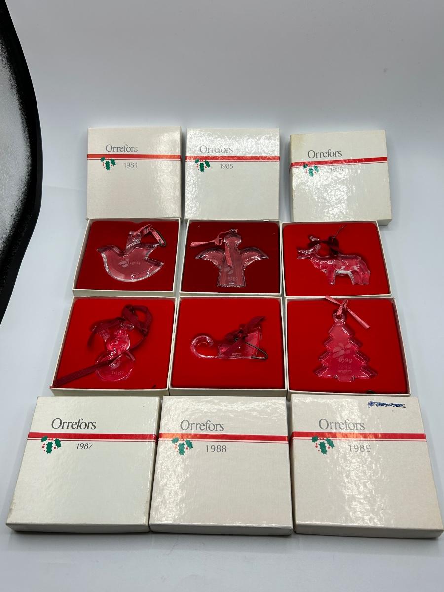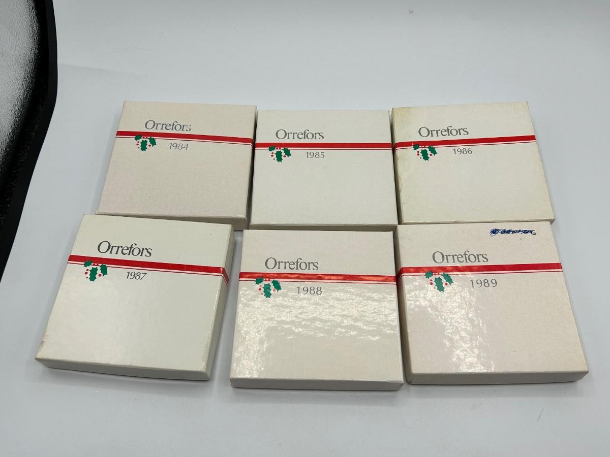 1984-89 Orrefors Limited Edition Dated Crystal Christmas Holiday Tree Ornaments. In good condition. All have original boxes.