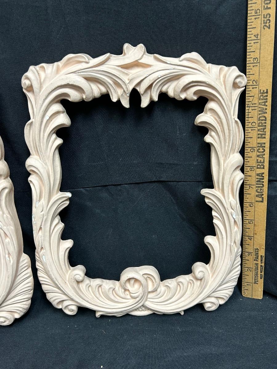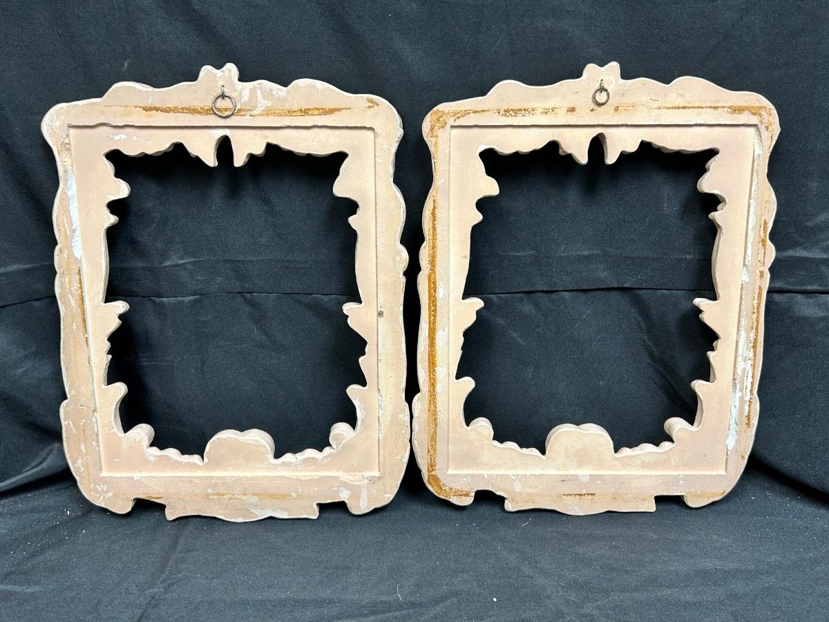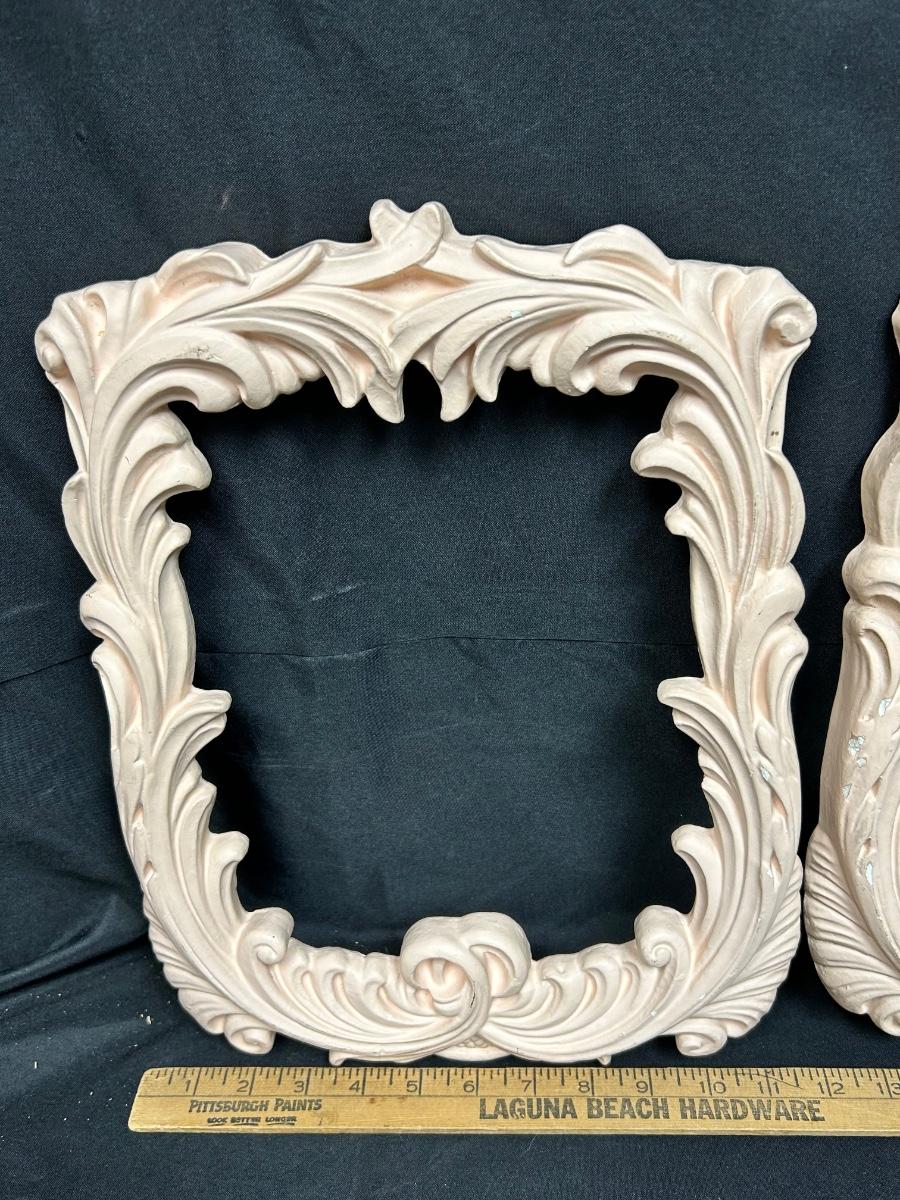 Pair of Pale Pink Art Nouveau Chalkware Picture Photo Frames. In good vintage condition. A couple small chips in paint on one frame. Easily repaint to desires color. No glass or backings. About 14" size outer frame, looks like it may hold 8x10 photo.
