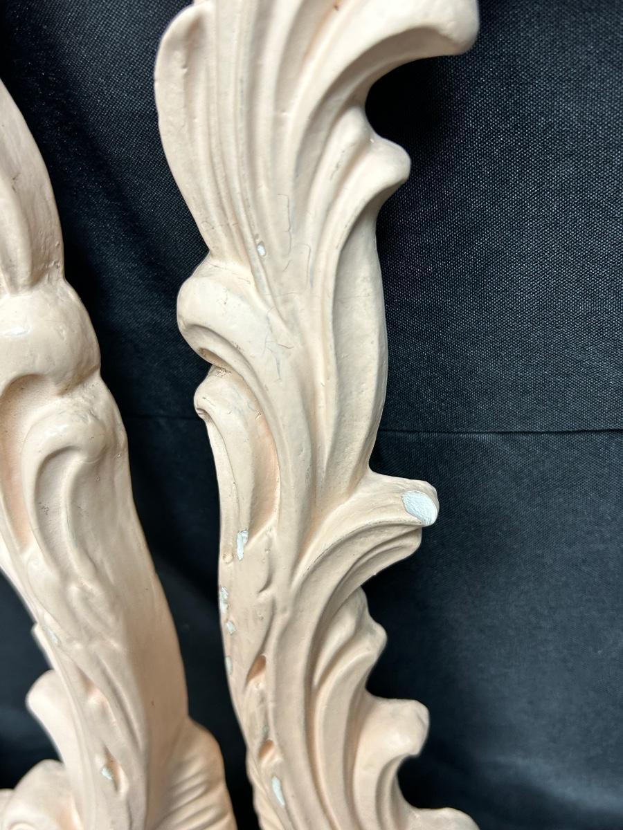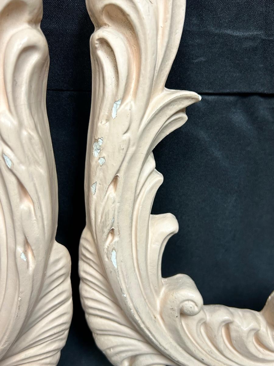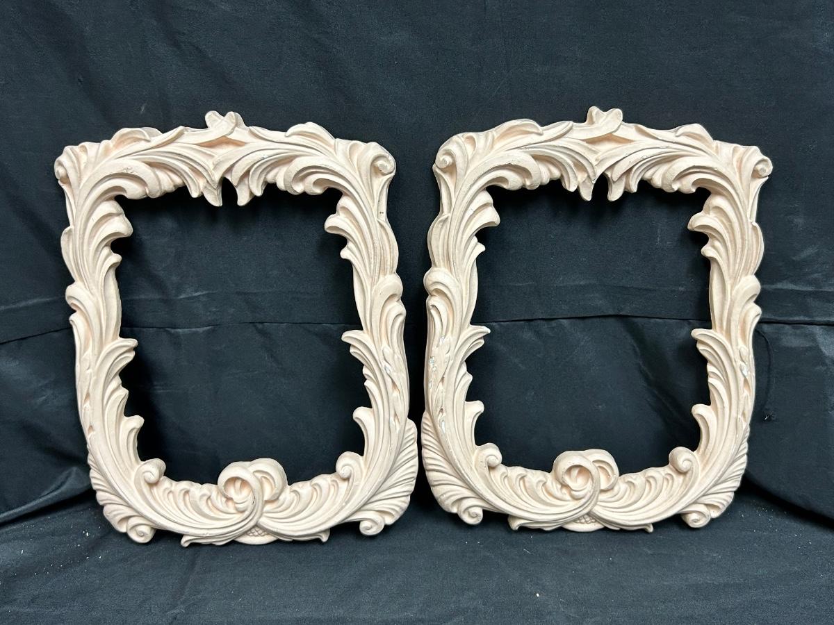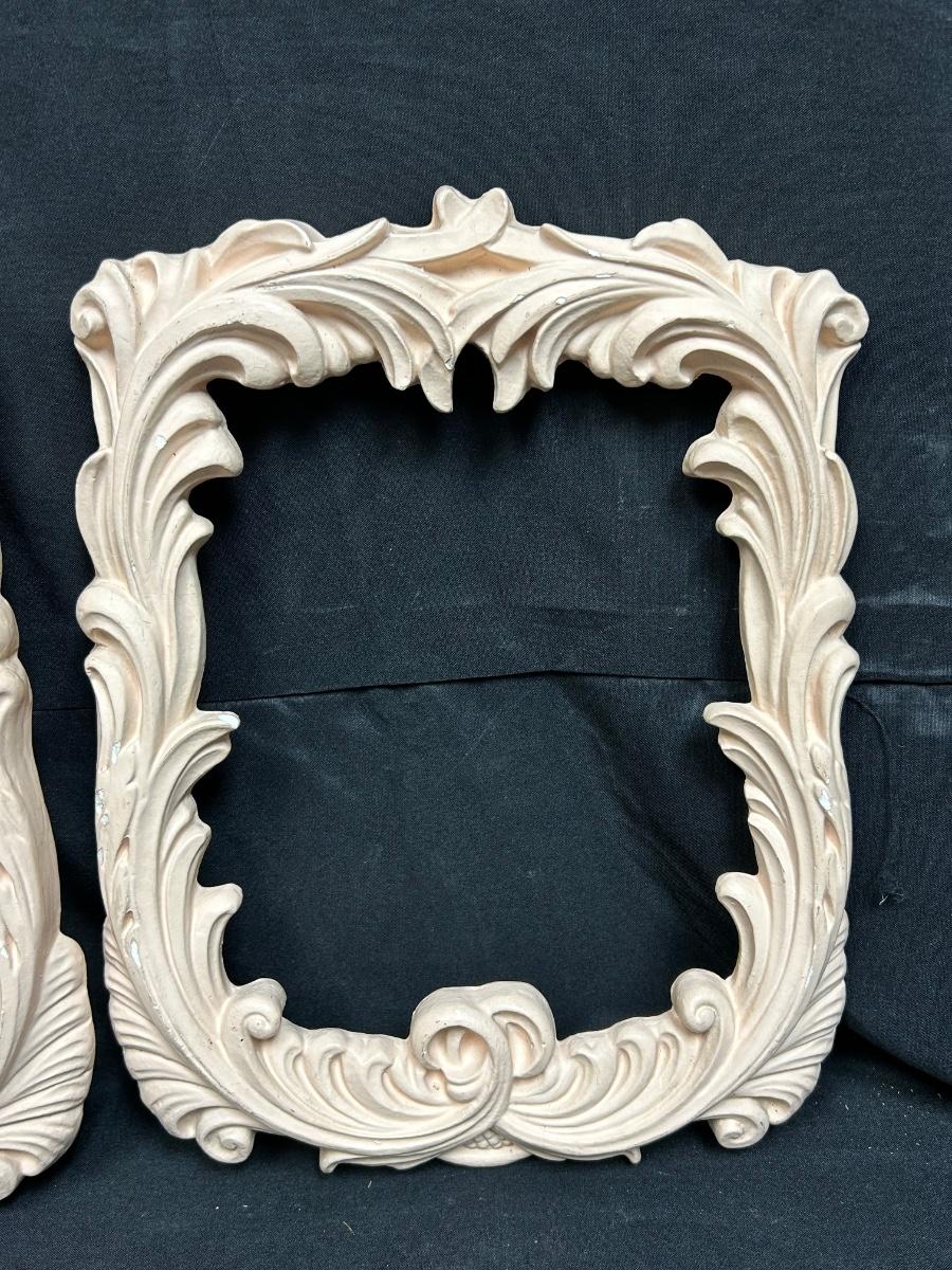Pair of Pale Pink Art Nouveau Chalkware Picture Photo Frames. In good vintage condition. A couple small chips in paint on one frame. Easily repaint to desires color. No glass or backings. About 14" size outer frame, looks like it may hold 8x10 photo.