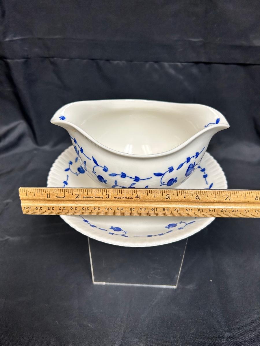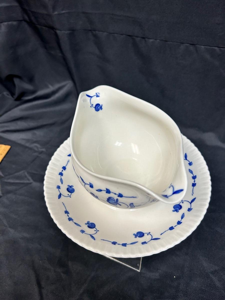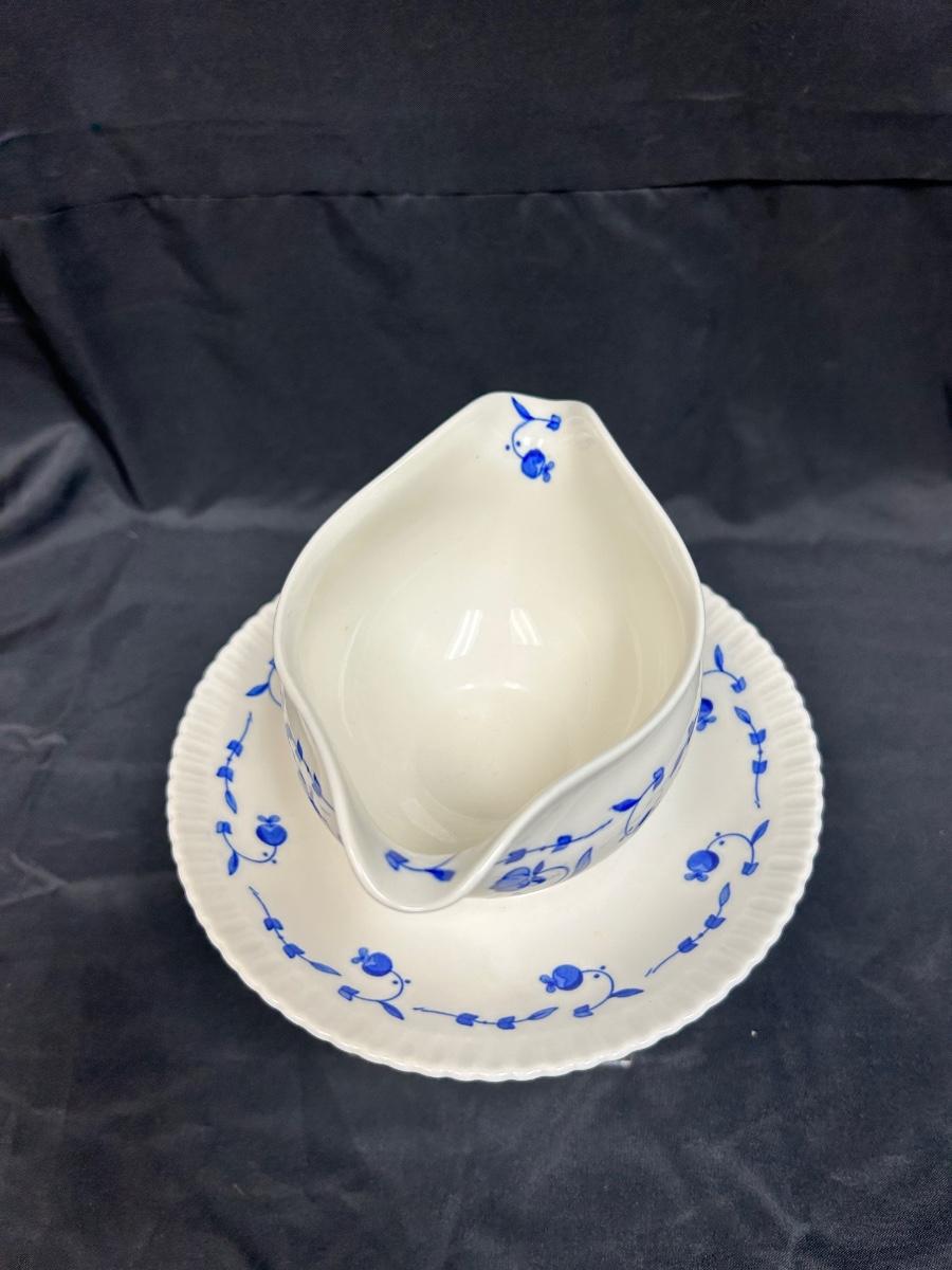 Vintage Syracuse China Blue Flow Floral Flower Pattern Nantucket Double Spout Gravy Sauce Boat with Connected Drip Plate