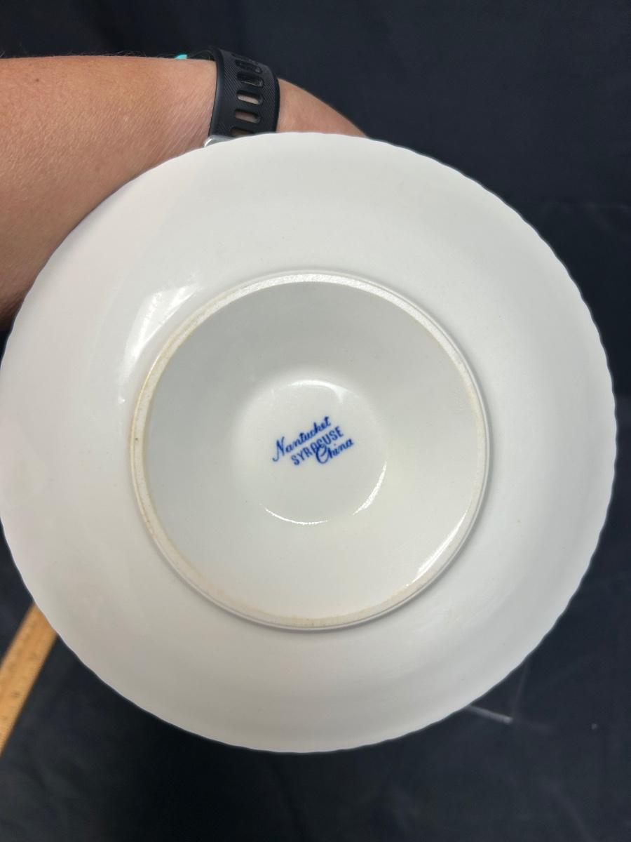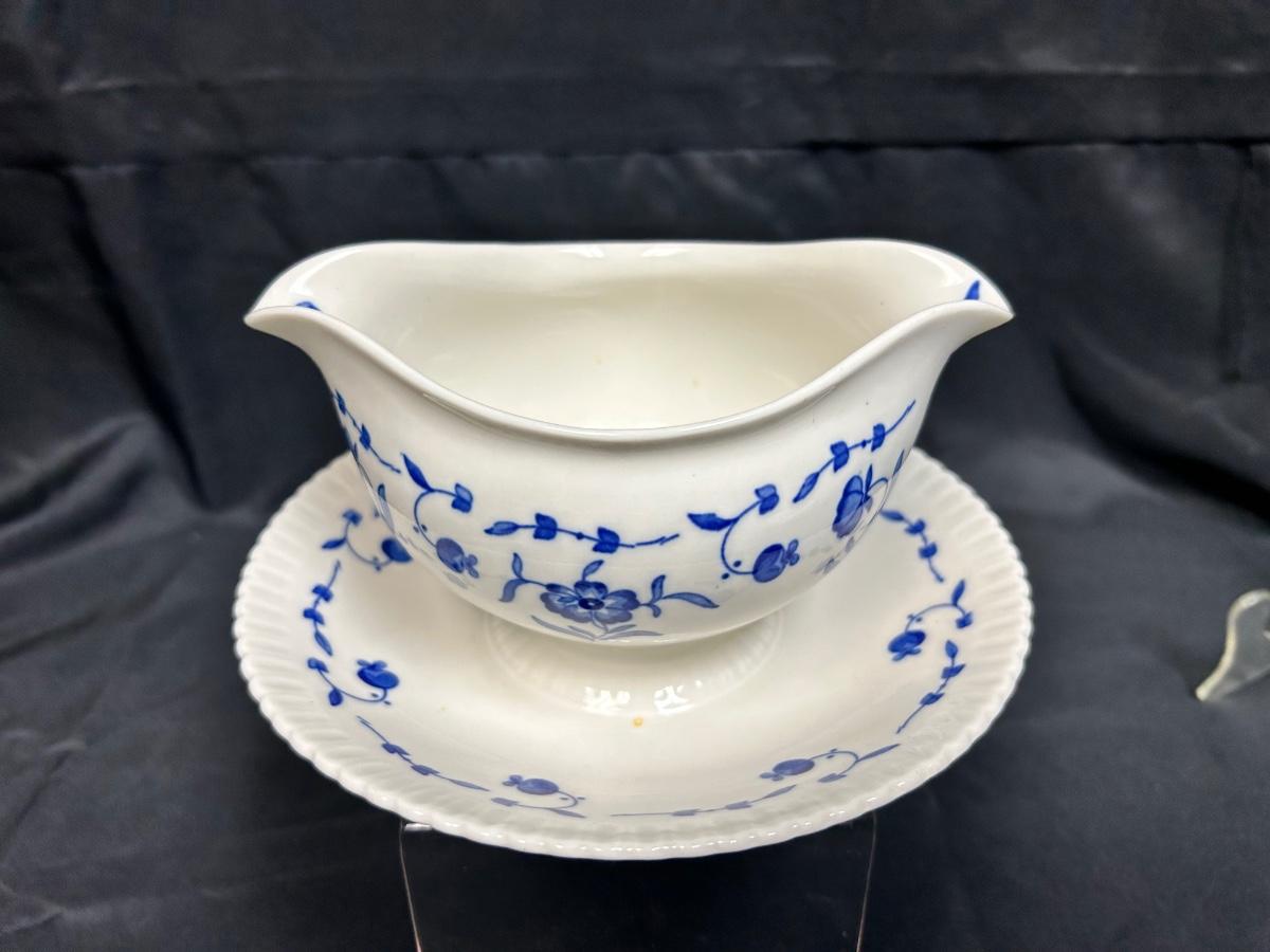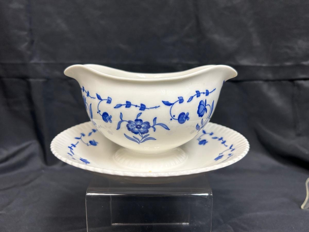 Vintage Syracuse China Blue Flow Floral Flower Pattern Nantucket Double Spout Gravy Sauce Boat with Connected Drip Plate