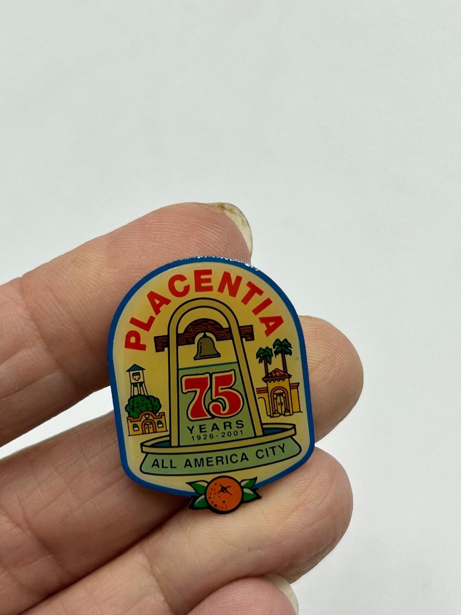 Placentia California 75 Years All America City Lapel Pin Button. In good condition, some light discoloration from age.