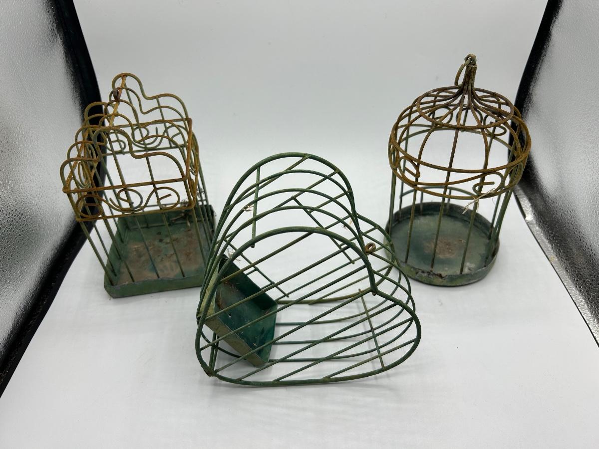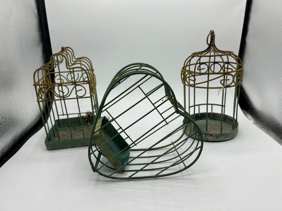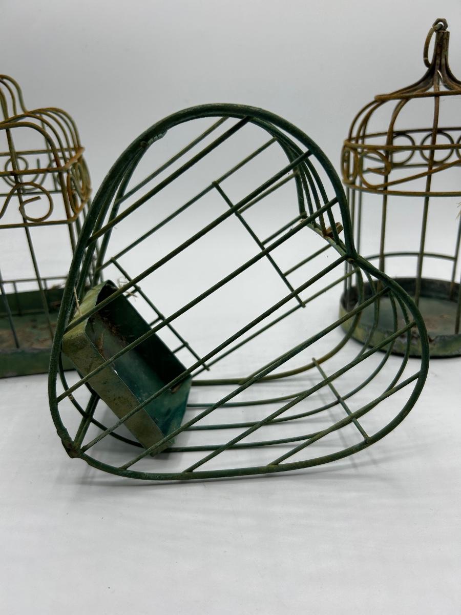 Lot of Three Weathered Green Painted Metal Birdcage Candle Holders Garden Yard Art