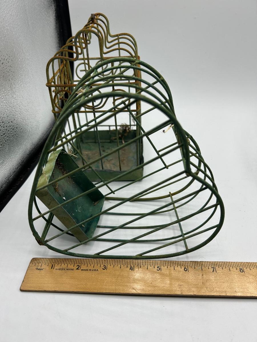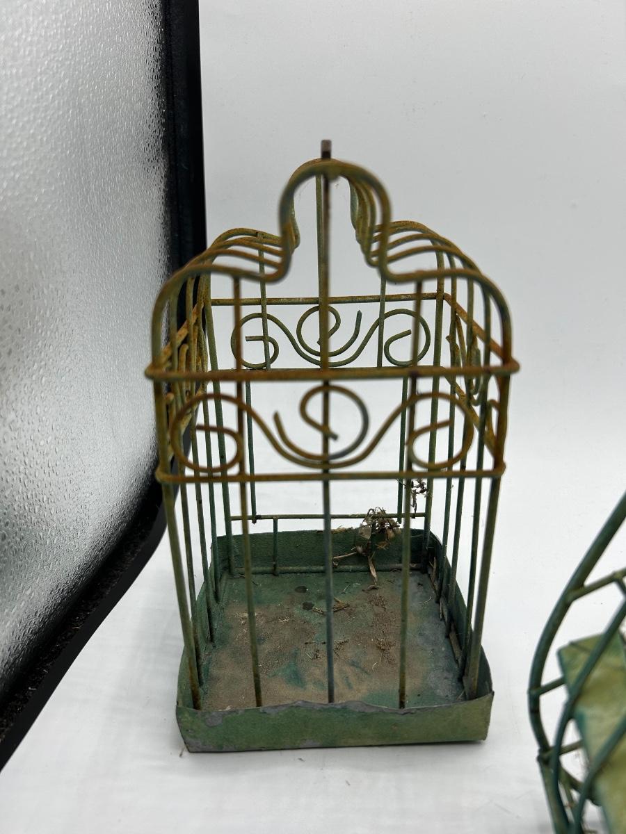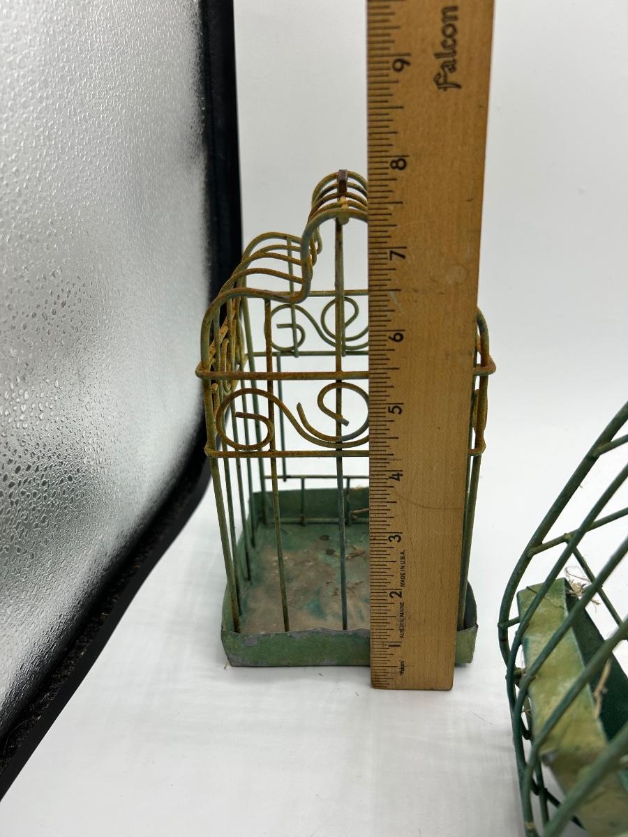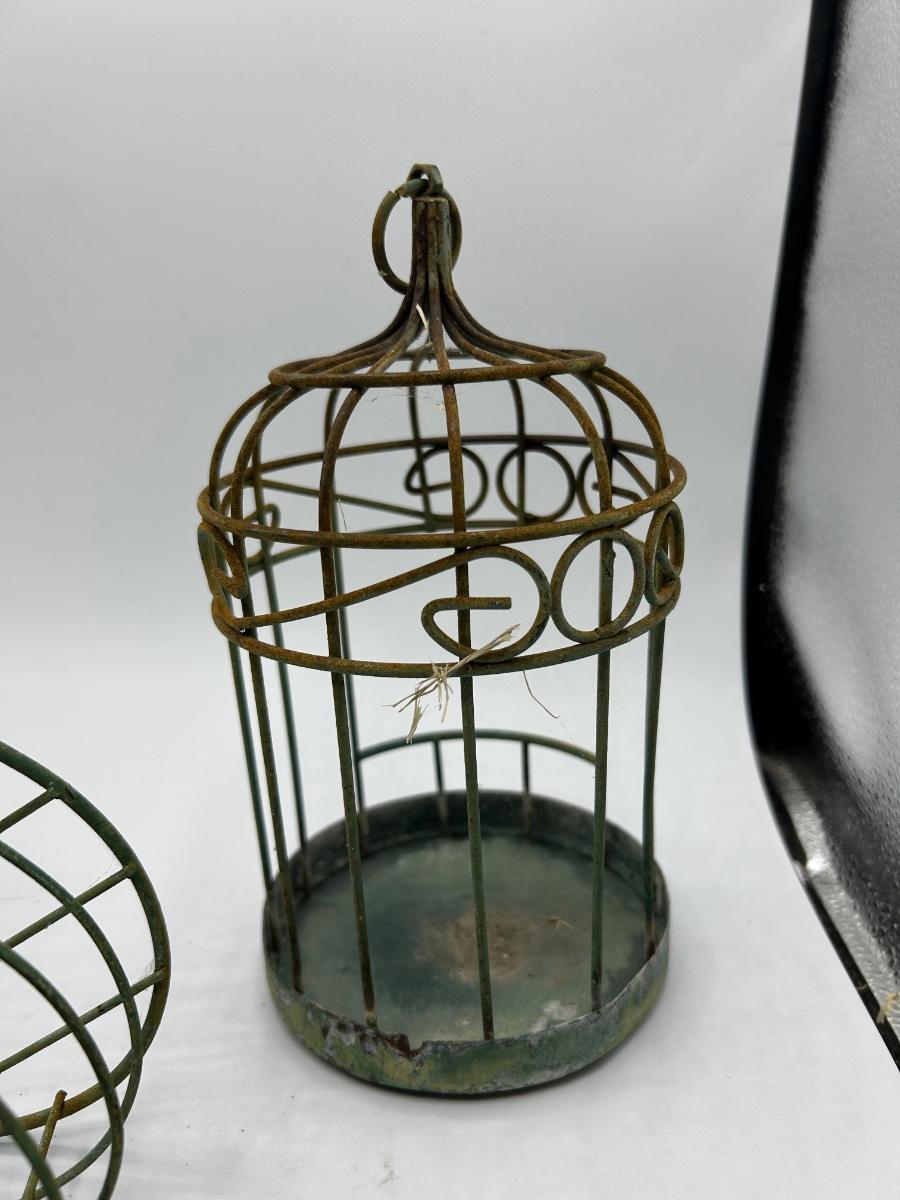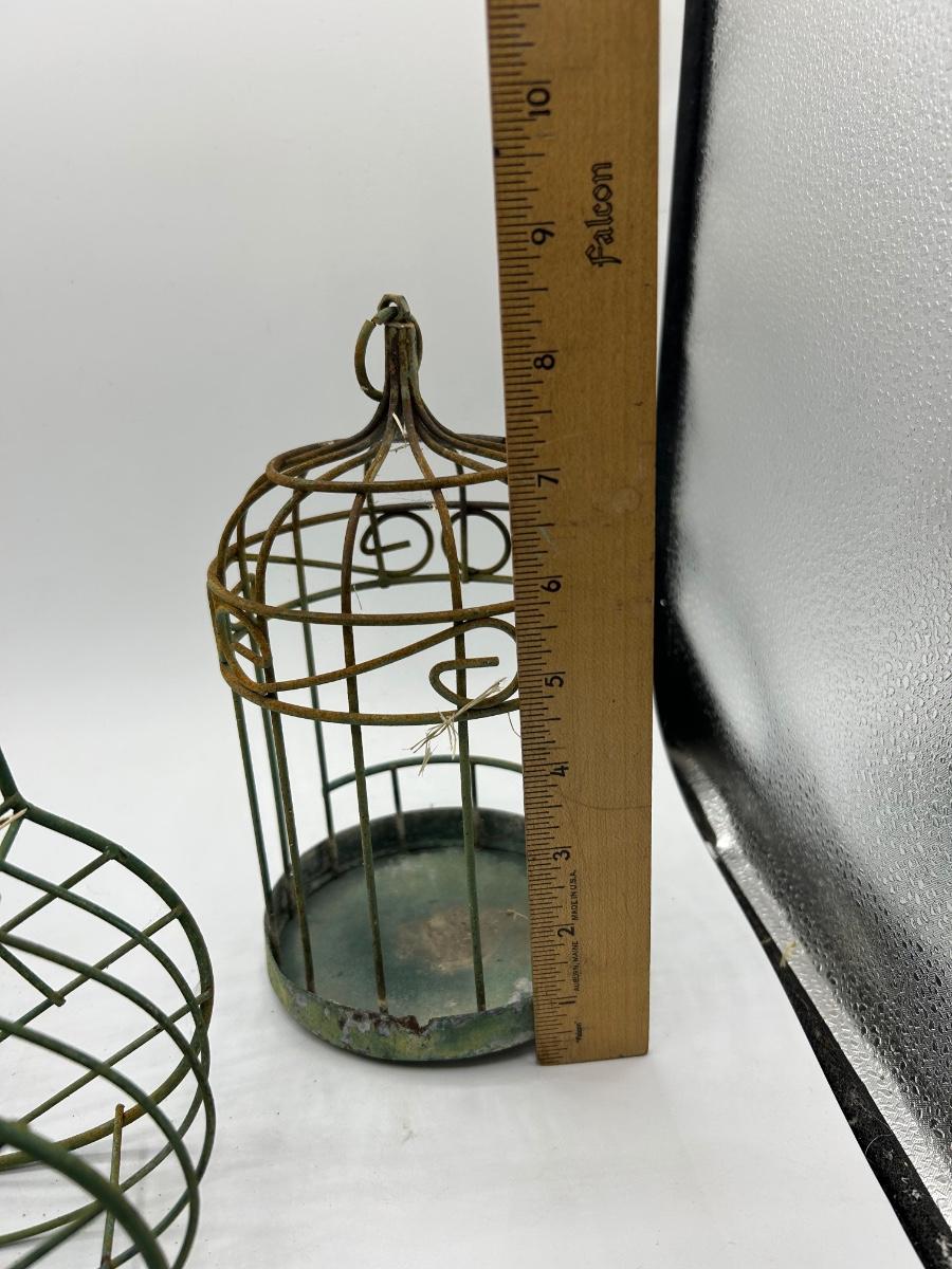 Lot of Three Weathered Green Painted Metal Birdcage Candle Holders Garden Yard Art. Previously displayed condition, some rust from being outside. Under 9" size.