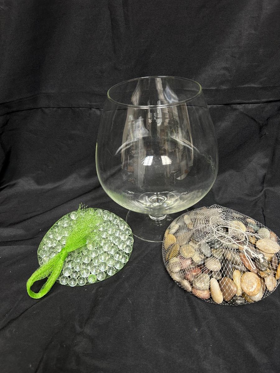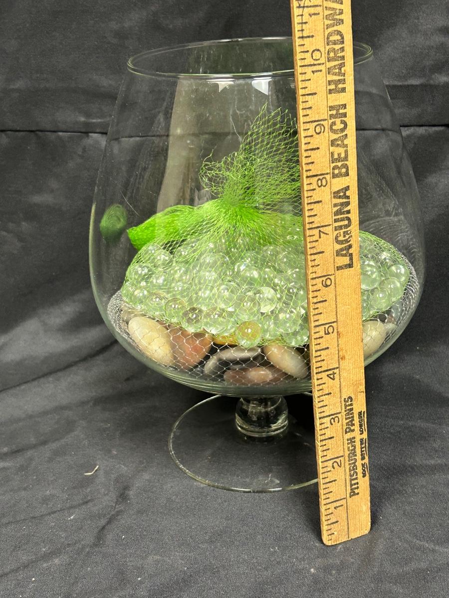 Large Clear Glass Brandy Snifter with Polished Rocks and Marbles for Craft and Decor. Great for a goldfish or betta. In good condition.