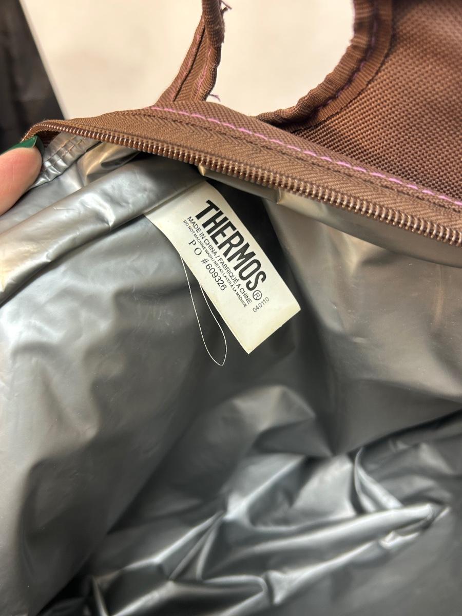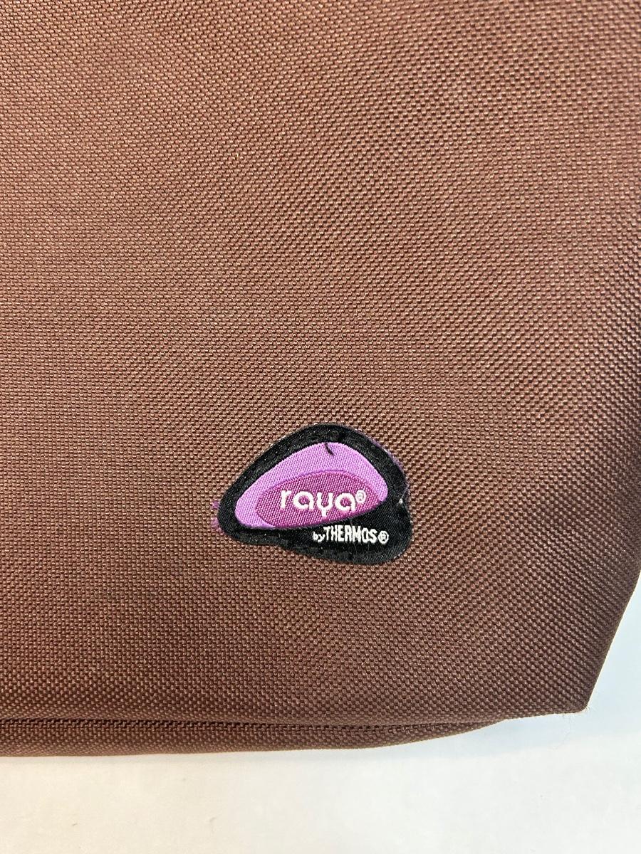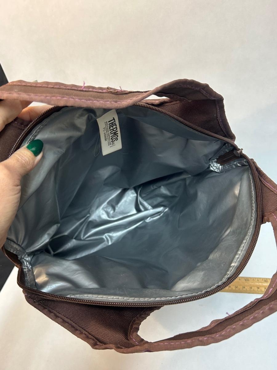 Thermos Brand Soft Sided Lunch Box Bag Brown with Purple Pink Yellow Stripes. One outside pocket and a large zipper pocket center. In good condition.