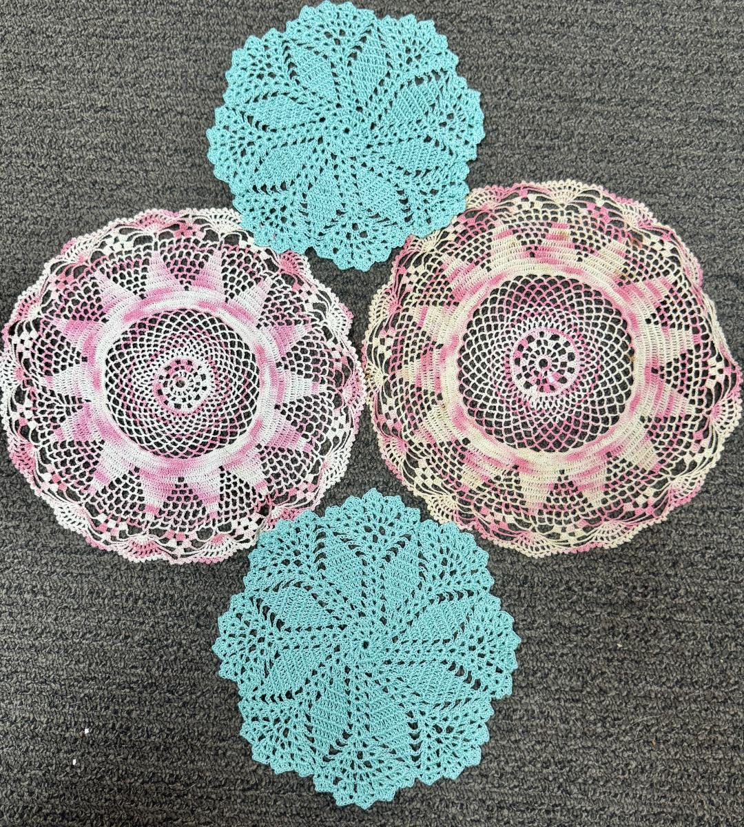 4 pc LOT - Vintage Handmade Doilies Pink Swirl & Mint Green Round