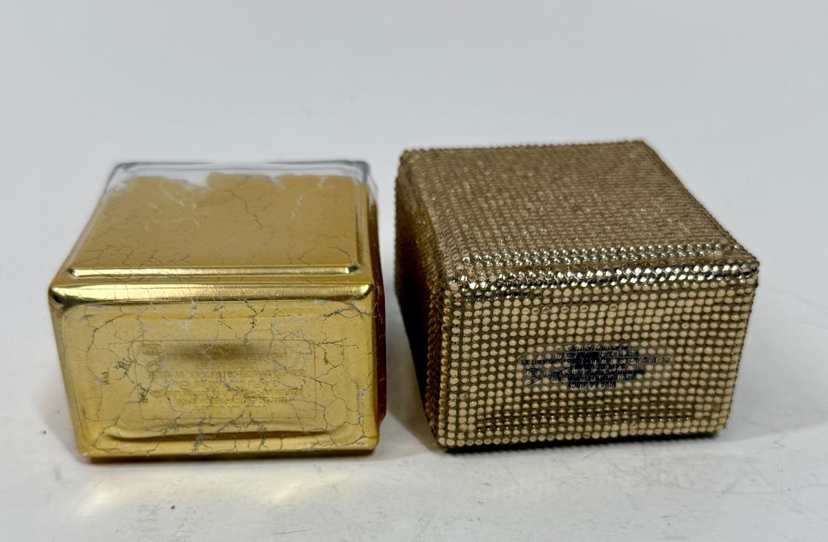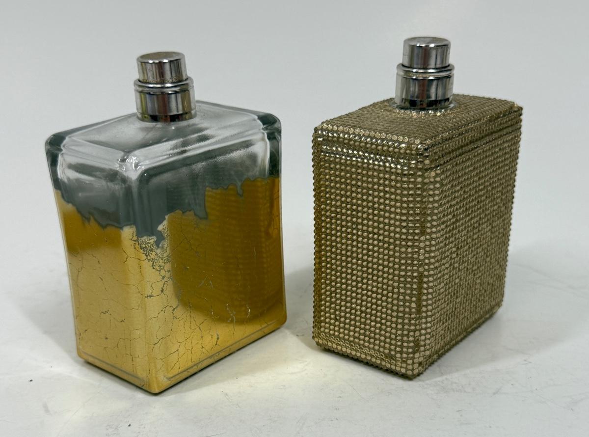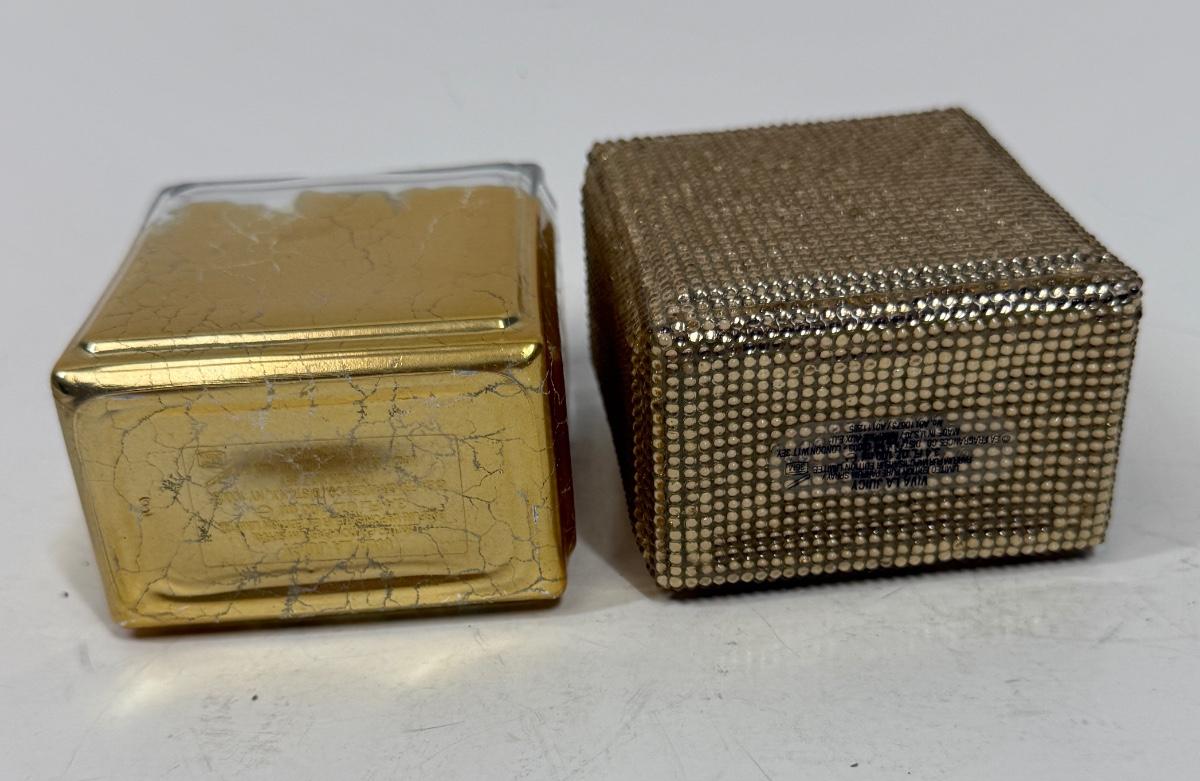 Viva La Juicy Limited Edition 3.4oz Parfum Spray with gold beaded glass bottle (still contains some perfume), and another Viva La Juicy Limited Edition 3.4oz Parfum Spray with gold gilt glass bottle (worn/crackled finish), that one appears to be empty.