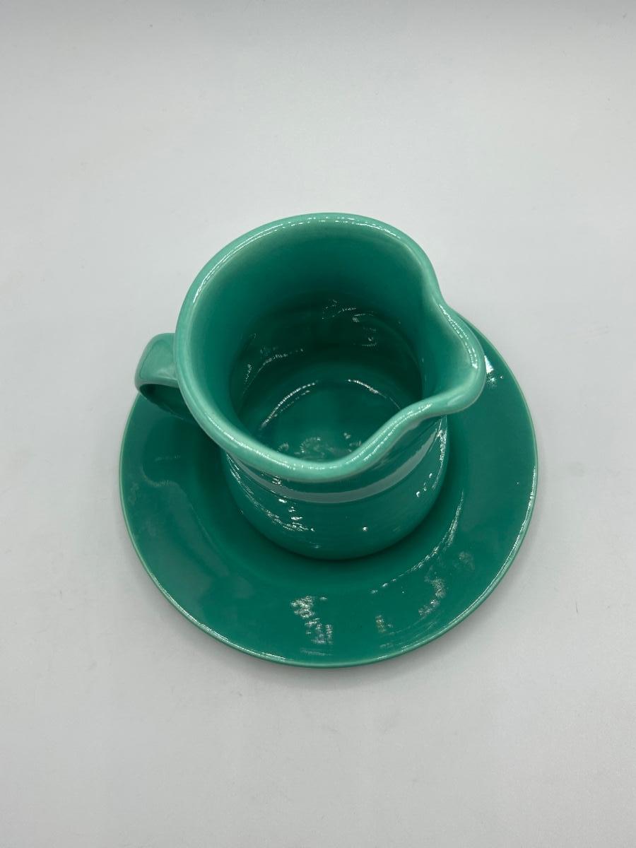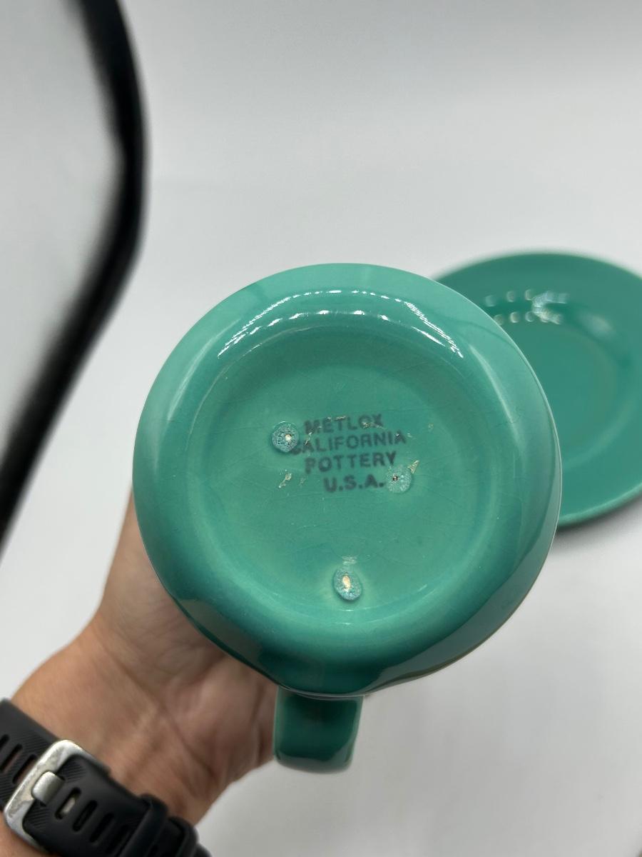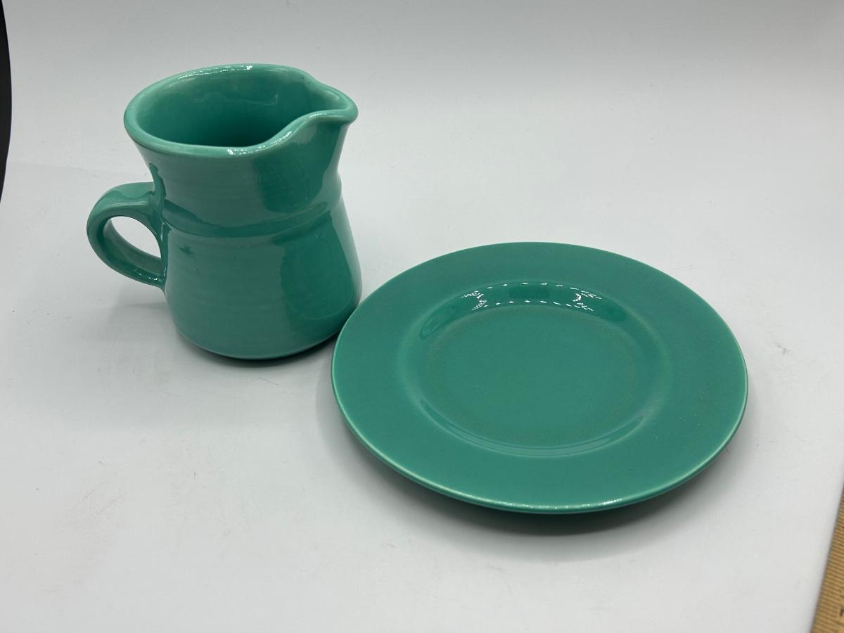 Vintage Metlox Poppy Trail California Pottery Blue Green Turquoise Small Pitcher and Saucer Drip Plate. Slightly darker than other turquoise pieces up for auction. In good condition.