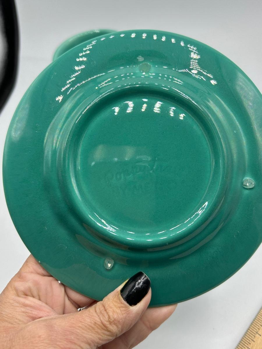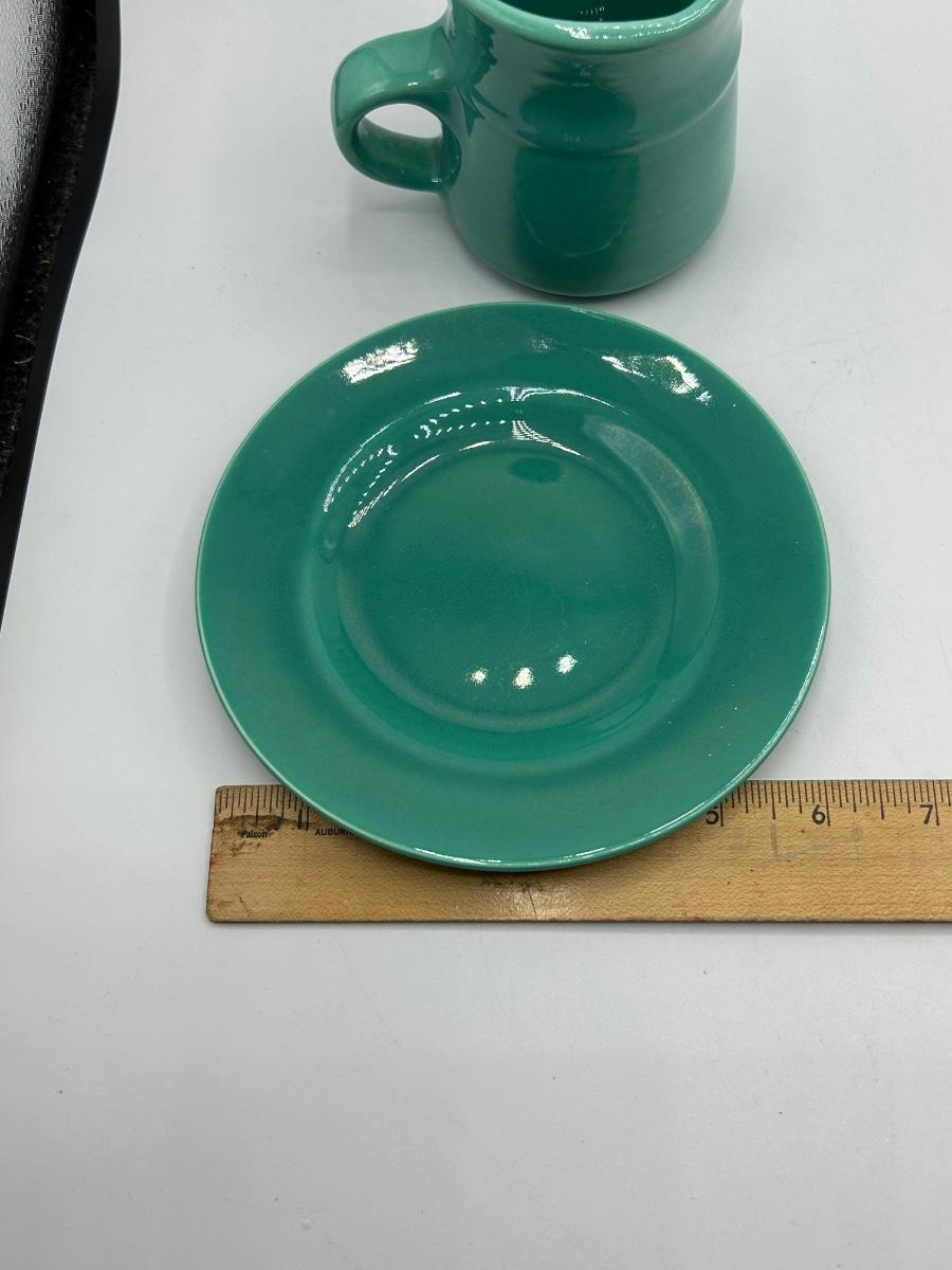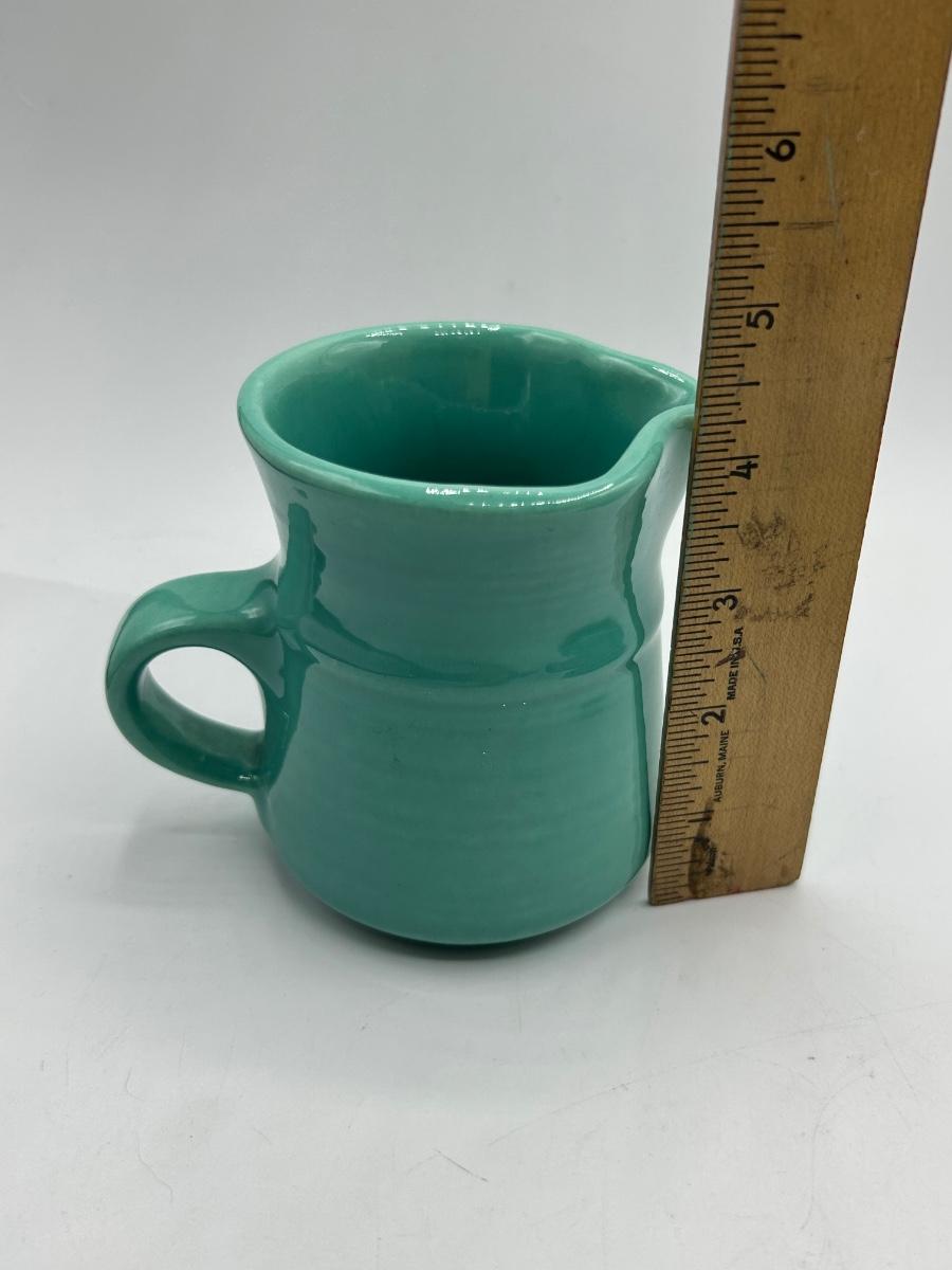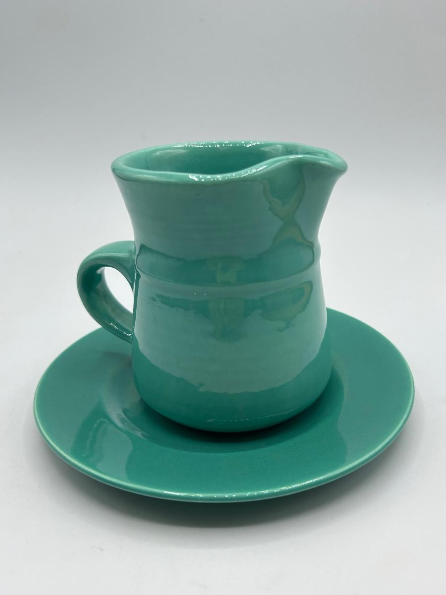 Vintage Metlox Poppy Trail California Pottery Blue Green Turquoise Small Pitcher and Saucer Drip Plate. Slightly darker than other turquoise pieces up for auction. In good condition.