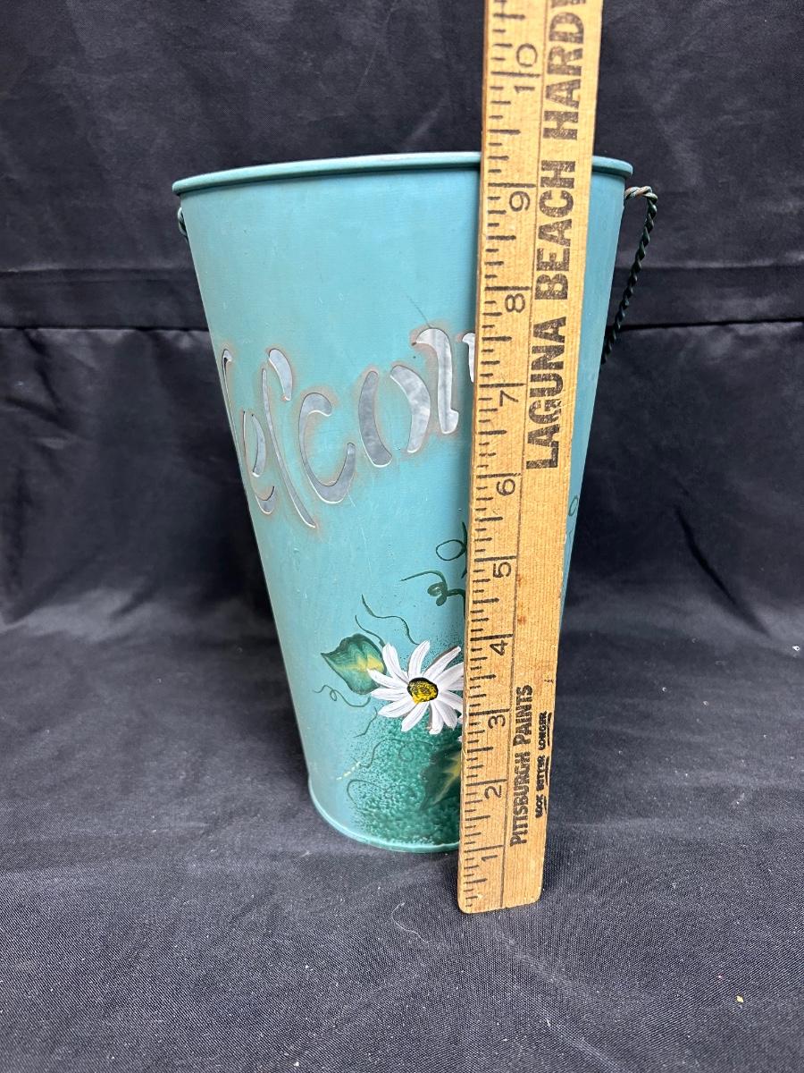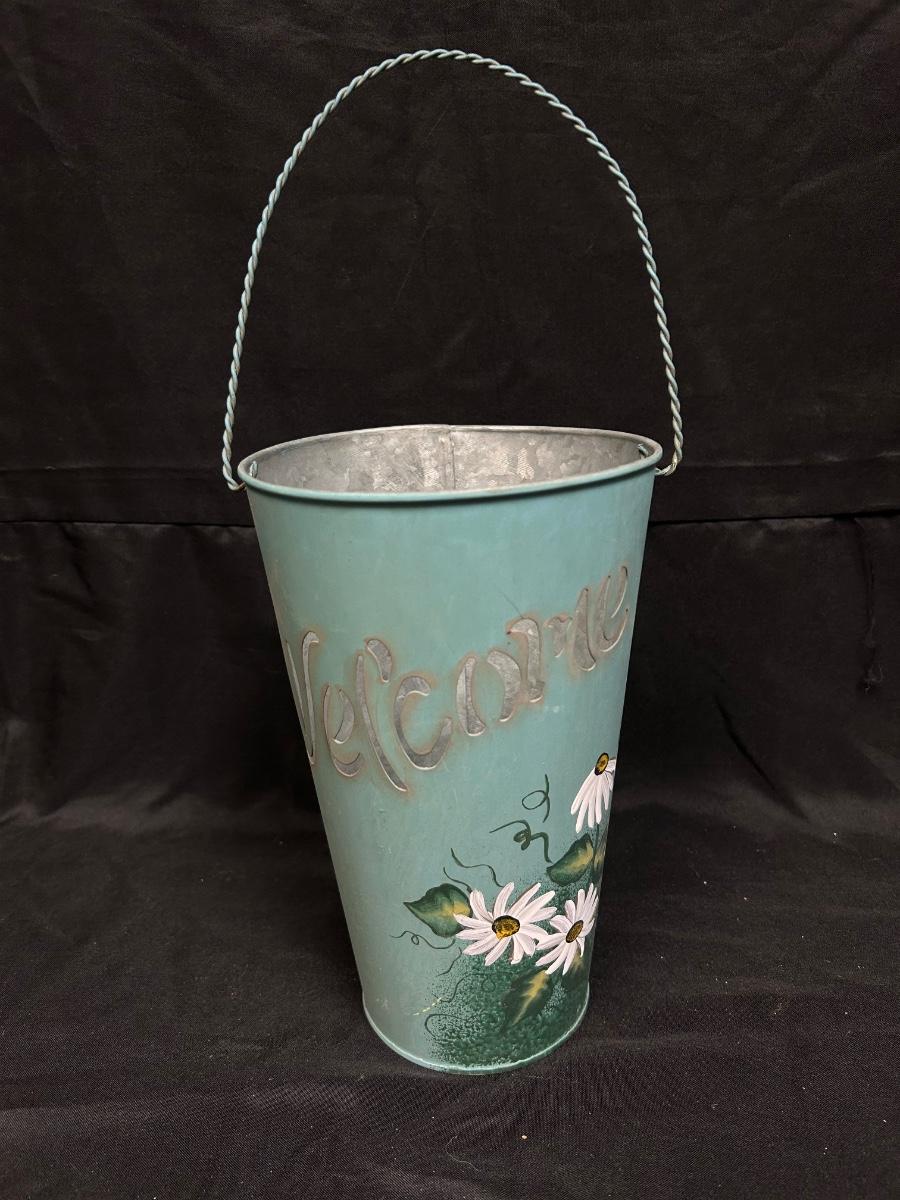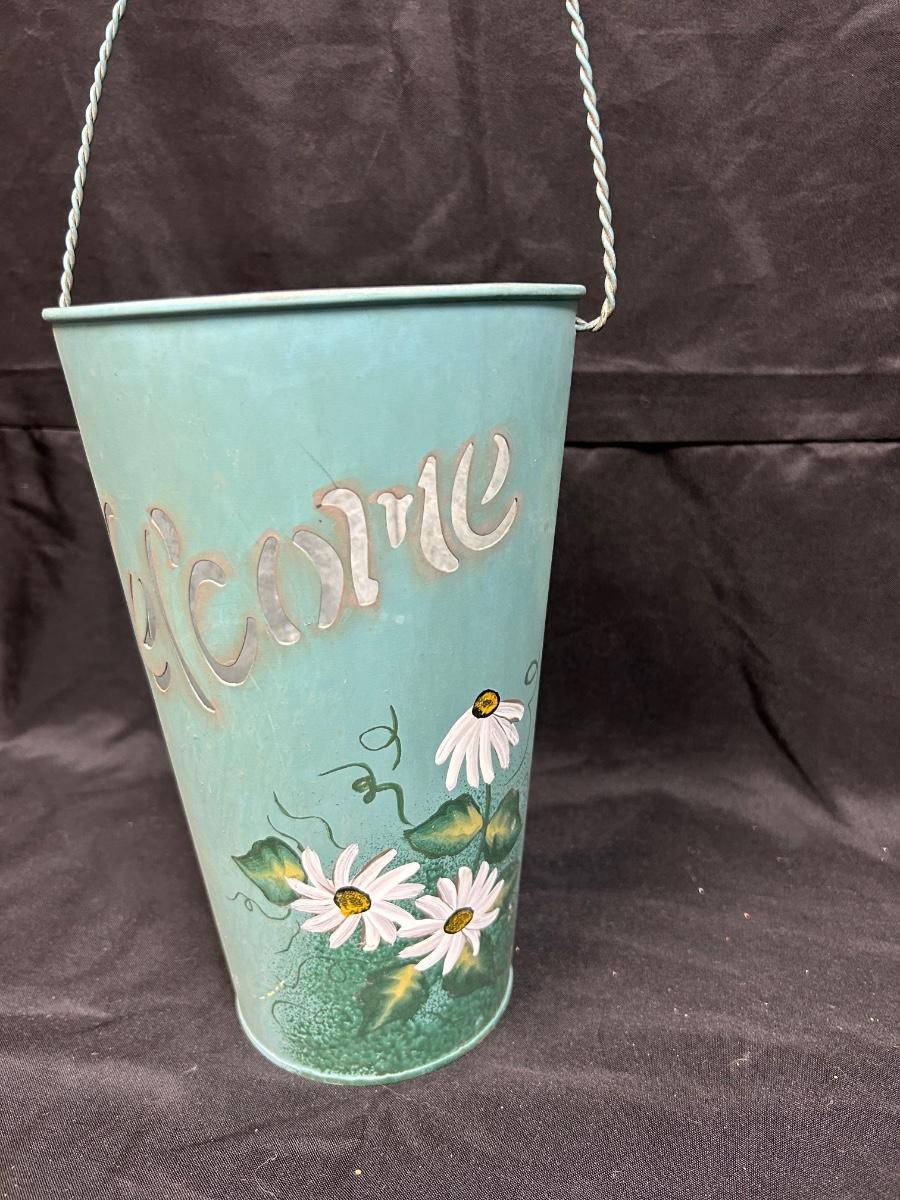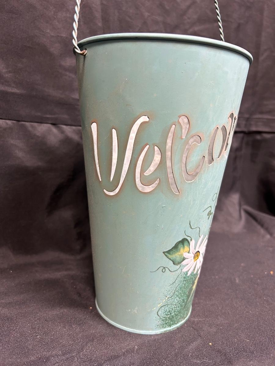 Welcome Cut Out Daisy Painted Metal Bucket Planter Garden Yard Art. Lightly weathered, displays good.