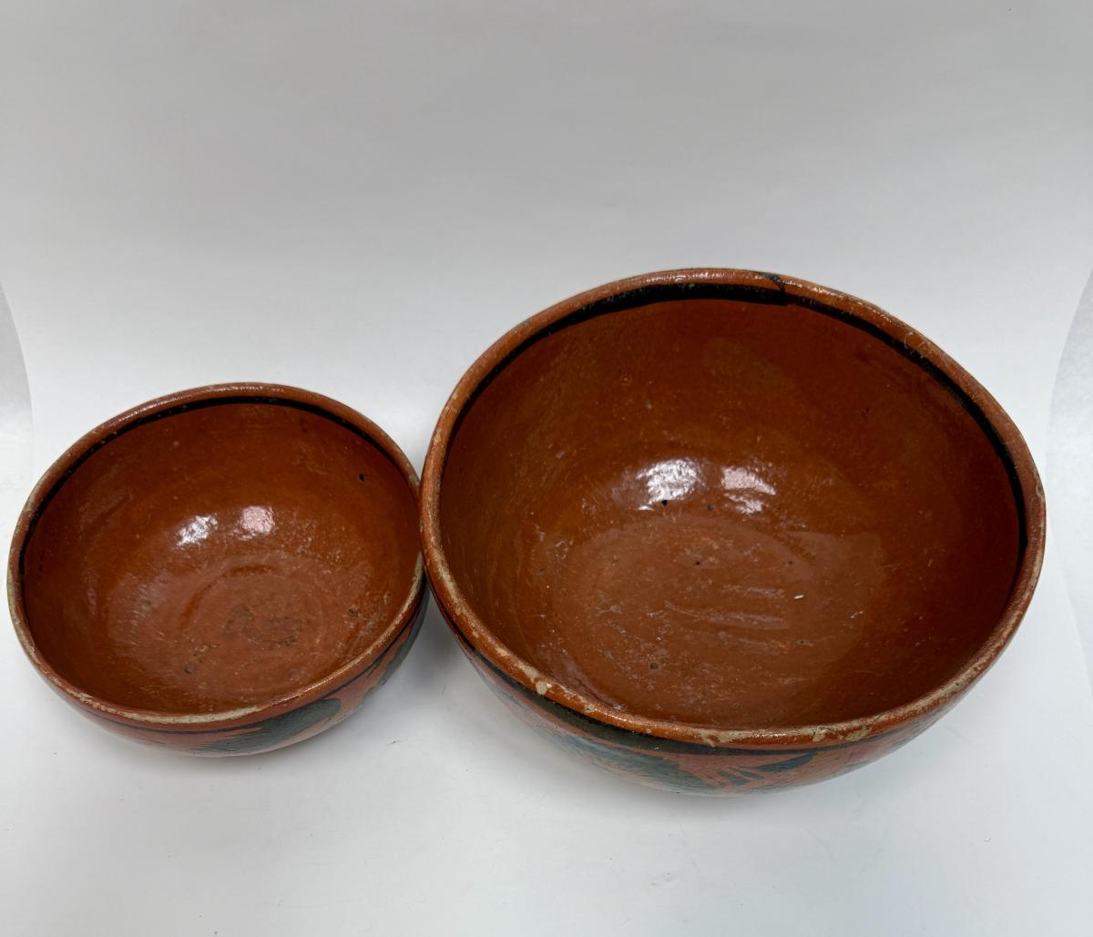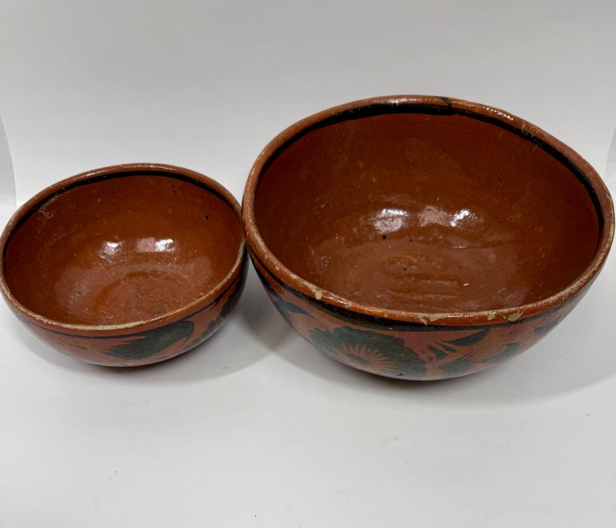 Vintage Handmade Mexican Redware Clay Pottery Serving Bowl Set of 2 Hand Painted