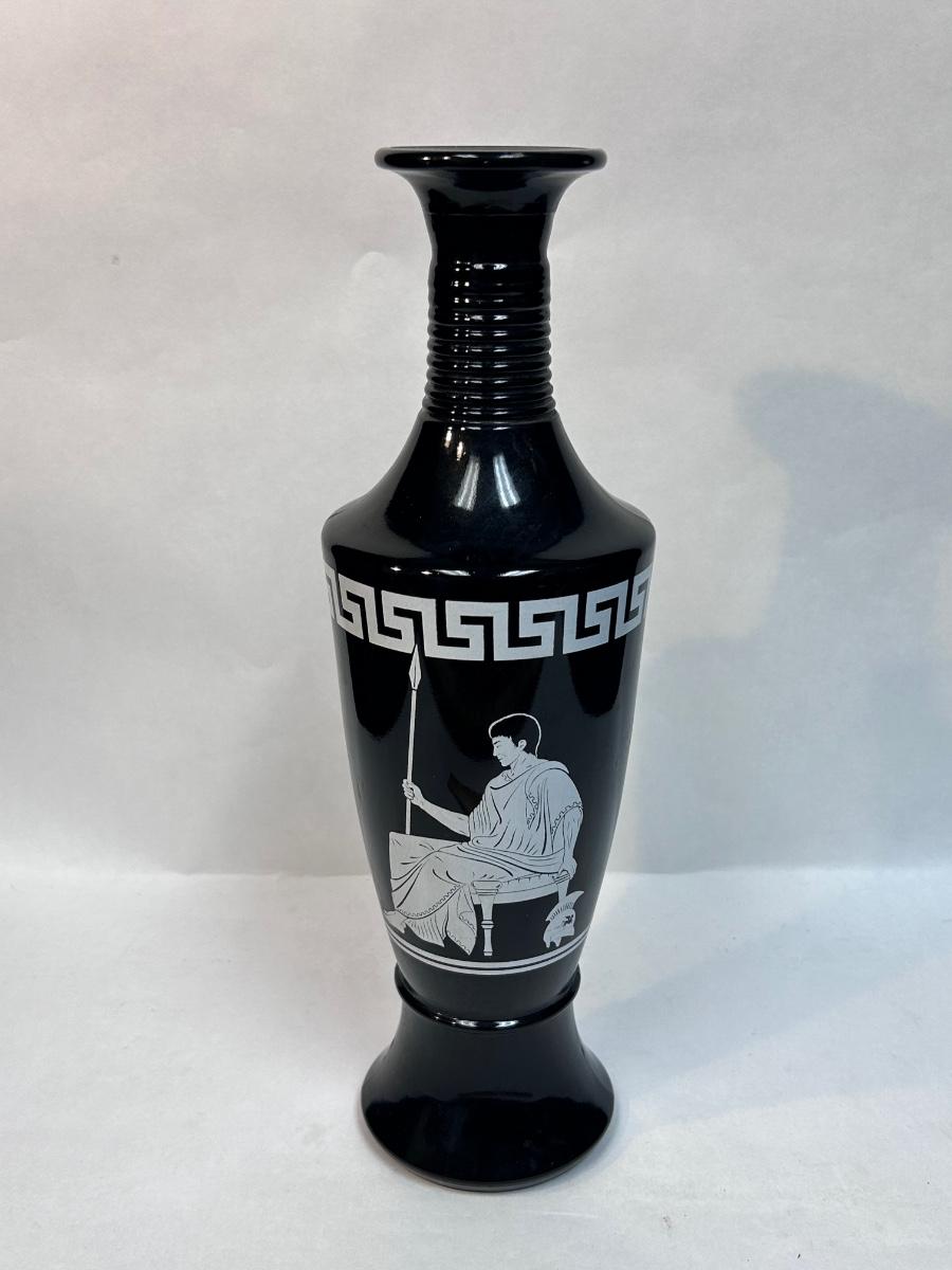 Vintage Black Glass Decanter Bottle Vase Greek Roman Man Solider with Spear. Black glass not ceramic. In good condition, no chips found. Was originally a Jim Beam whiskey decanter. 12" size.