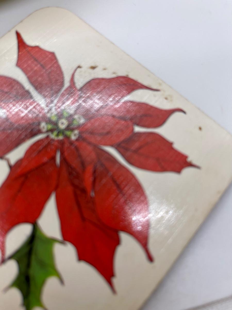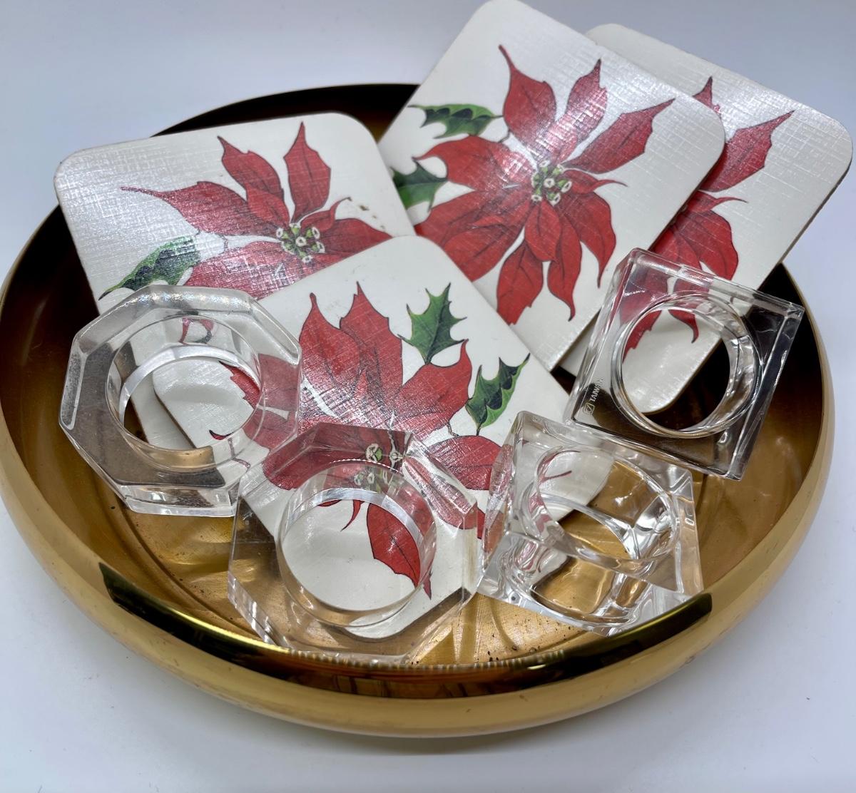 Copper Bowl, Poinsettia Coasters,  Lucite napkin rings, Mixed Tableware Lot