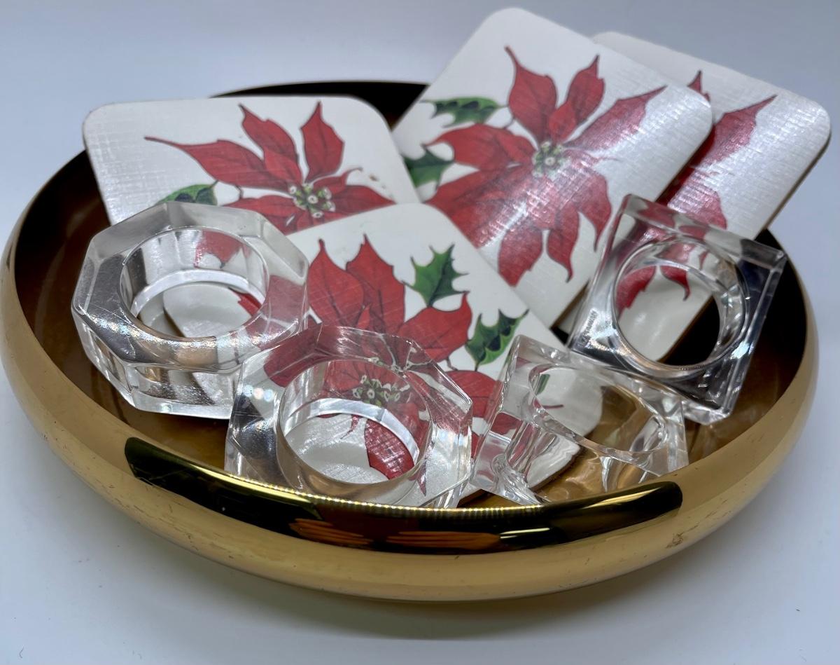 Copper Bowl, Poinsettia Coasters, Lucite napkin rings, Mixed Tableware Lot
