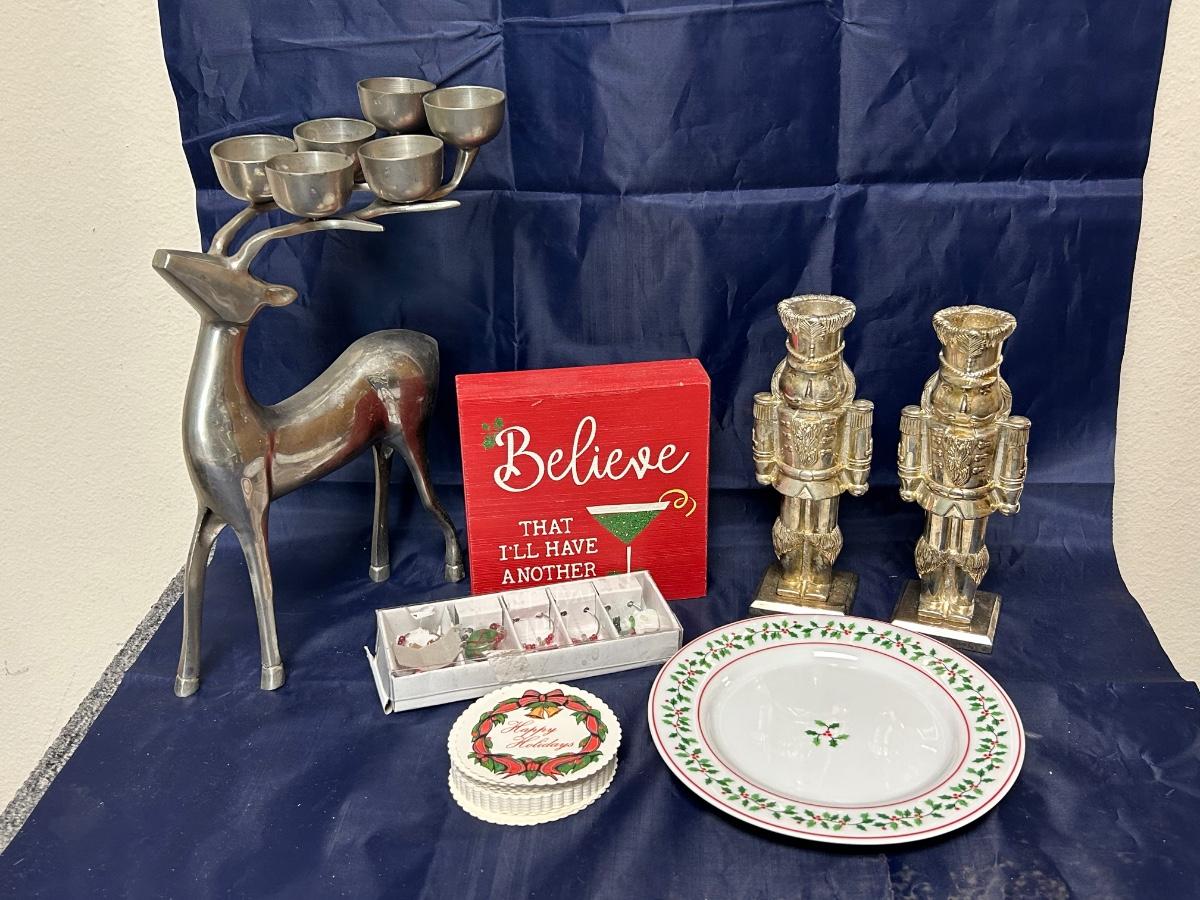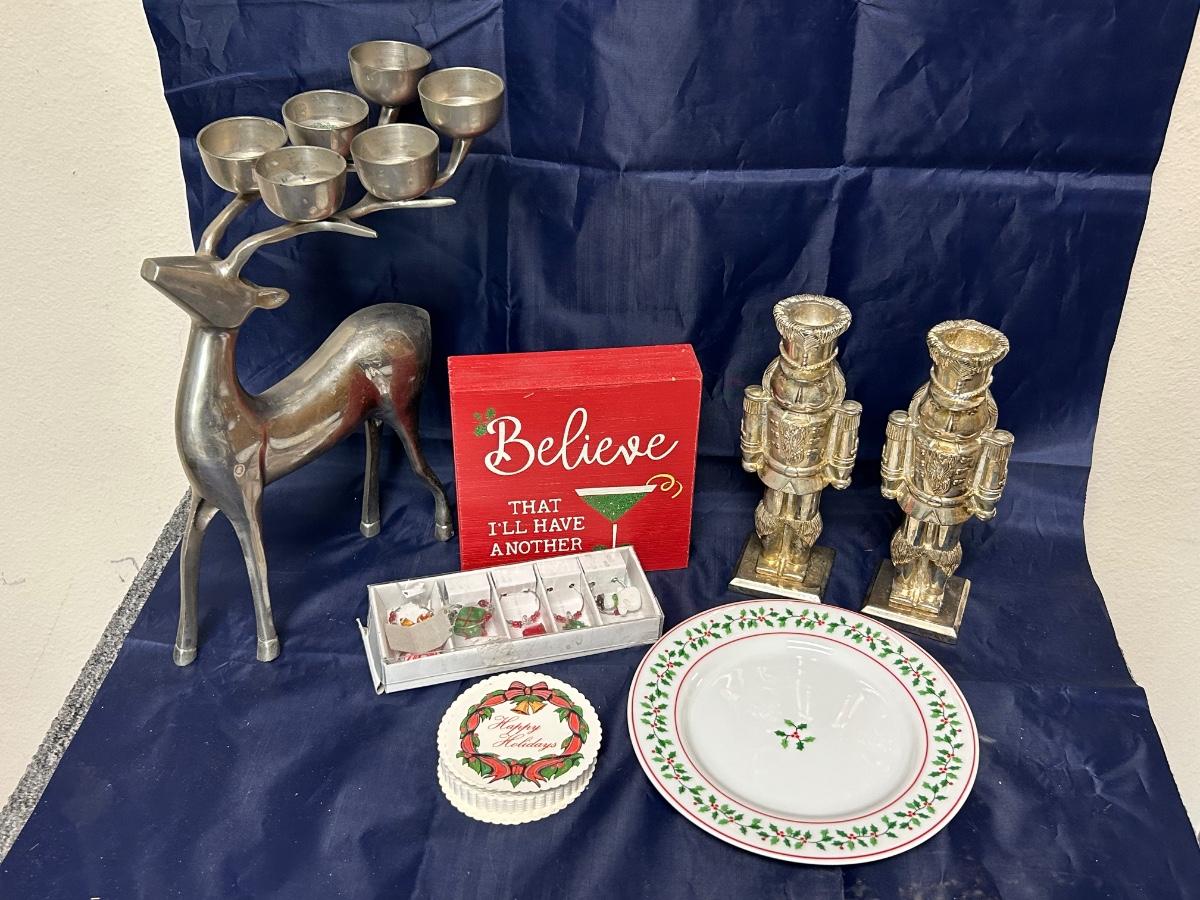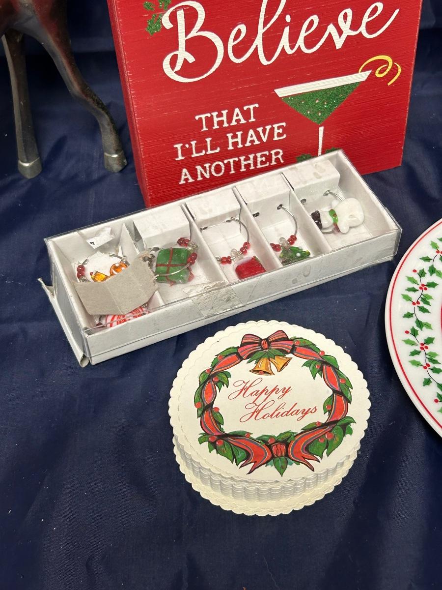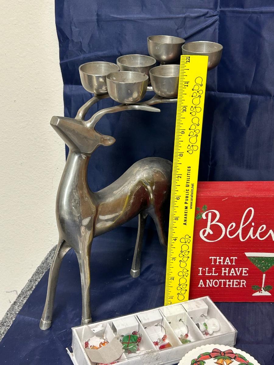 Christmas Holiday Seasonal Table Decor Lot. In good condition. Silver plate candle holders, wine glass markers, vintage coasters, and more.