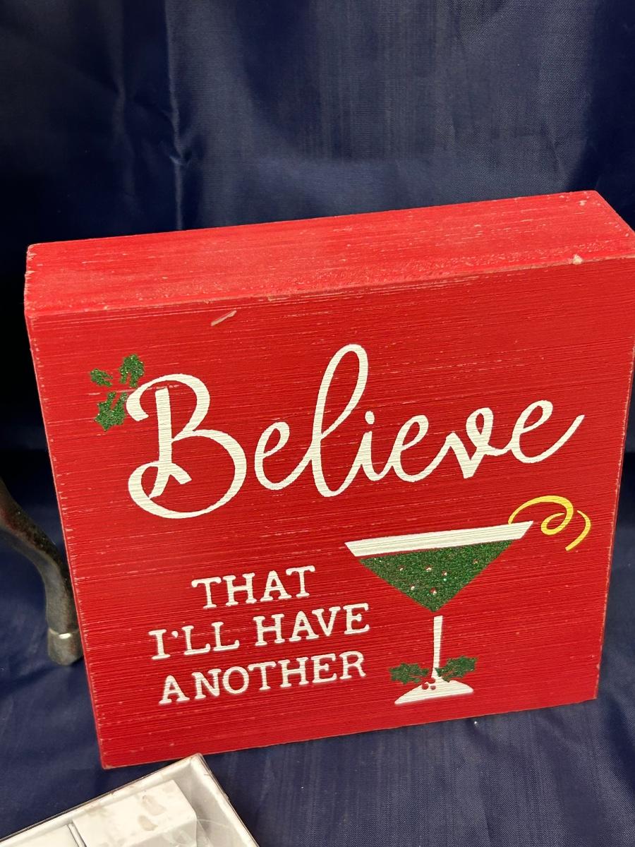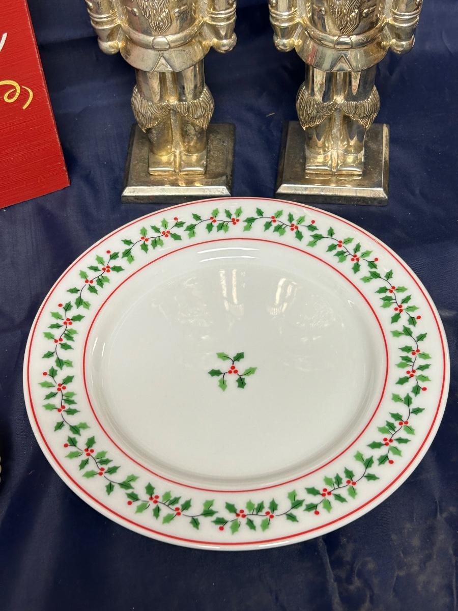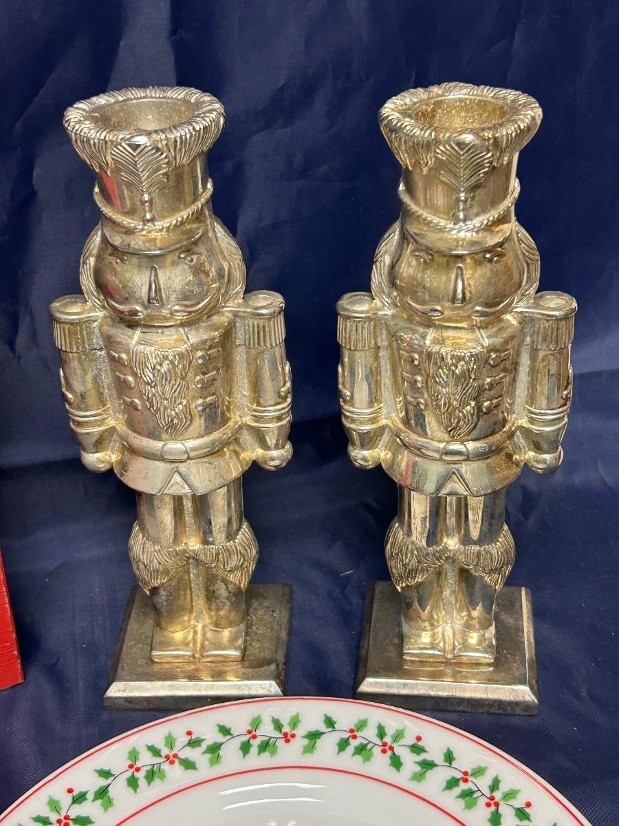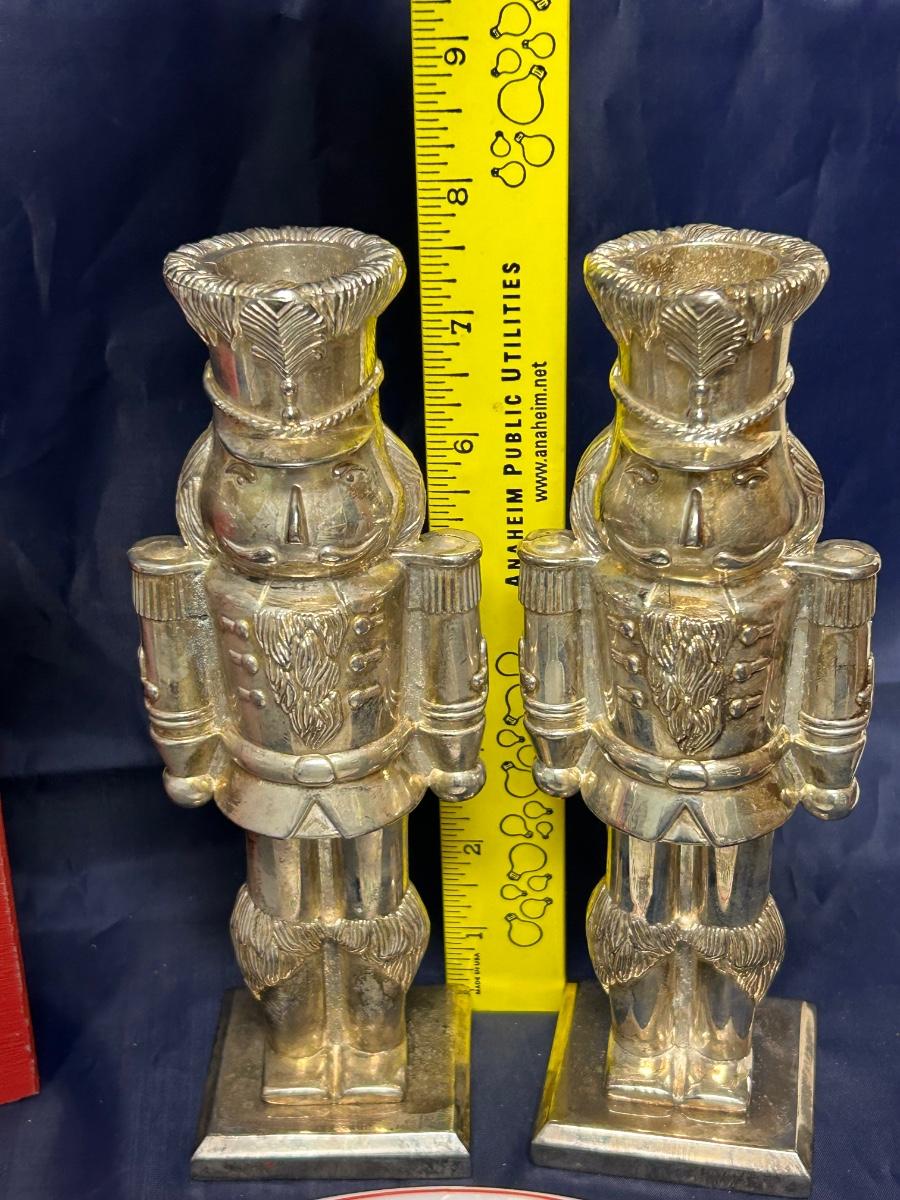 Christmas Holiday Seasonal Table Decor Lot. In good condition. Silver plate candle holders, wine glass markers, vintage coasters, and more.