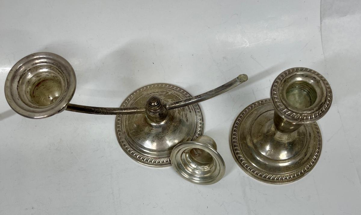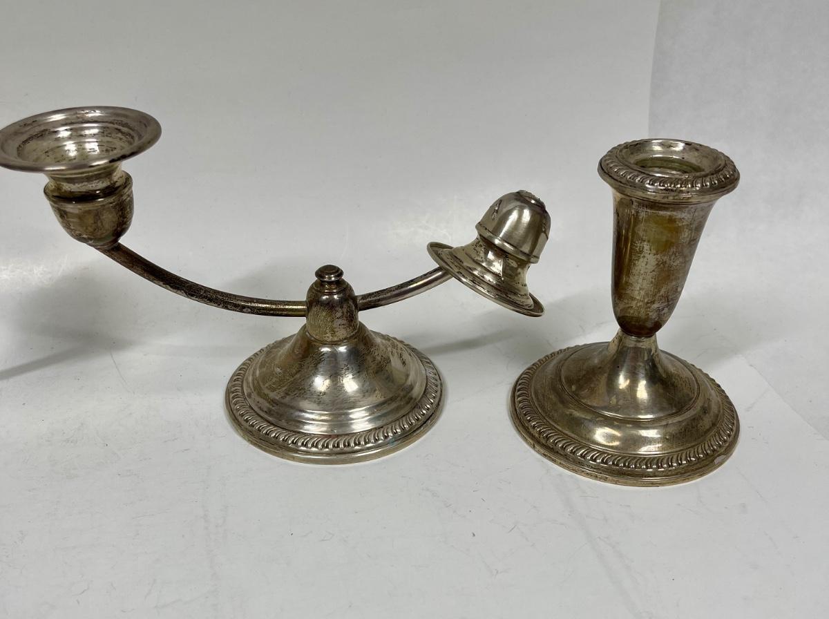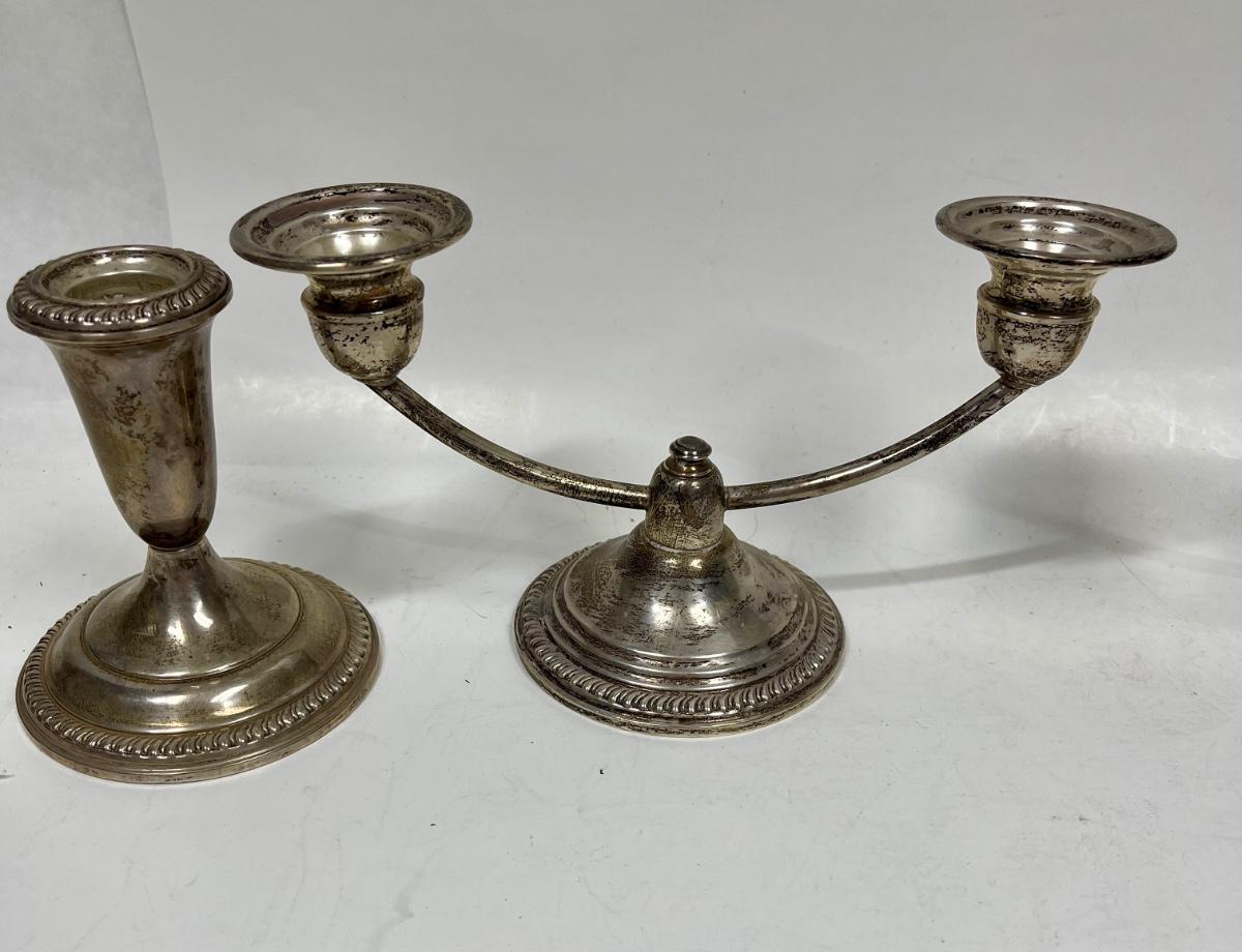 Vintage weighted candlesticks. One of the 2-candle candlesticks has a detached candleholder, which can be repaired. Some surface tarnish but in good condition.