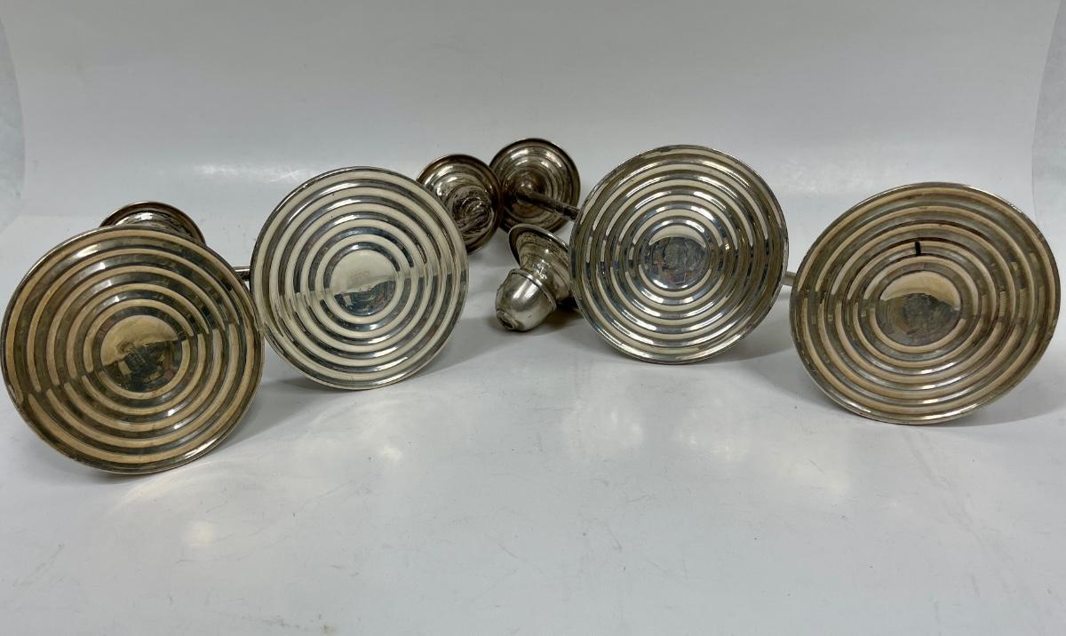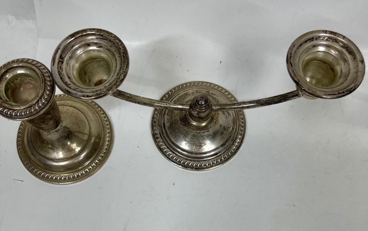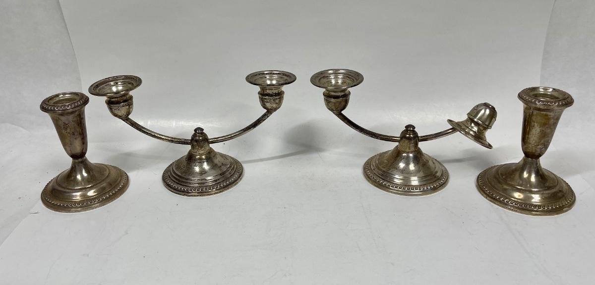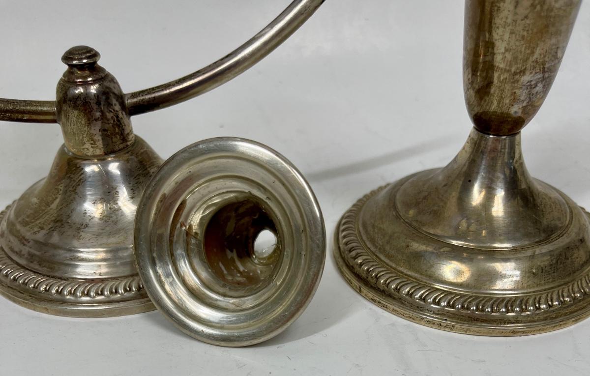 Vintage weighted candlesticks. One of the 2-candle candlesticks has a detached candleholder, which can be repaired. Some surface tarnish but in good condition.