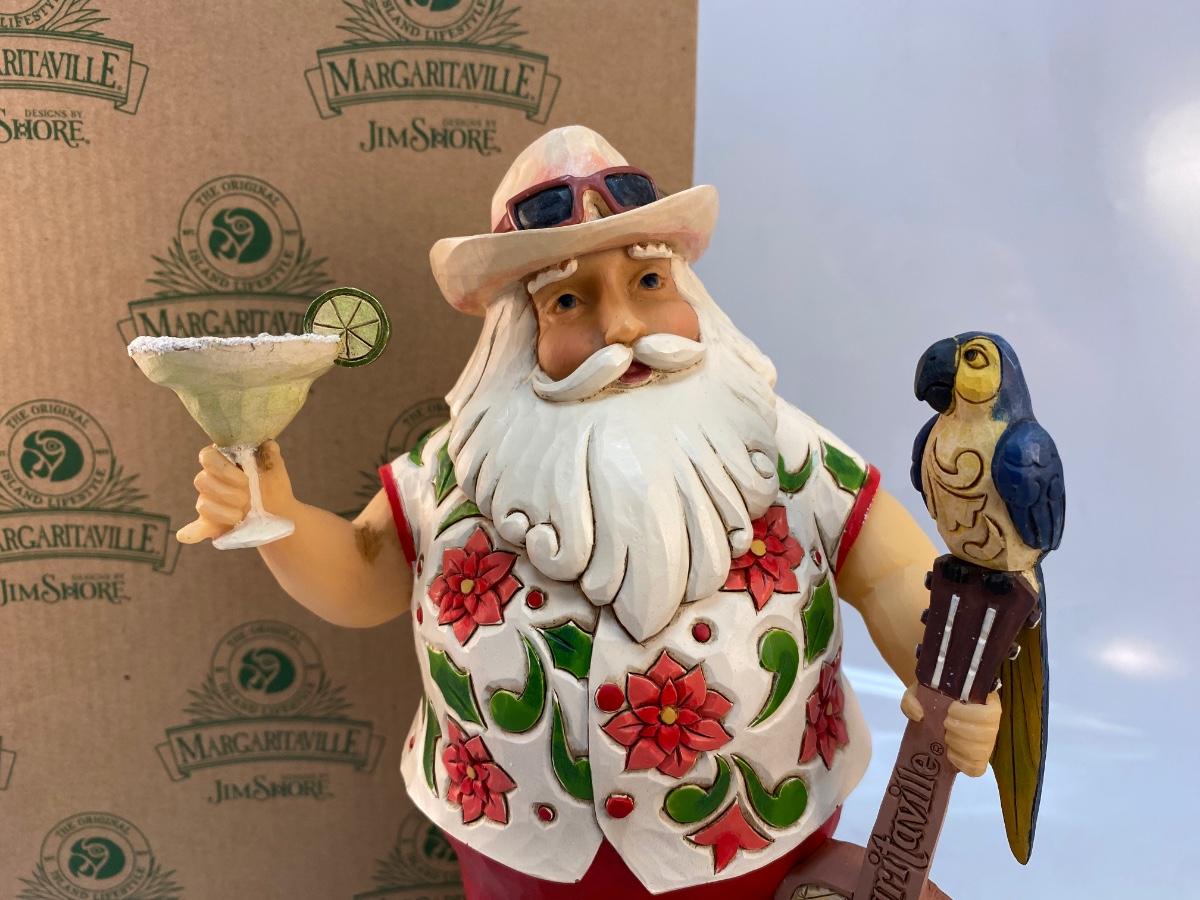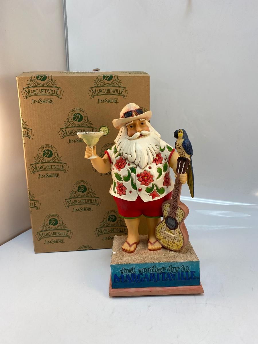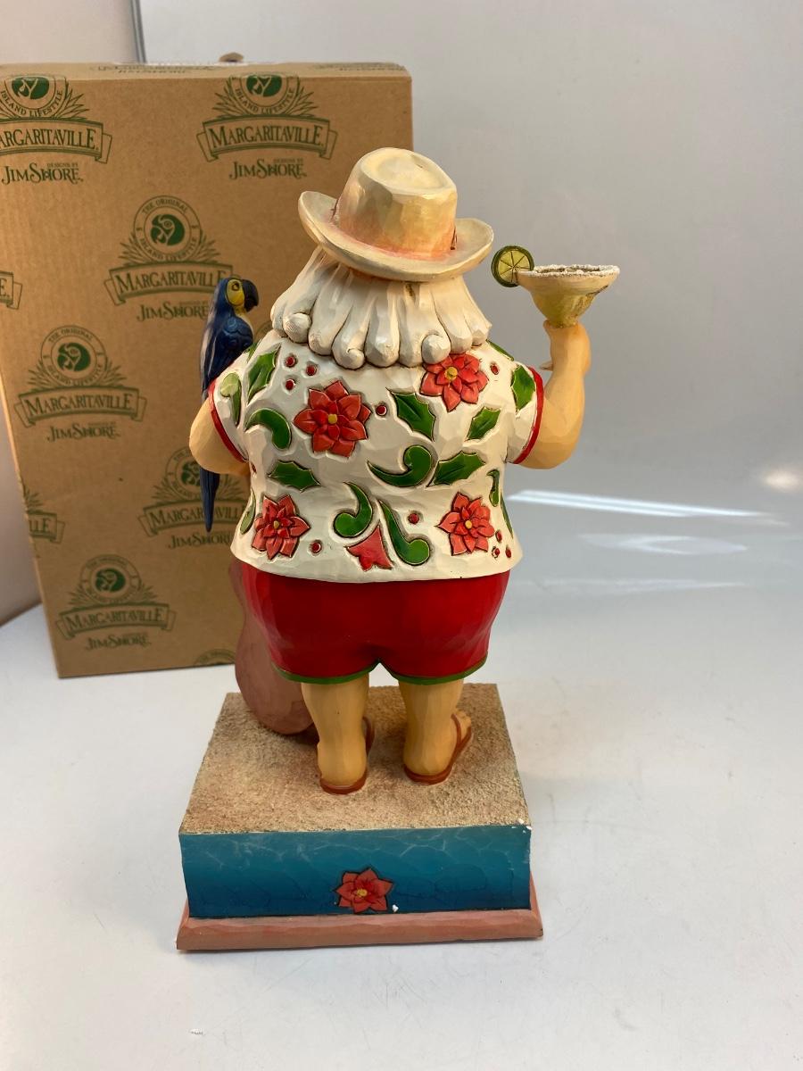 Jim Shore Margaritaville Santa Claus with Drink and Parrot Figurine Musical with Box. Looks great, displays nice. Plays Margaritaville but is untested, needs new batteries, terminal is clean no corrosion. Comes with original box.