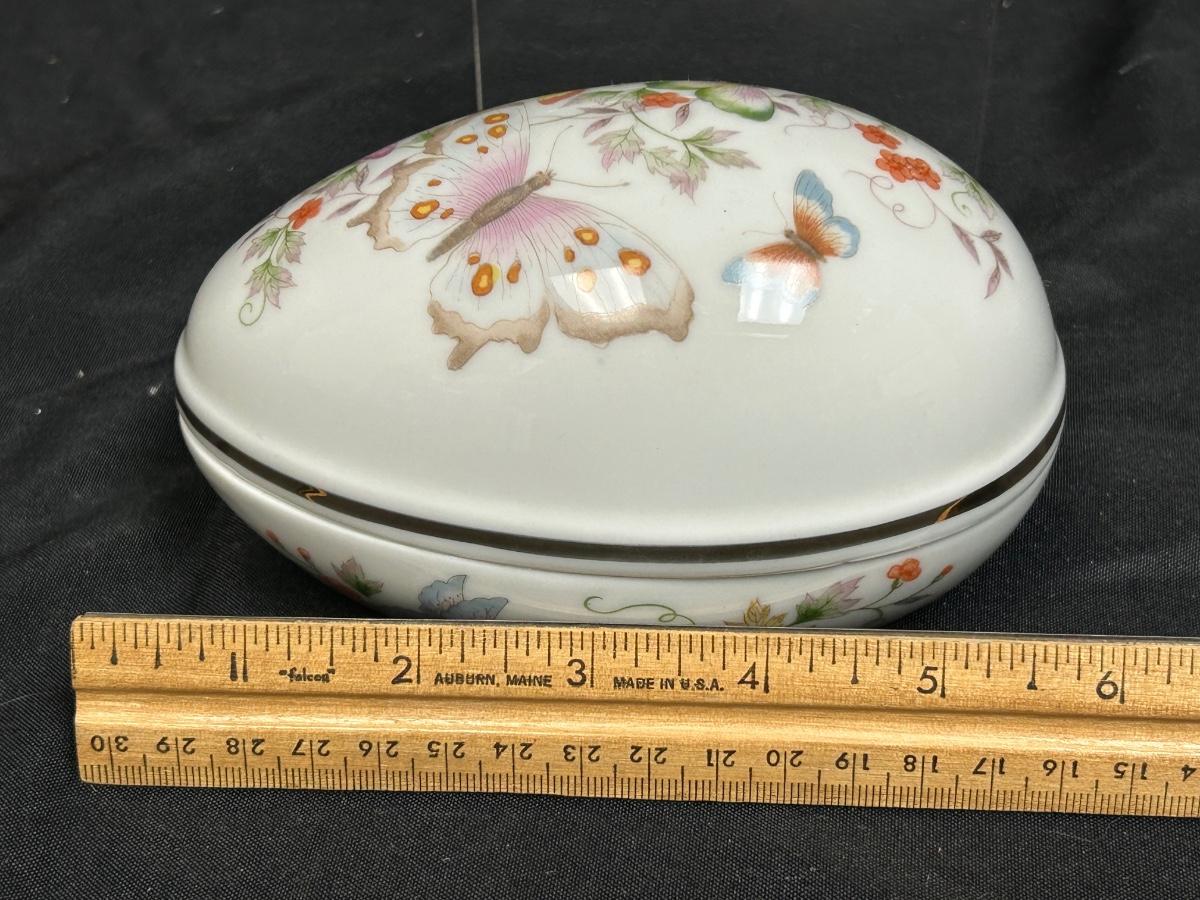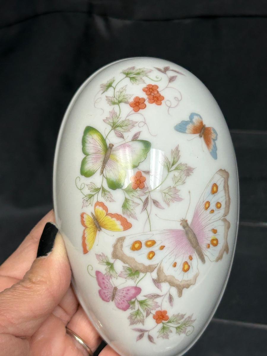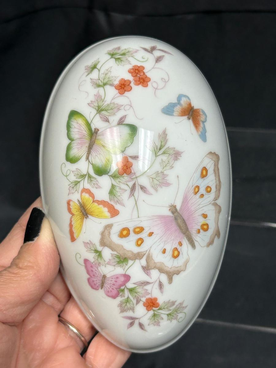 Vintage Avon Porcelain Egg Shaped Trinket Box Flowers and Butterflies with 22k Gold Trim