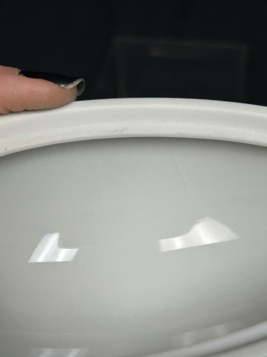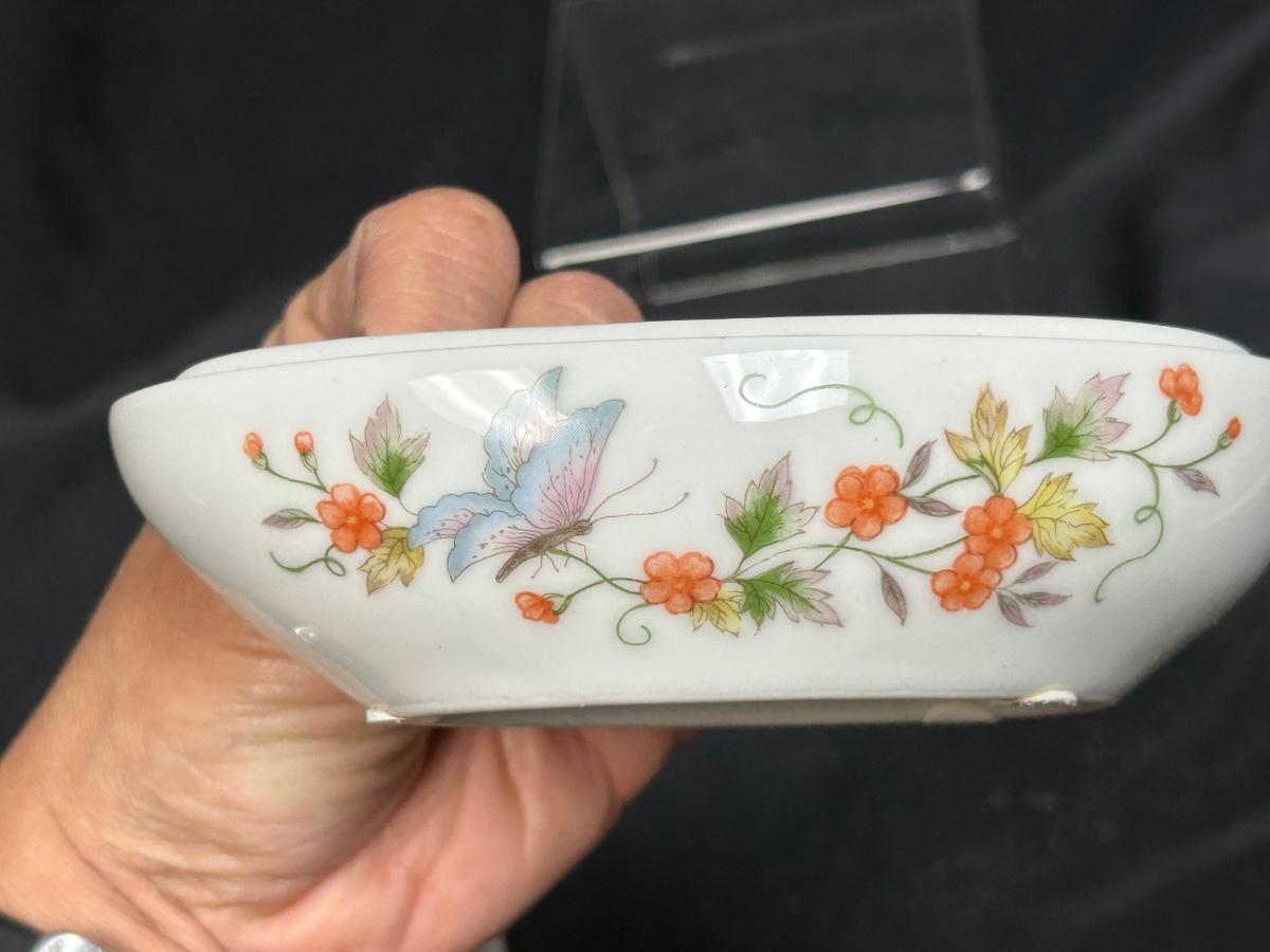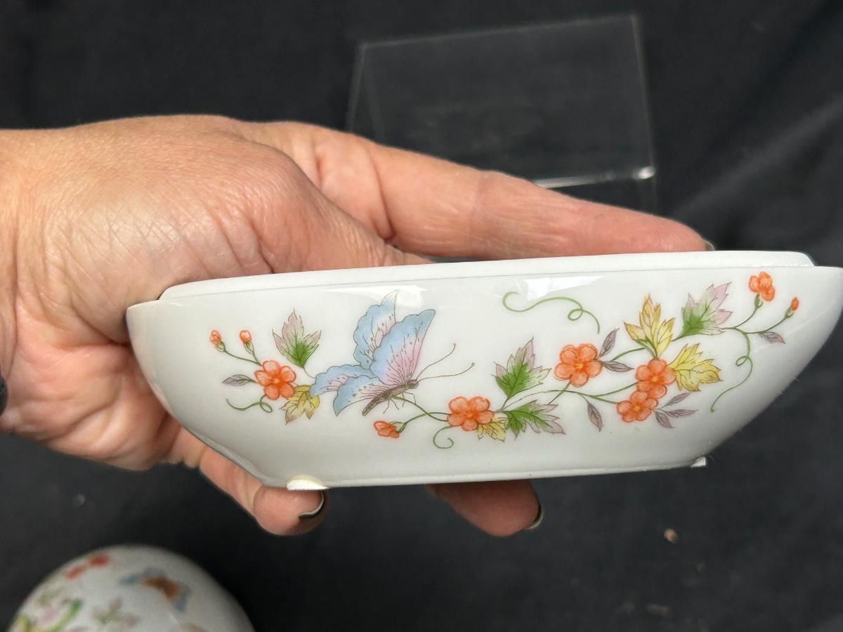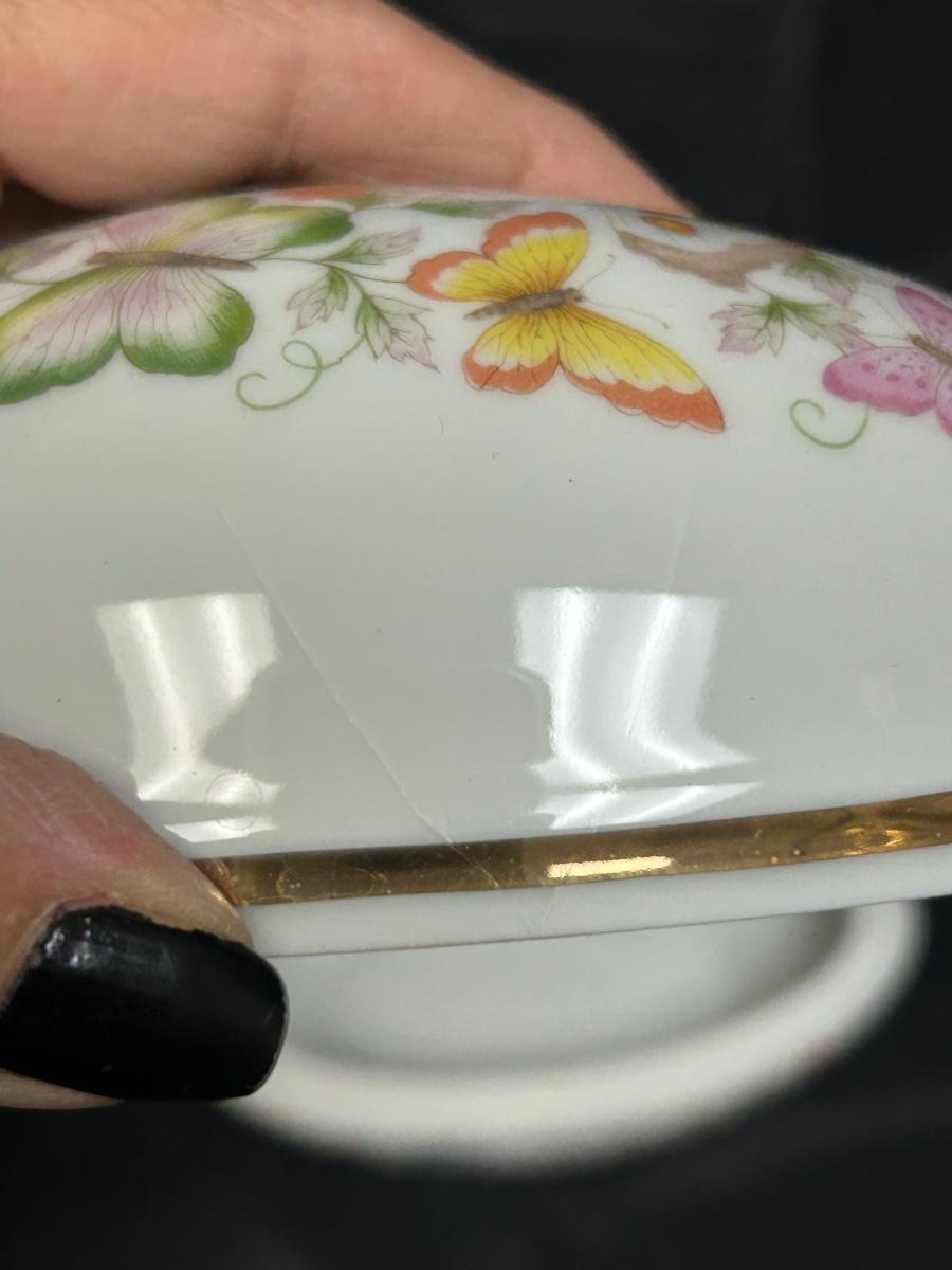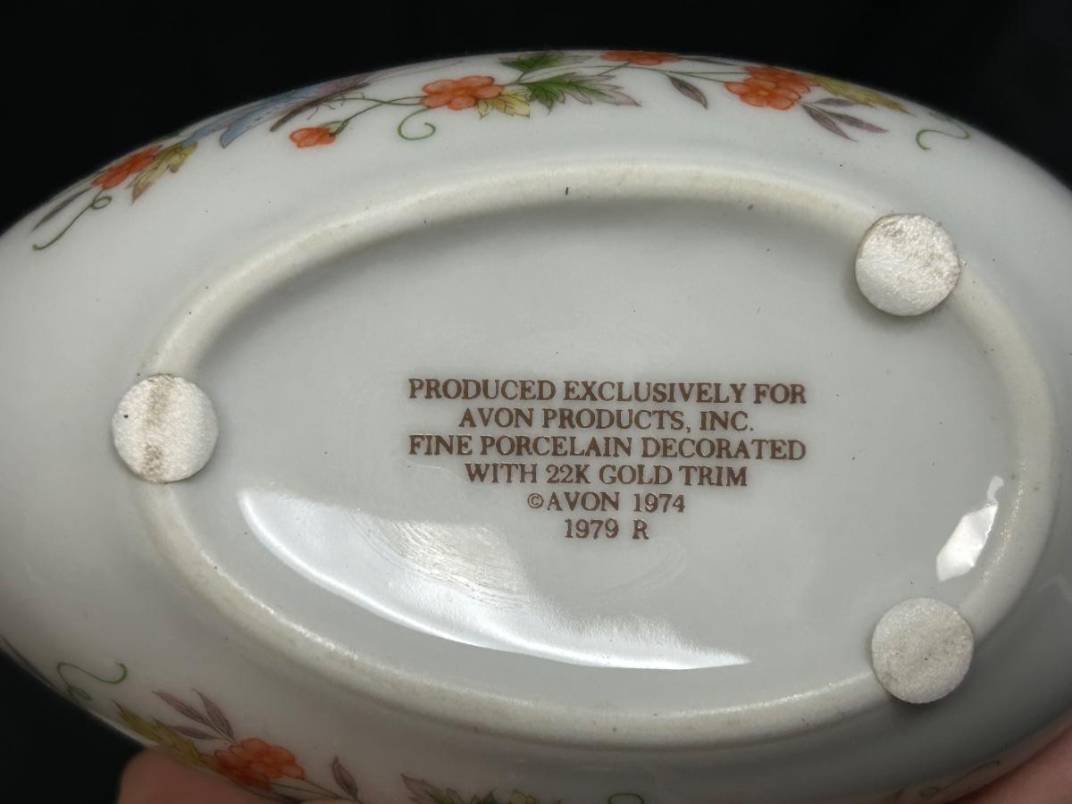 Vintage Avon Porcelain Egg Shaped Trinket Box Flowers and Butterflies with 22k Gold Trim. In good vintage condition. From the late 1970s. About 6" size. There does seem to be a flea bite nick in edge that has a couple crack lines, does not affect the look or use of dish.