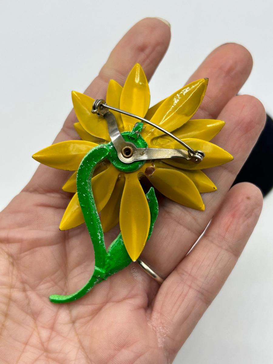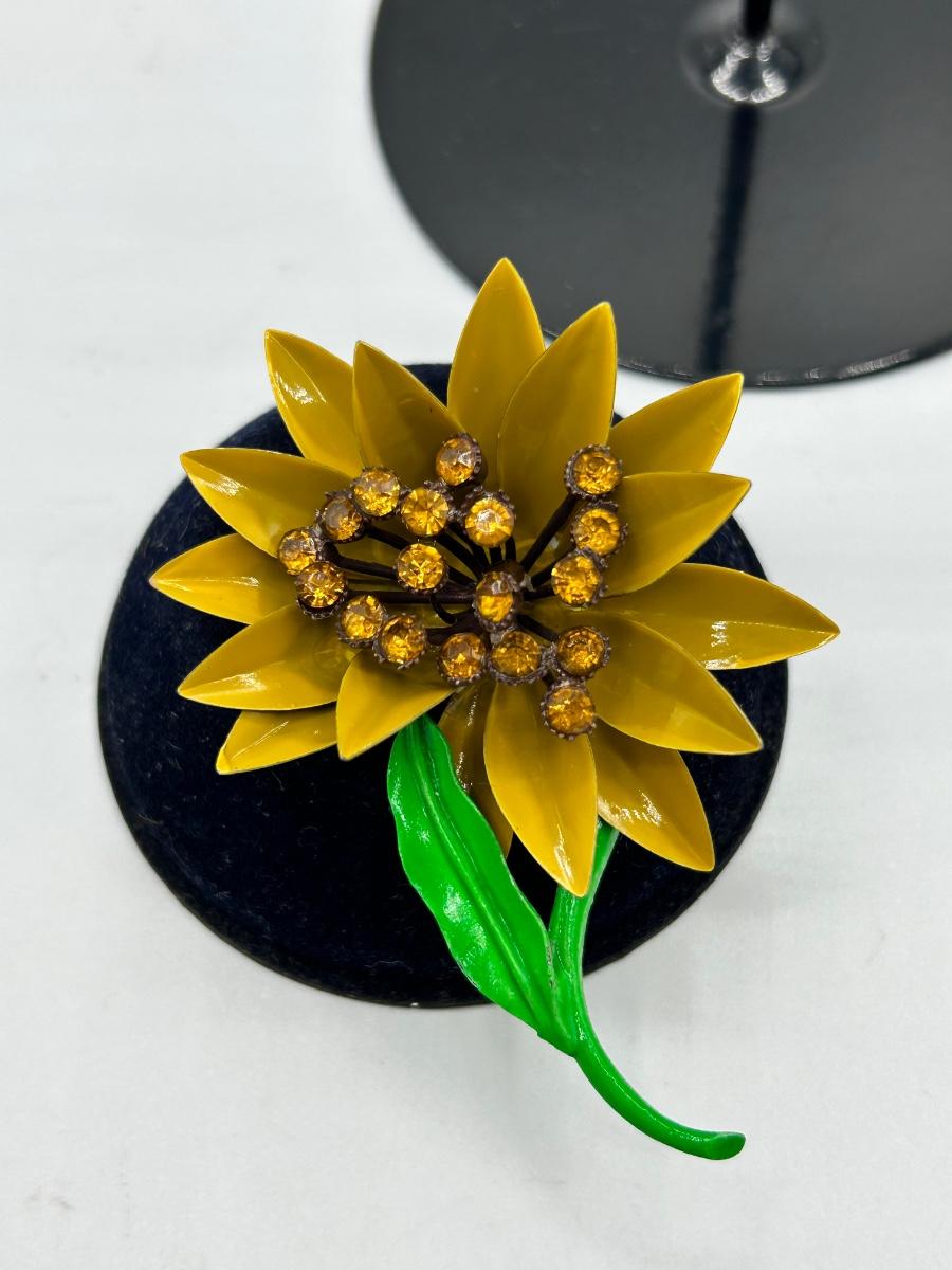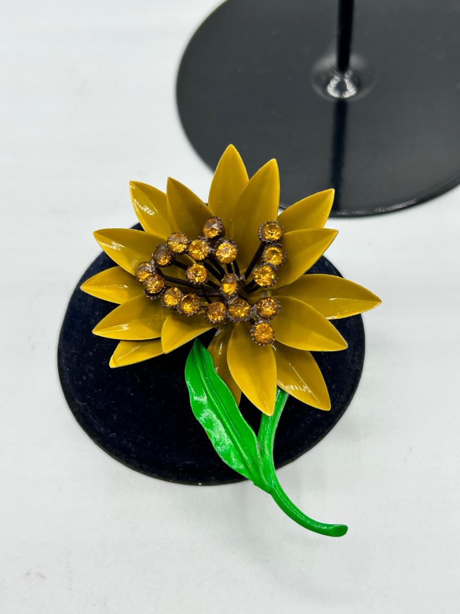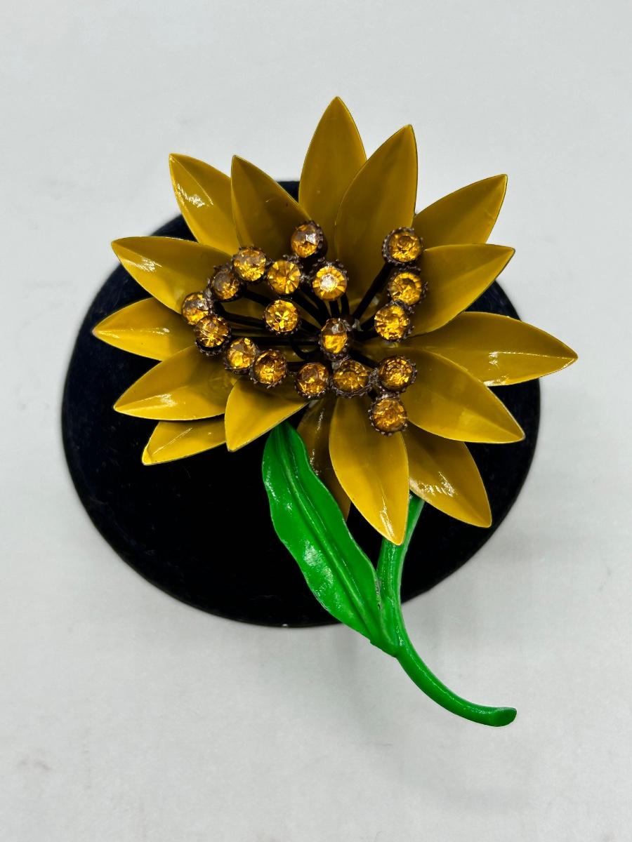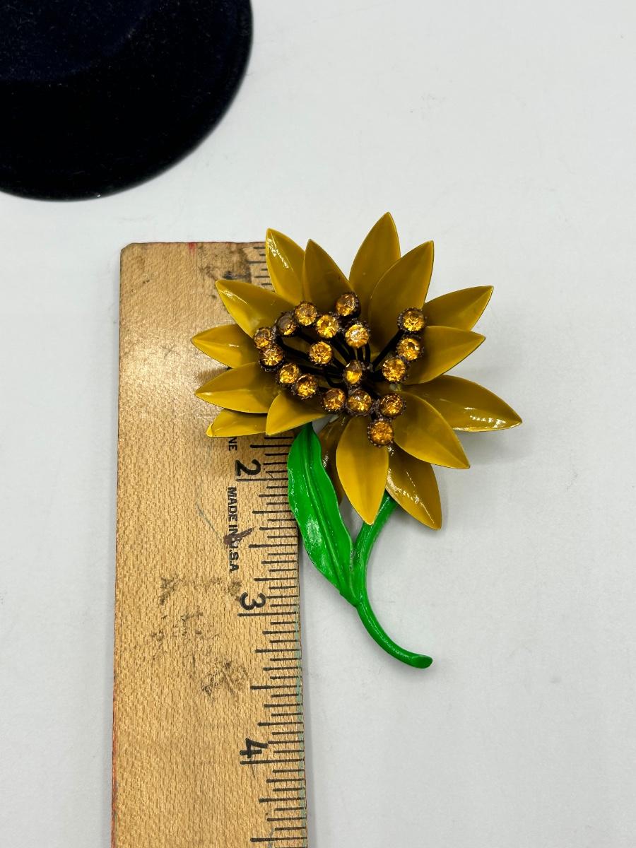 Vintage Enamel & Rhinestone Flower Daisy Pin Brooch. In good vintage condition. About 3.5" length.