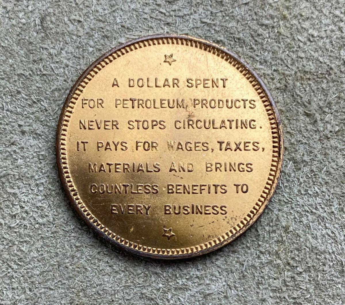 Here is a so-called dollar or token from the Petroleum Exhibit at the 1939-40 Golden Gate International Exposition...34mm..13g..Gold-plated bronze...The front side of the coin shows a petroleum rig tower in the center with two lines of text below and circular text surrounding...The reverse of the coin reads: 'A dollar spent for petroleum products never stops circulating. It pays for wages, taxes, materials and brings countless benefits to every business.'..Some verdigris and use wear on the front...as shown.