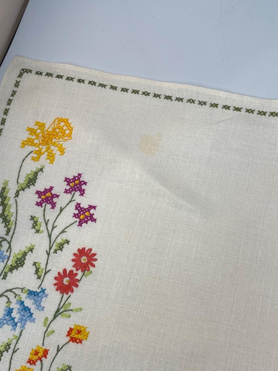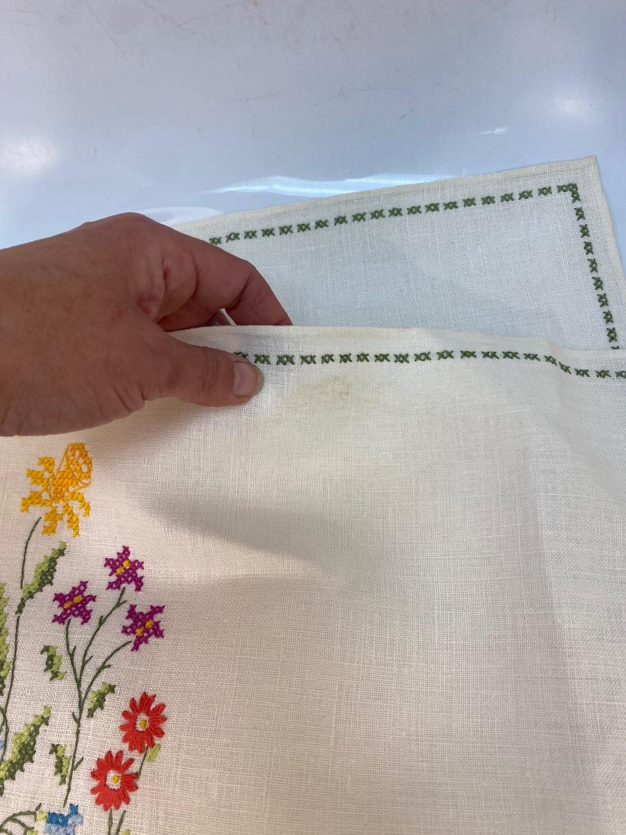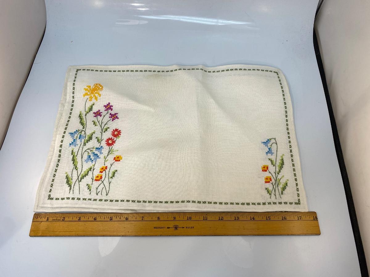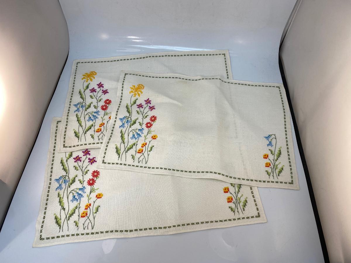Set of Three Floral Embroidered Cross-Stitched Placemats. In good condition. No major spots or stains but there is a very faint spot on two of the three. See photos for discoloration.