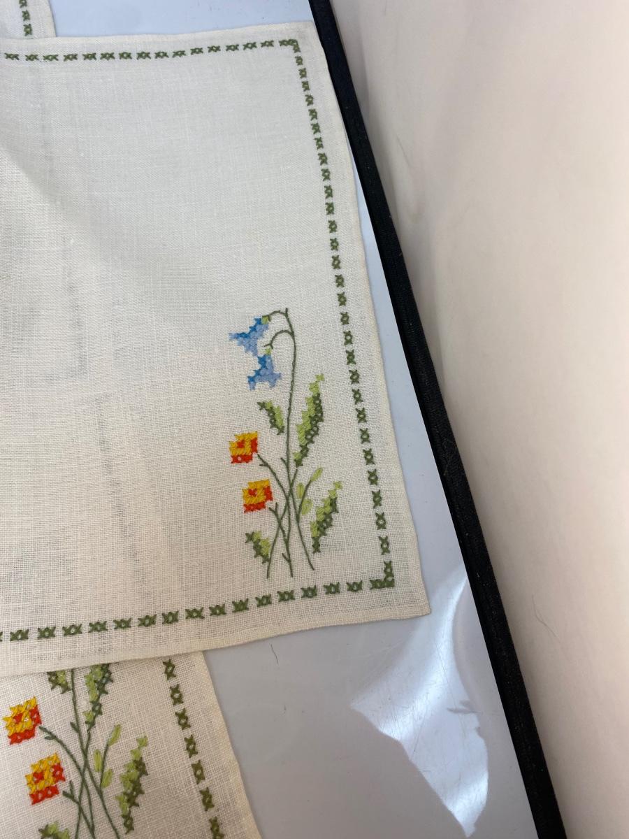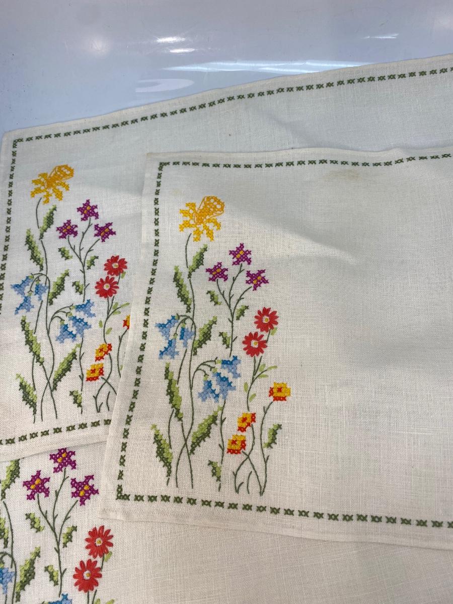 Set of Three Floral Embroidered Cross-Stitched Placemats Vintage linen tableware
