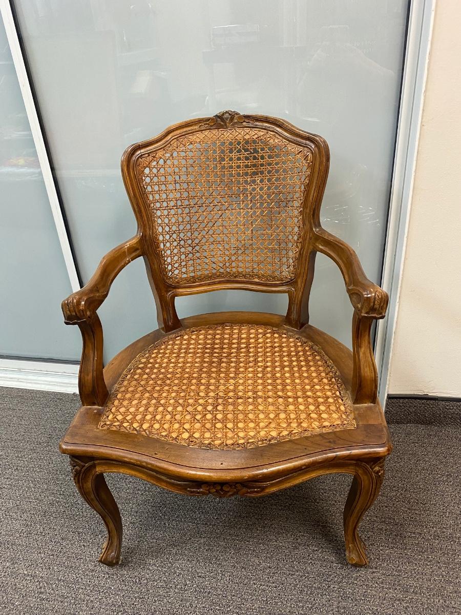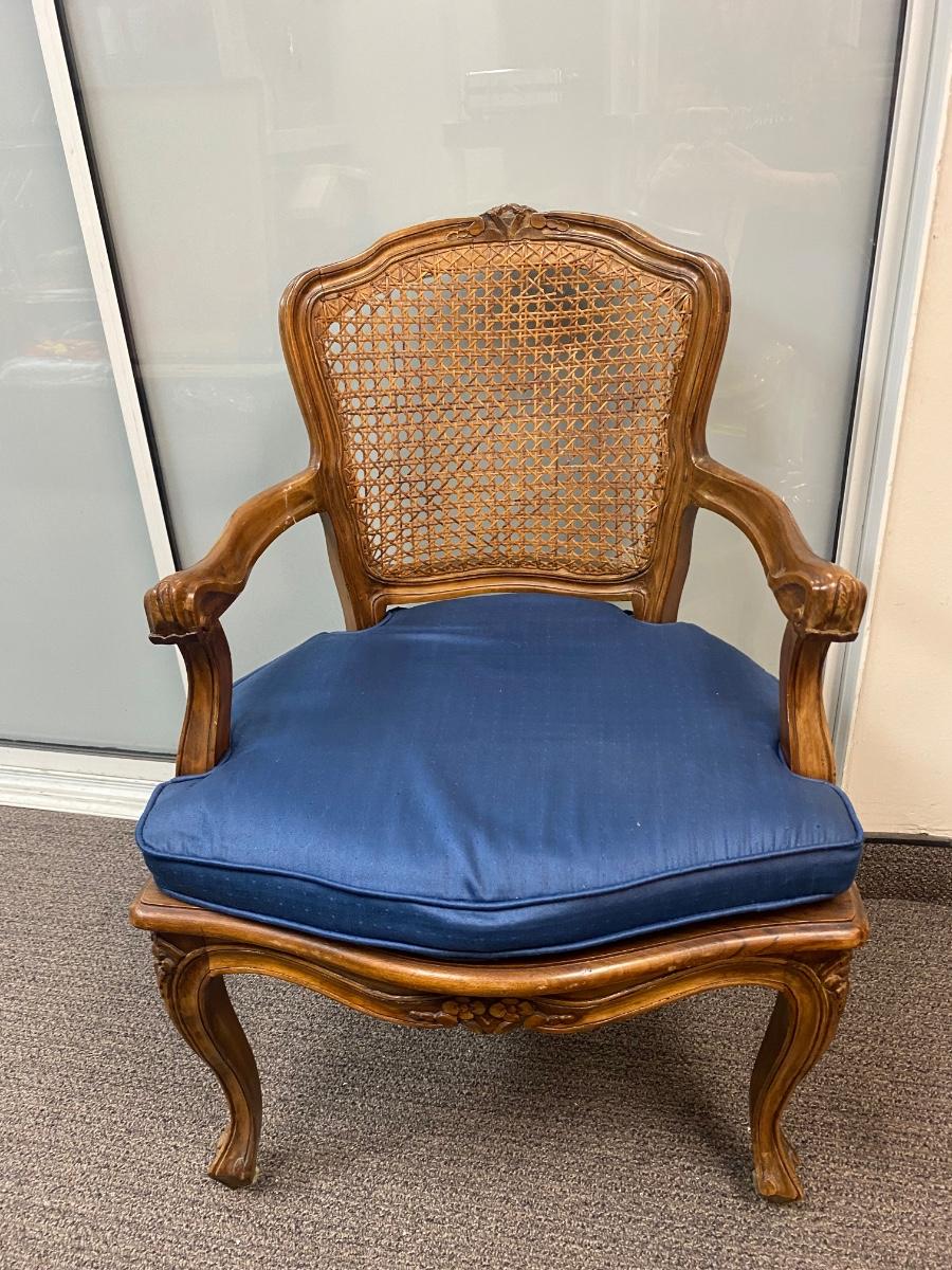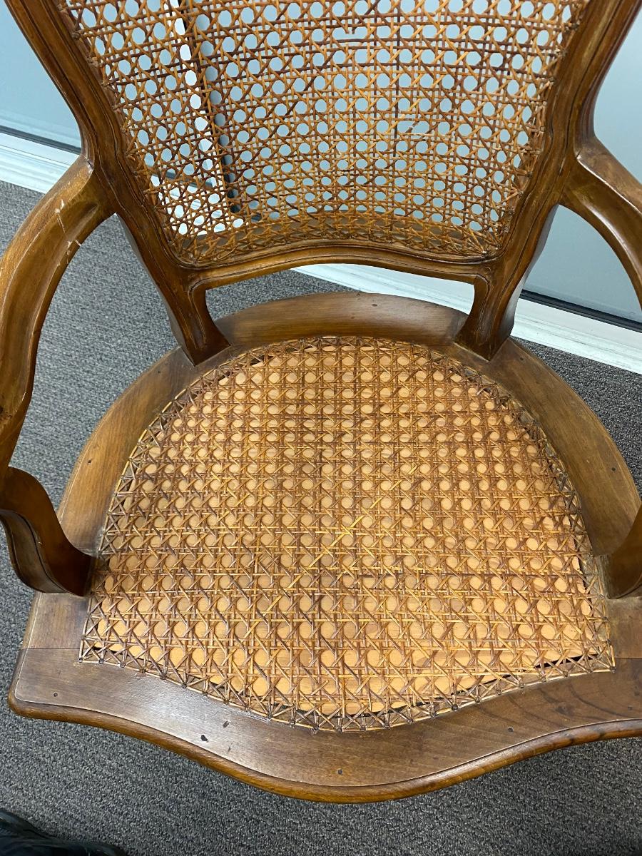 Vintage Retro Cane Back & Seat Armchair Captains Side Chair with Cushion. In vintage condition. there is two holes in cane back.