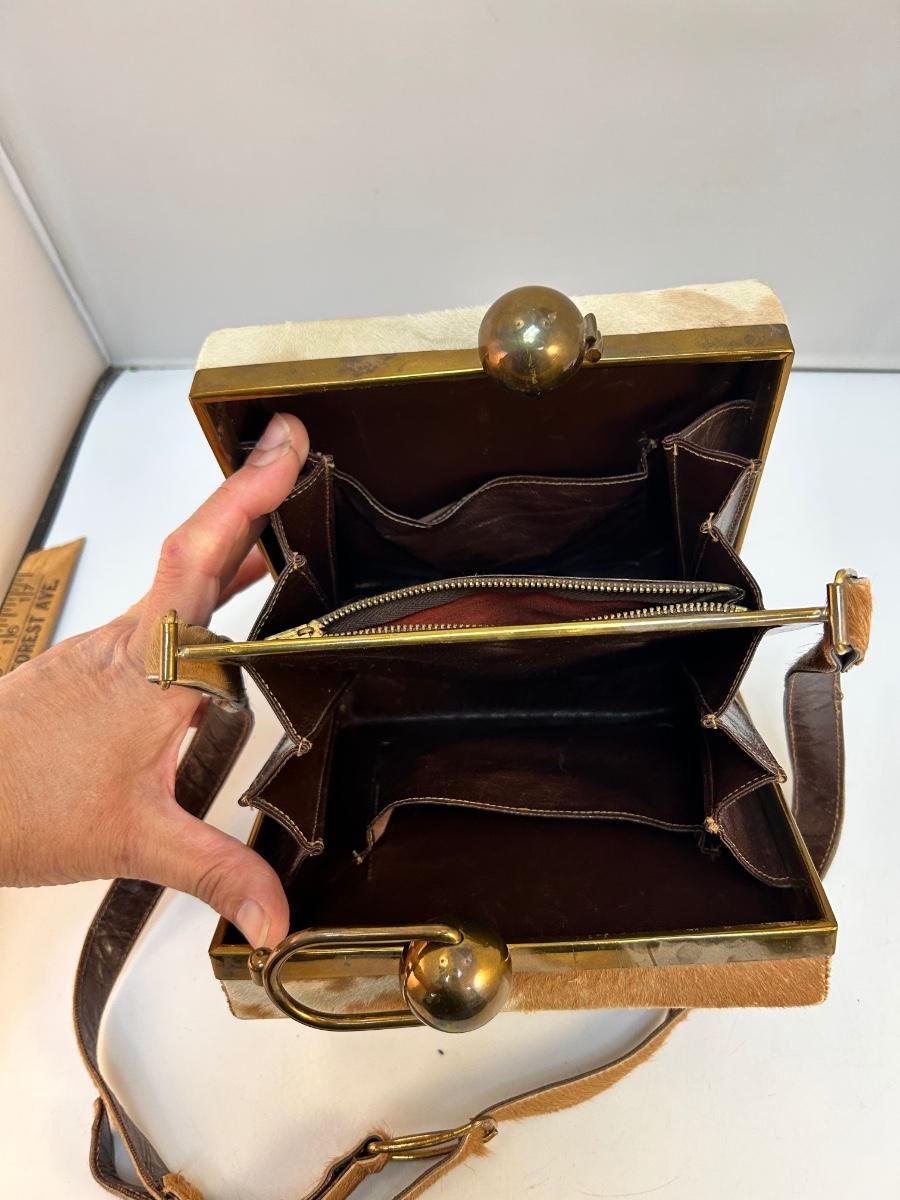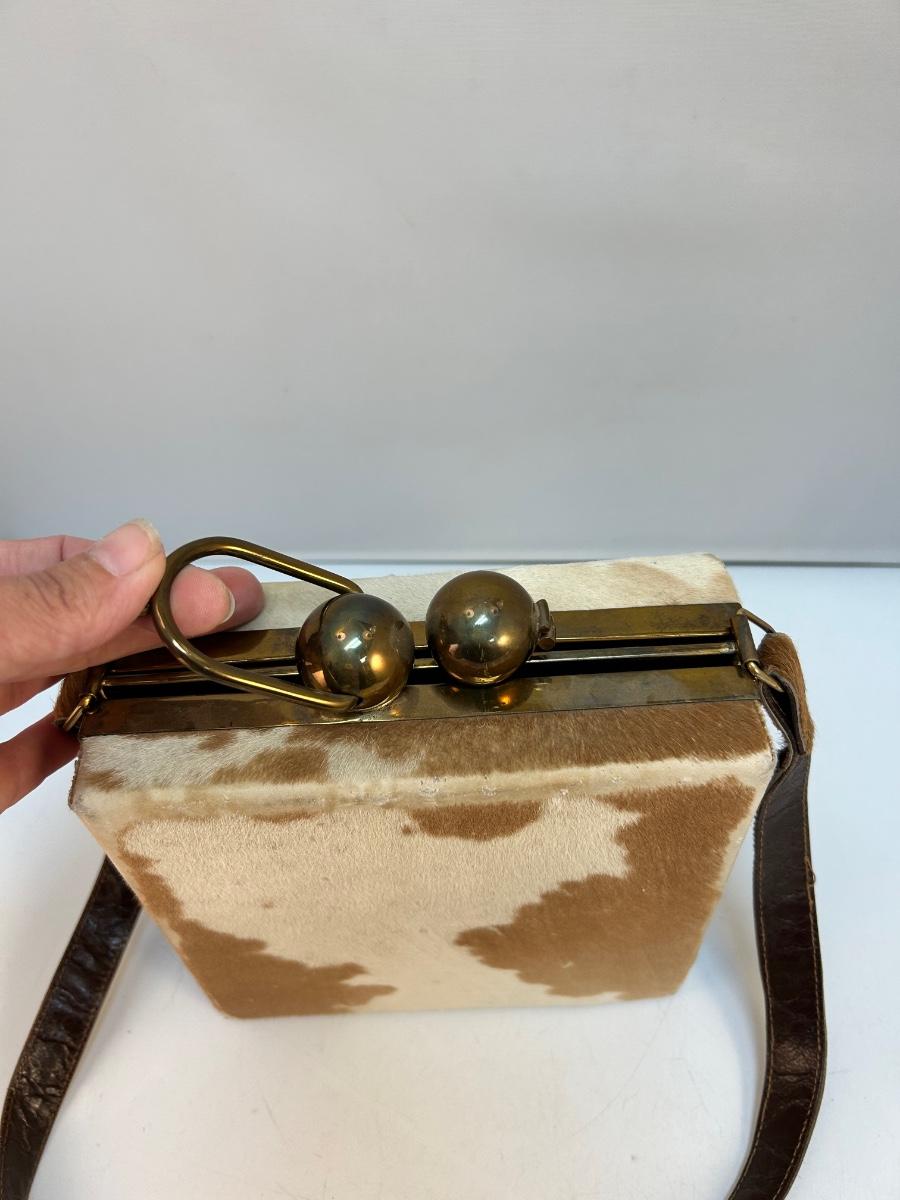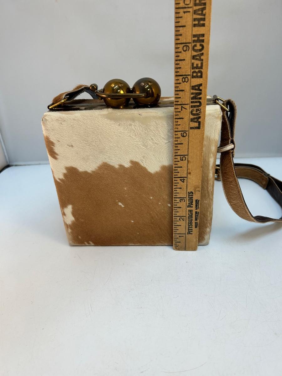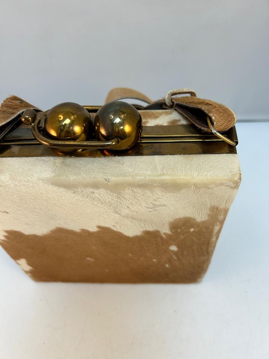 Vintage Cowhide Leather Box Purse with Brass Hardware. Great vintage MOD style. 7" box purse with tan and white cow hide leather outer. There is some wear to the fur along the edges more than body of purse. Dark interior with multiple pockets, zipper works nicely. Large brass knob hardware with flip latch close. No maker label or marking found.