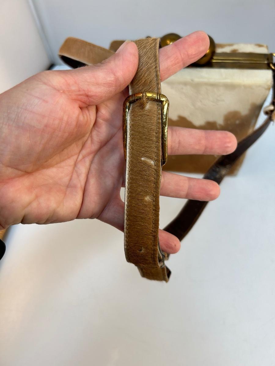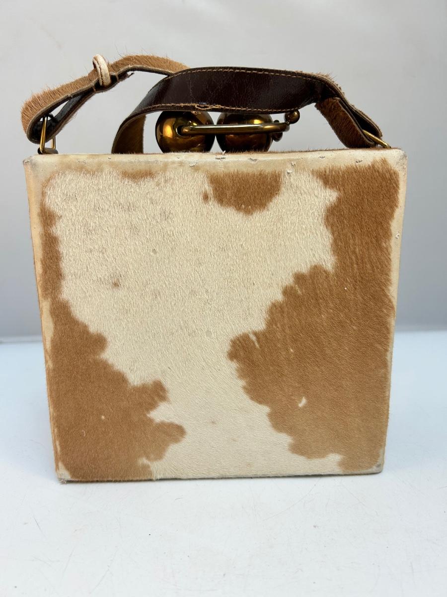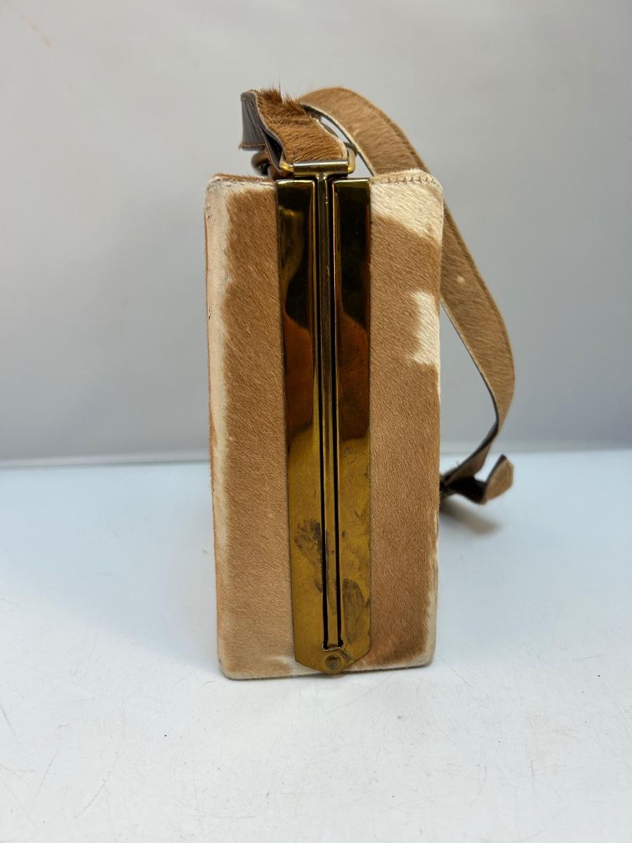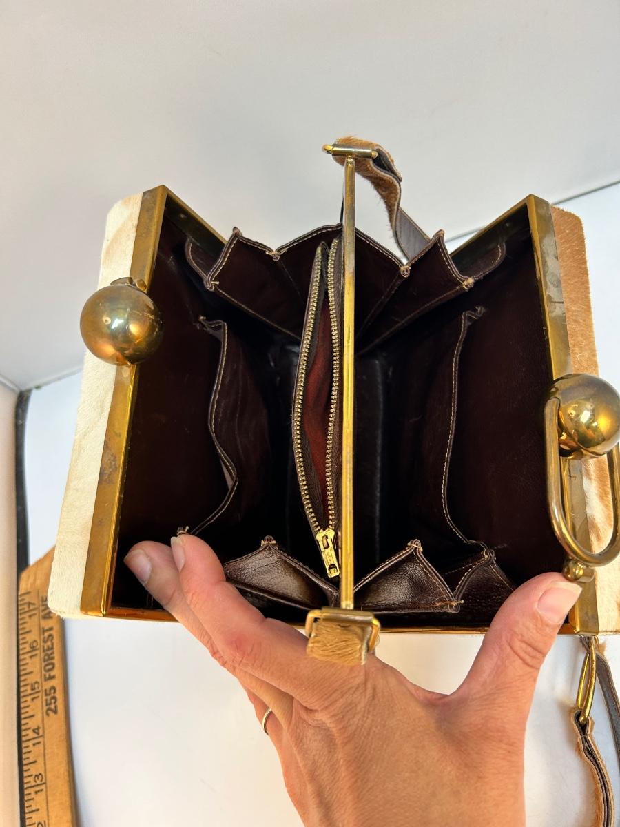 Vintage Cowhide Leather Box Purse with Brass Hardware. Great vintage MOD style. 7" box purse with tan and white cow hide leather outer. There is some wear to the fur along the edges more than body of purse. Dark interior with multiple pockets, zipper works nicely. Large brass knob hardware with flip latch close. No maker label or marking found.