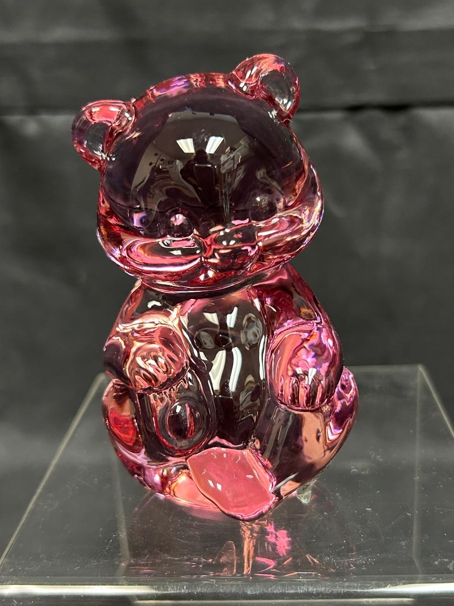 Pink Fenton Glass Teddy Bear Paperweight Figurine with Sticker. Just under 4" size. Has original Fenton sticker attached.