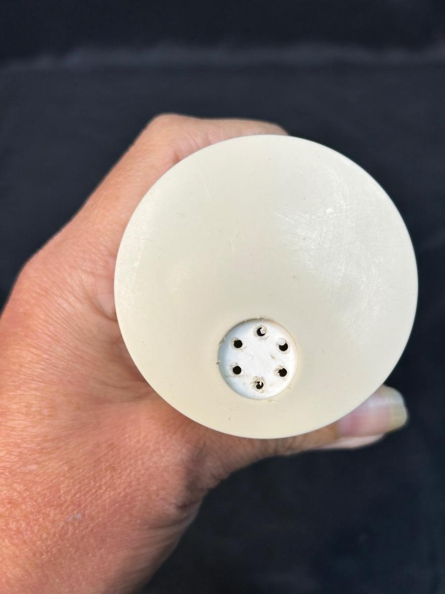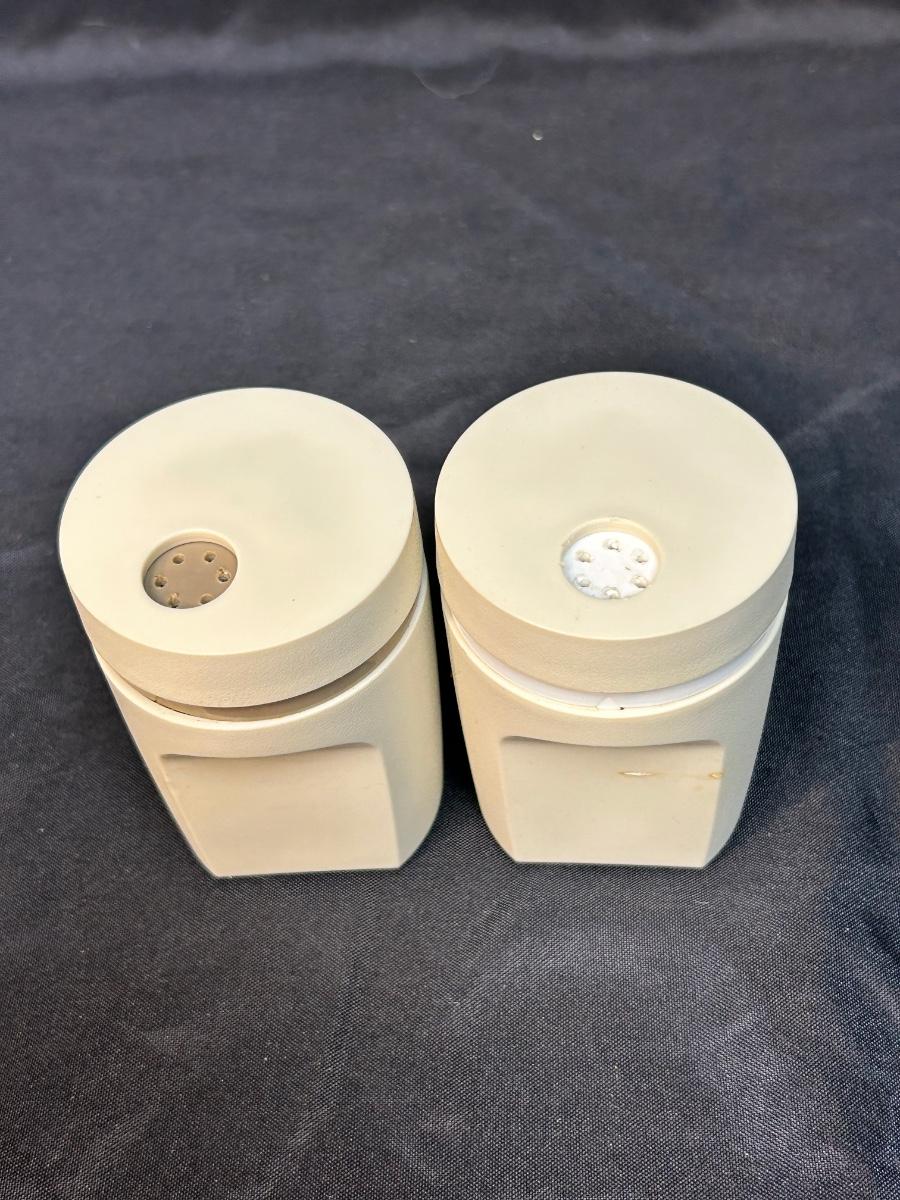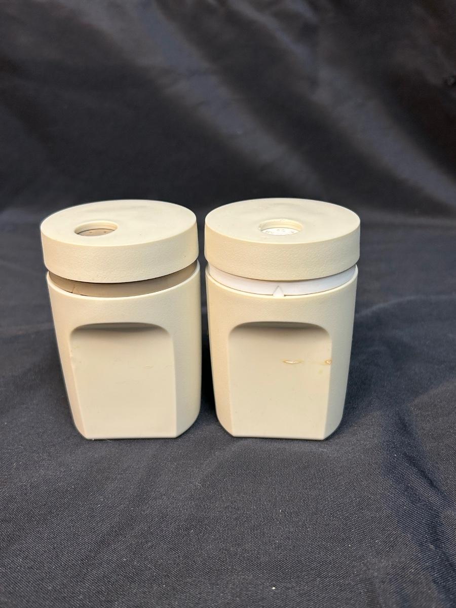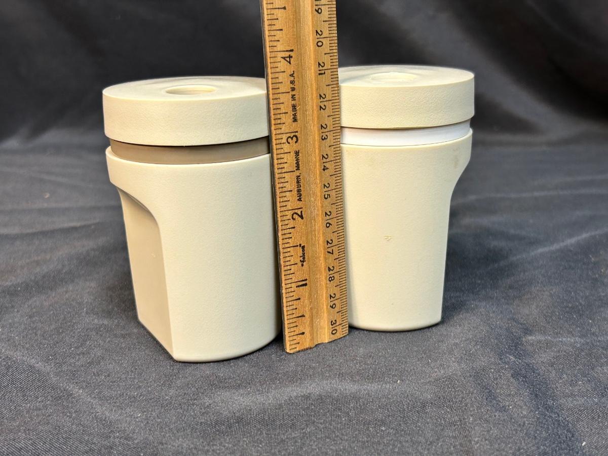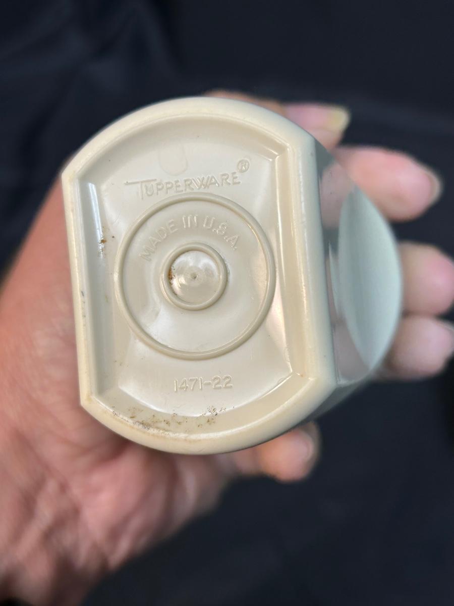 Retro Tupperware Plastic Salt and Pepper Shaker Set. In good used condition. The salt shaker top is kind of hard to turn open and close, may just need a good hot water soak.